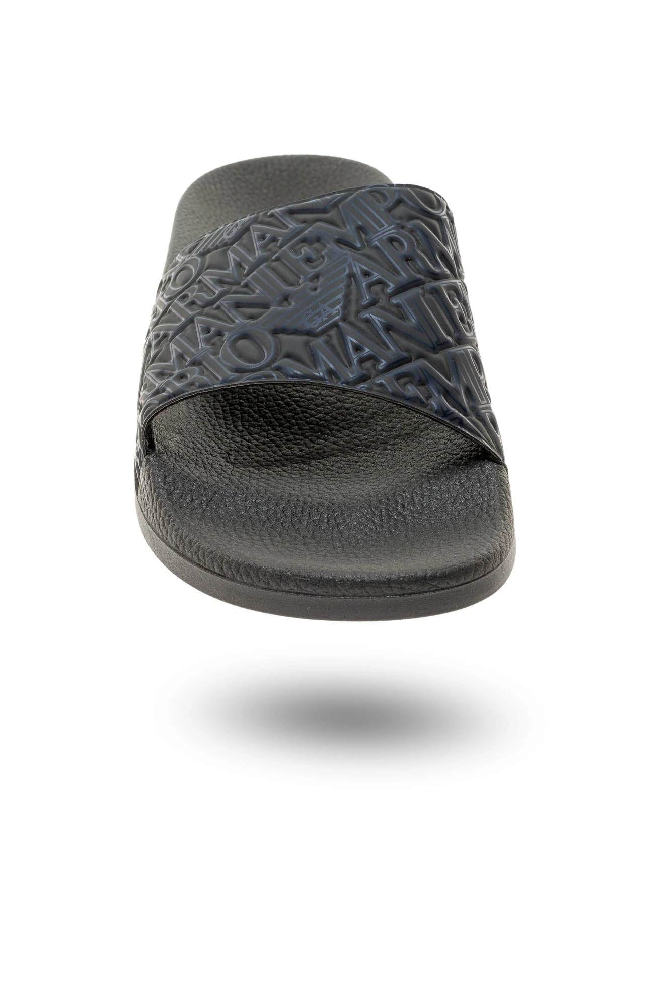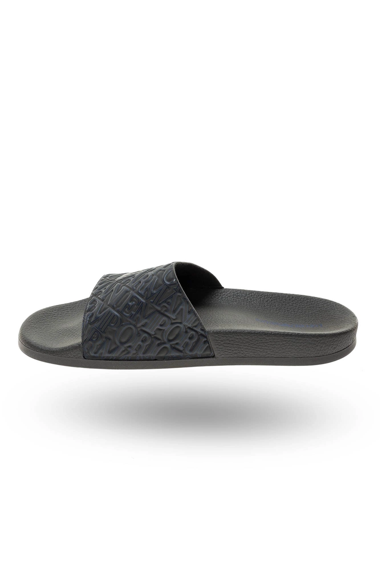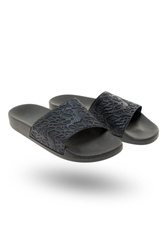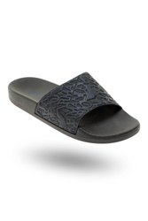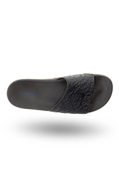 Klapki w kolorze czarnym. Wykonane z materiału syntetycznego. Górna część w drobne tłoczenia w postaci logo marki, z delikatnymi niebieskimi liniami. Wyprofilowana, porowata wkładka. Podeszwa o grubości 2,5 cm.