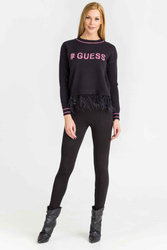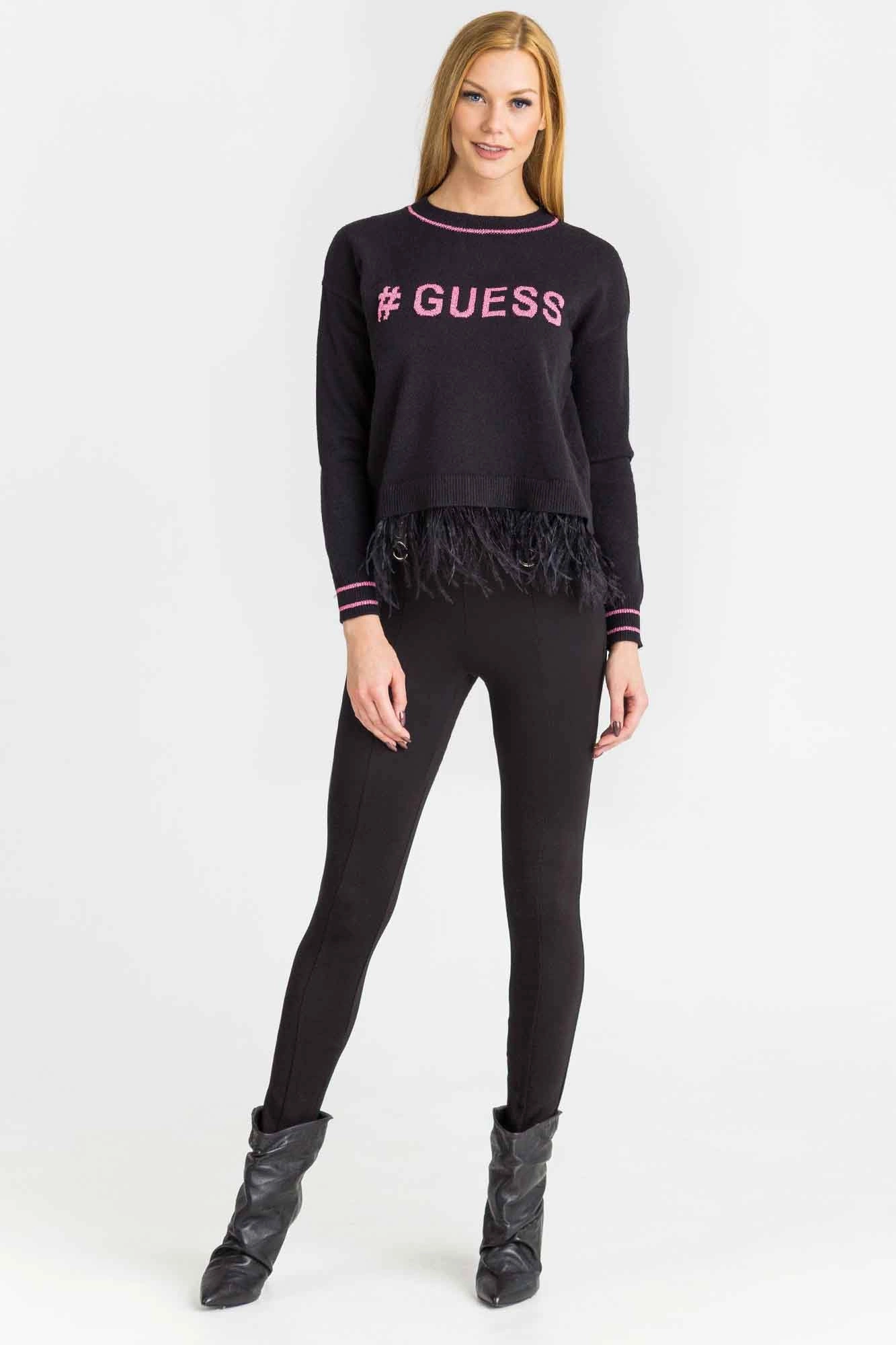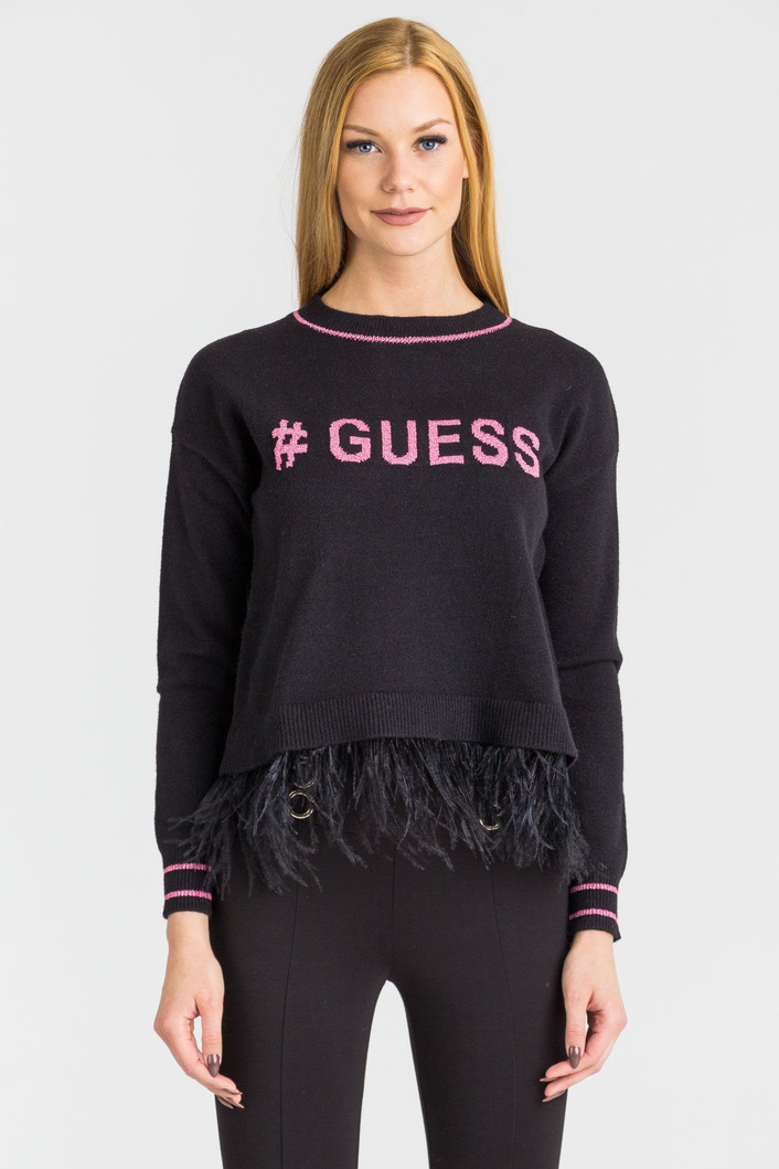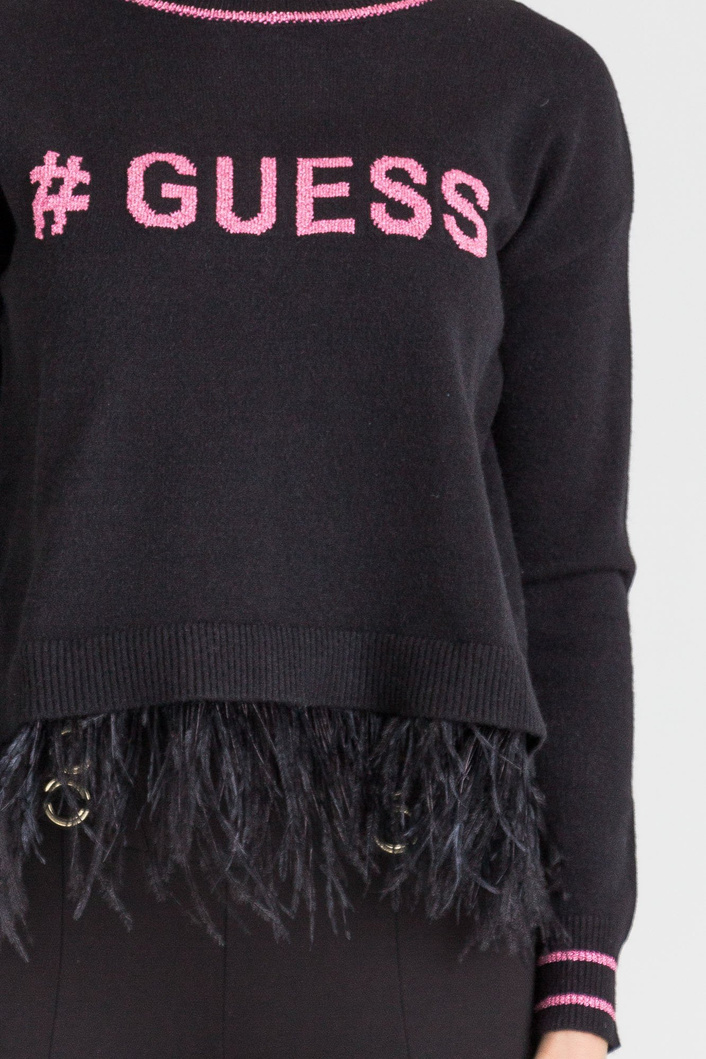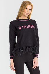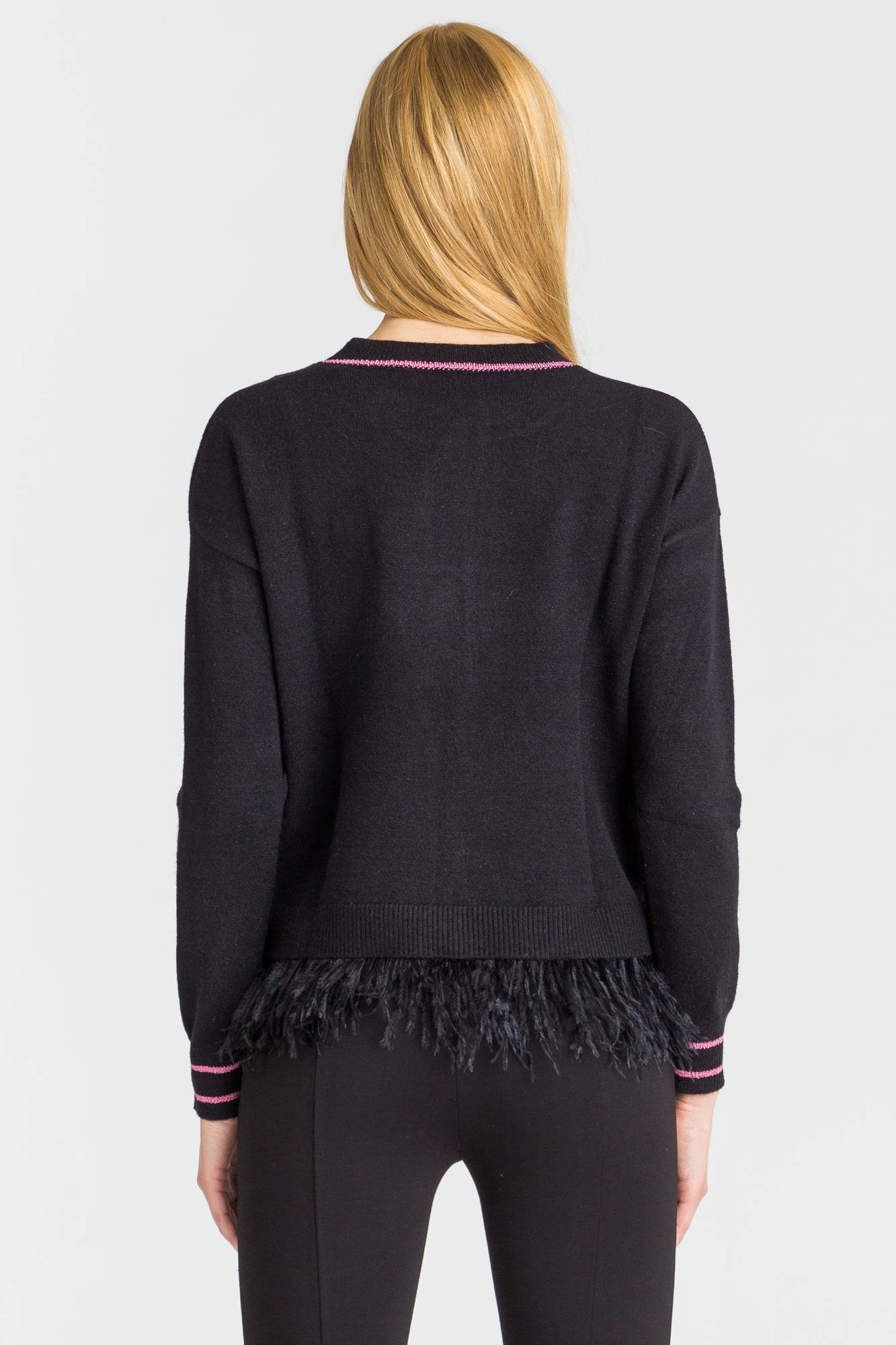 Sweter w czarnym kolorze. Dekolt typu o-neck. Rękawy, dekolt i dół wykończone ściągaczem. Z przodu różowy wzór logo marki, przetykany błyszczącą nicią. Dół zakończony odpinanymi piórami w czarnym kolorze. Sweter wykonany z wysokiej jakości dzianiny. Miękki i przyjemny w dotyku.