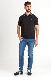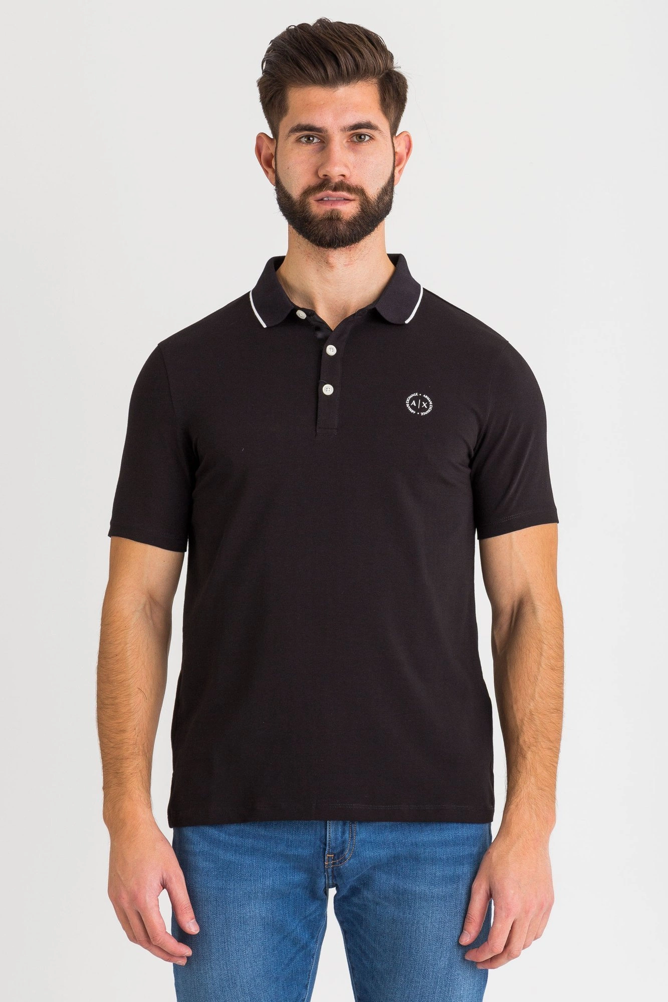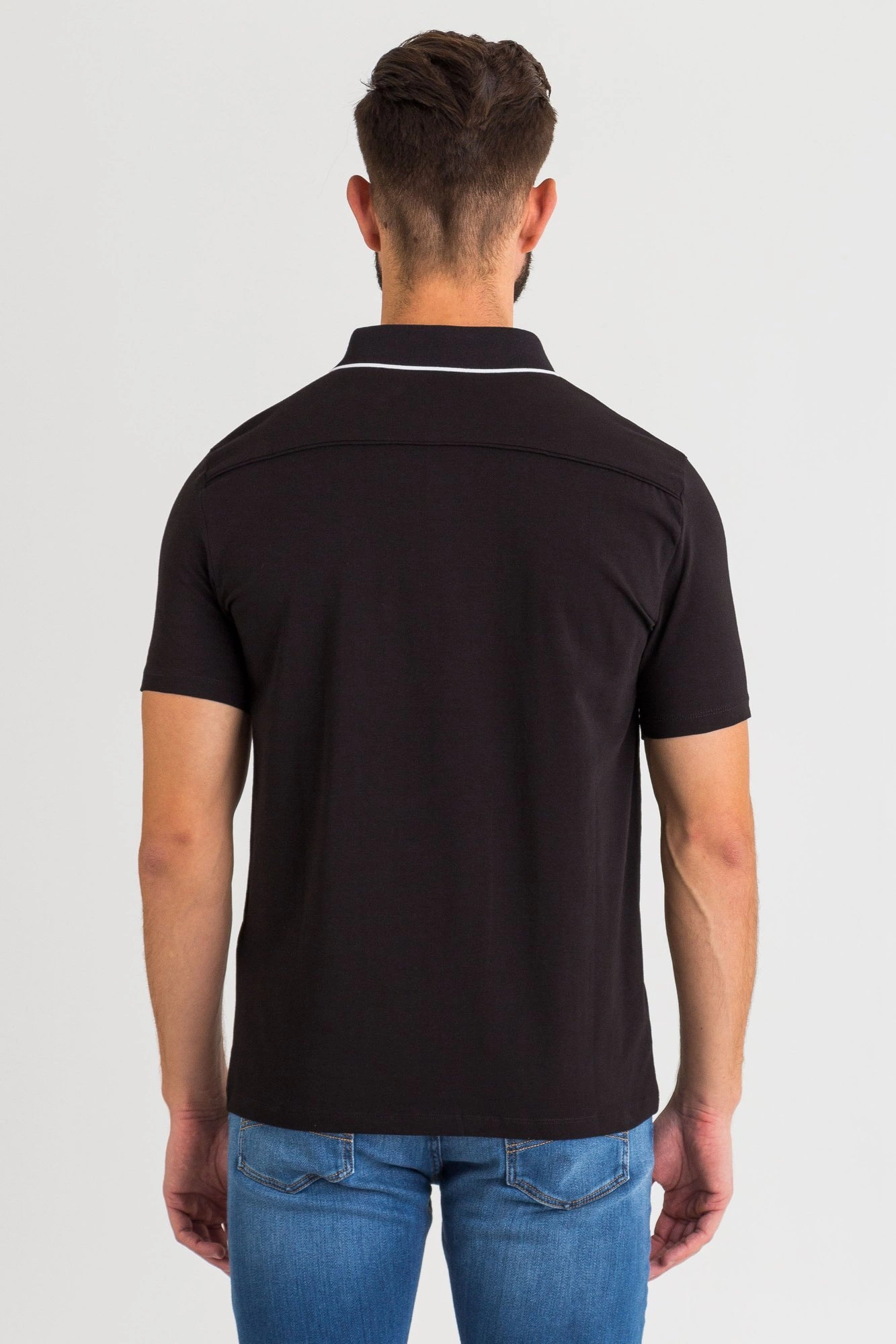 Polo w kolorze czarnym o prostym fasonie. Zapinane na trzy białe guziki, sygnowane logo marki. Wykończenie kołnierzyka w kolorze białym. Z przodu biały, okrągły nadruk logo marki. Polo wykonane z wysokiej jakości bawełny z domieszką elastanu. Komfortowe, przyjemne w dotyku i lekko elastyczne.
