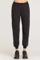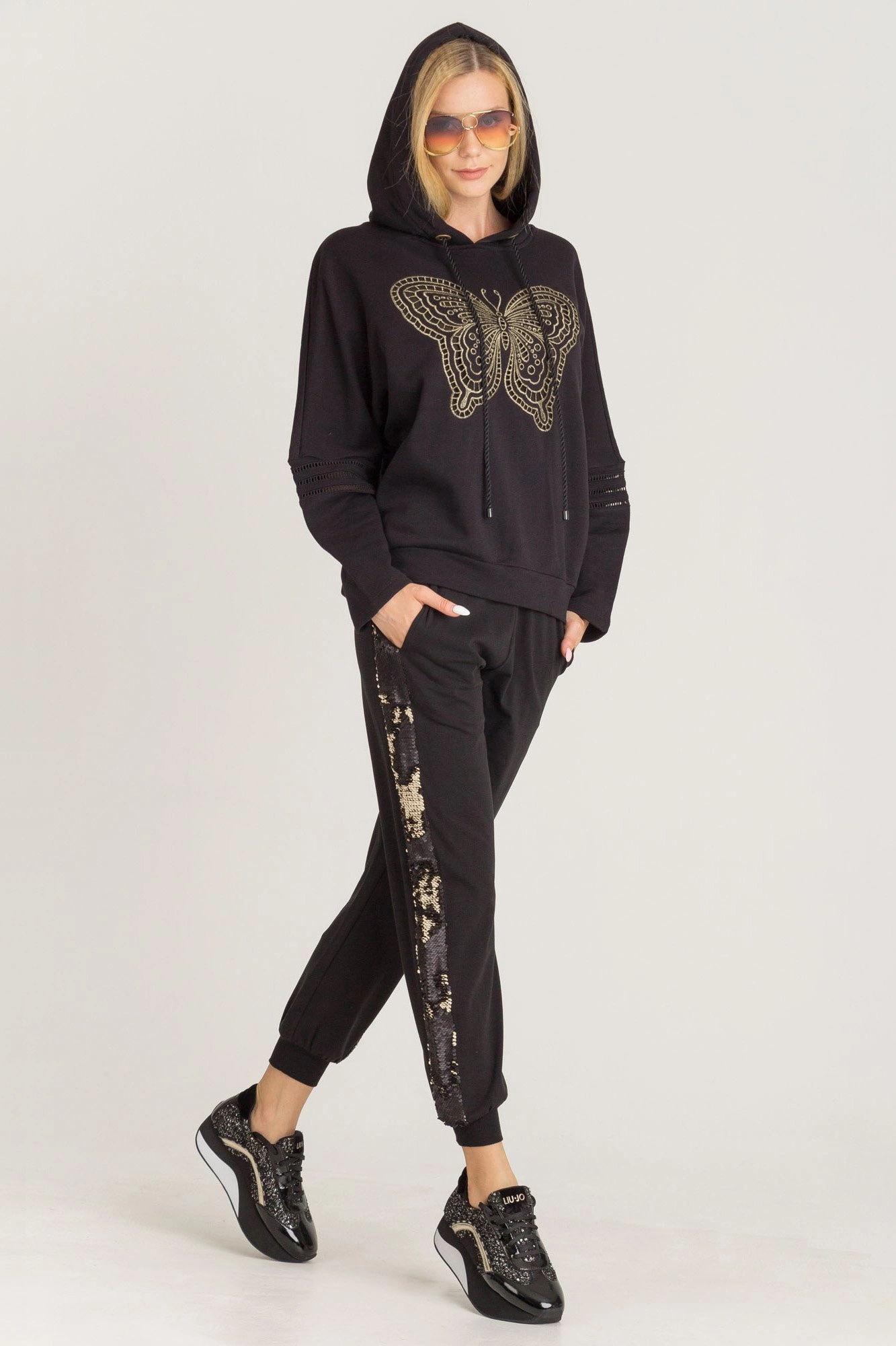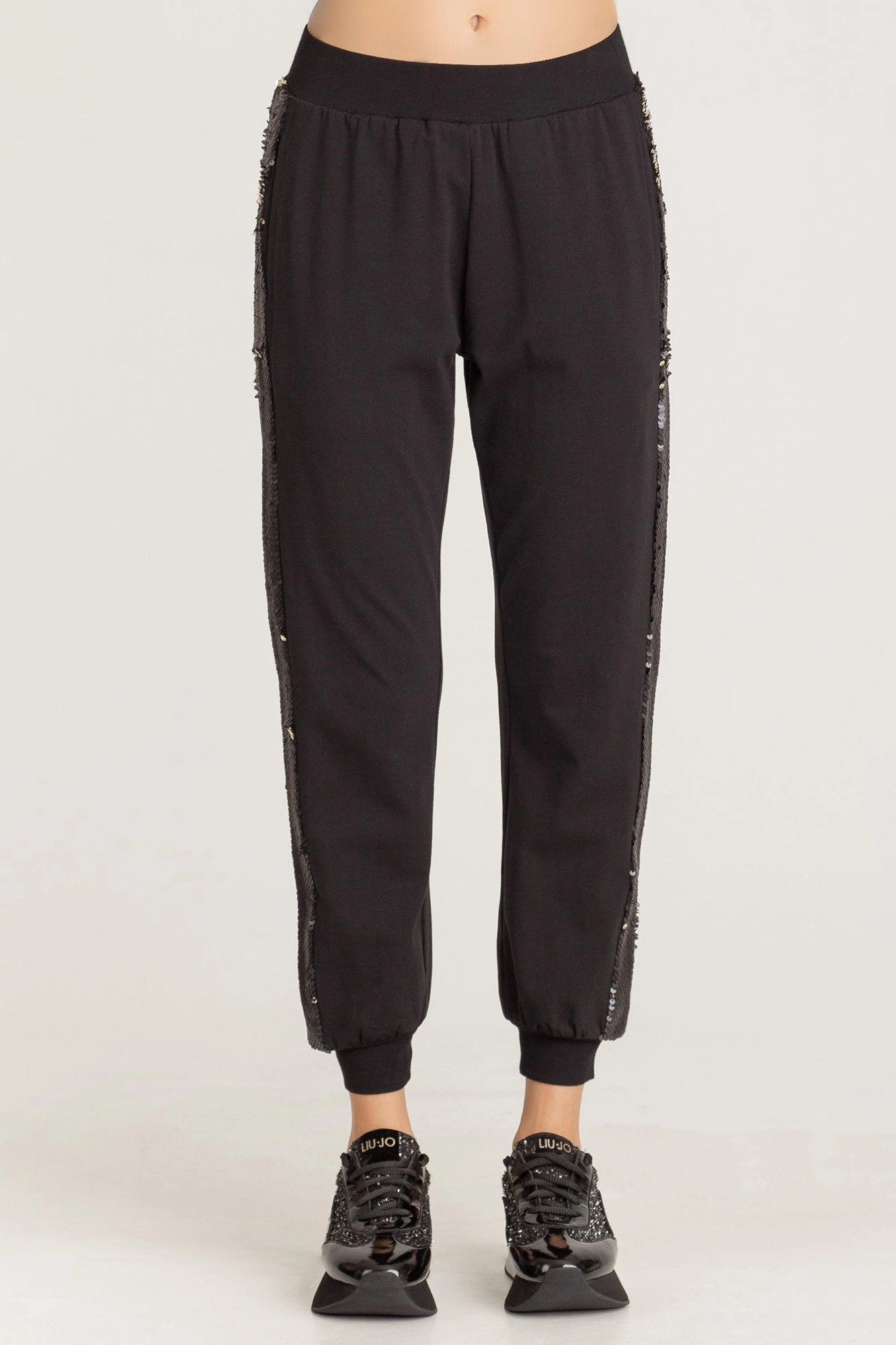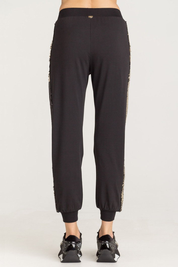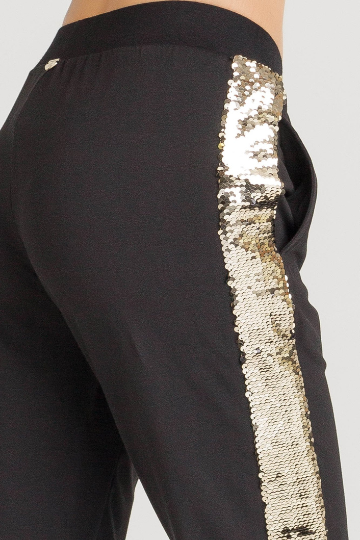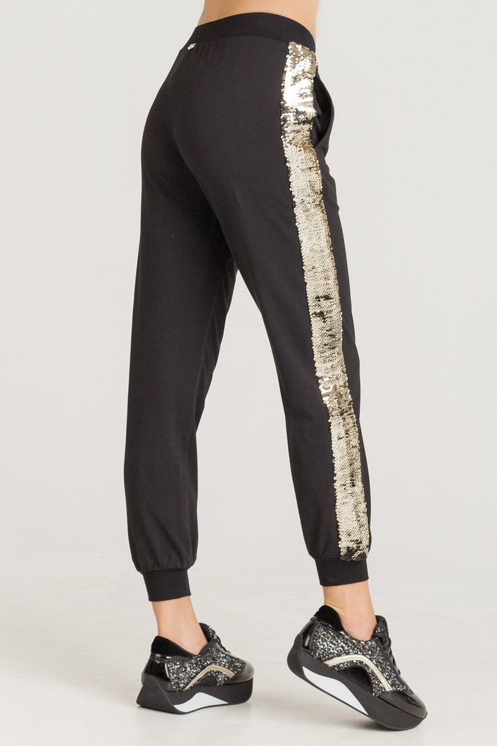 Czarne spodnie o prostym kroju. Z przodu dwie niezapinane kieszenie. Na nogawkach aplikacja z czarno-złotych cekinów. Z tyłu złota aplikacja z logo marki. Nogawki wykończone ściągaczem. Wykonane z wysokiej jakości bawełny z dodatkiem elastanu. Wygodne i miękkie.