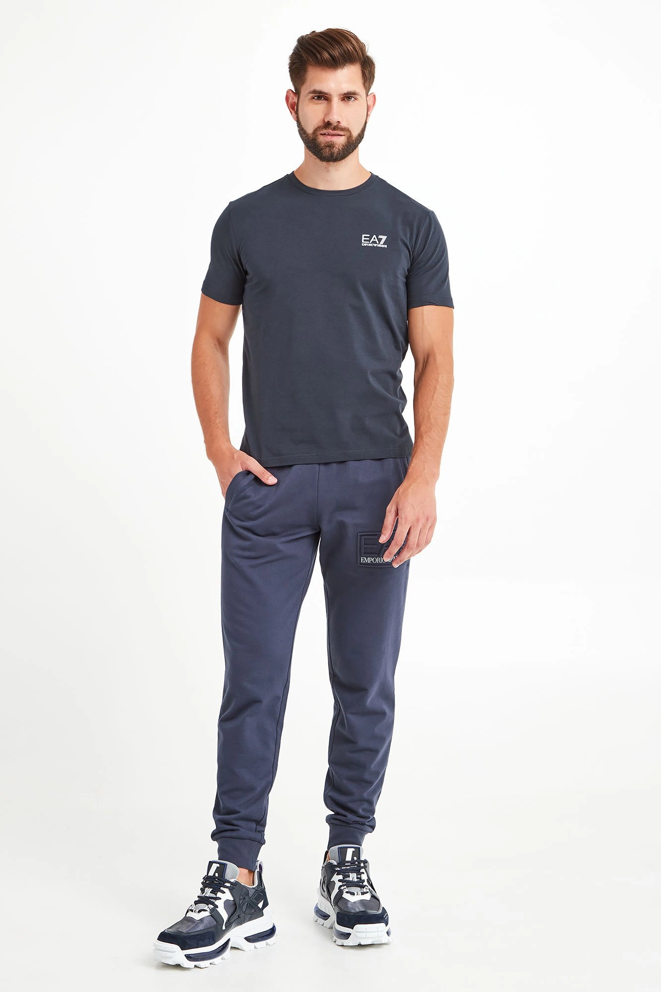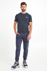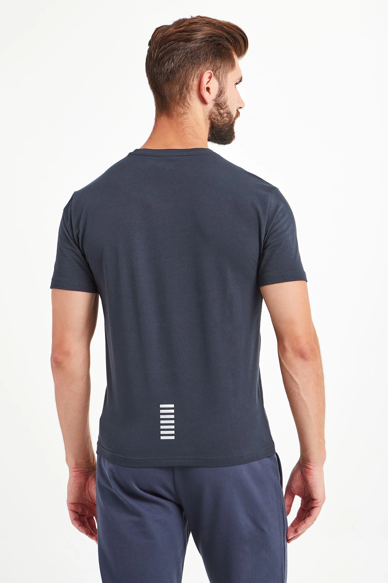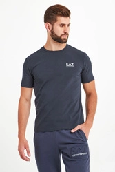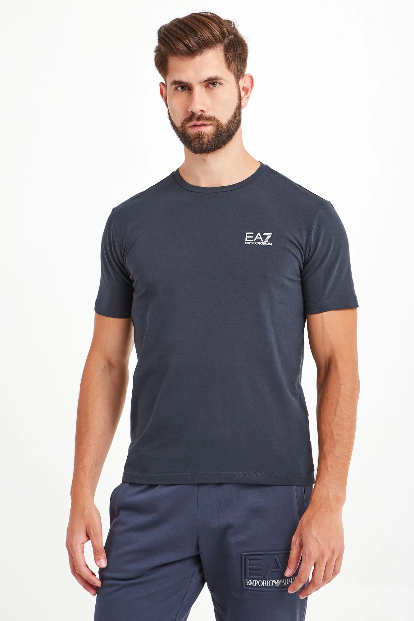 Granatowy t-shirt o prostym kroju. Z przodu niewielki, biały nadruk z logo marki. Dekolt typu o-neck. T-shirt wykonany z najwyższej jakości bawełny z dodatkiem elastanu. Przewiewny, bardzo komfortowy i ponadczasowy.