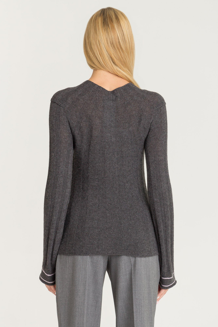 Szary sweter o dopasowanym fasonie. Dekolt typu o-neck. Rękawy wykończone czarno-różowym wzorem z logo marki. Na całości ozdobny splot. Wykonany z wysokiej jakości dzianiny z dodatkiem wełny i kaszmiru. Ciepły i wygodny.