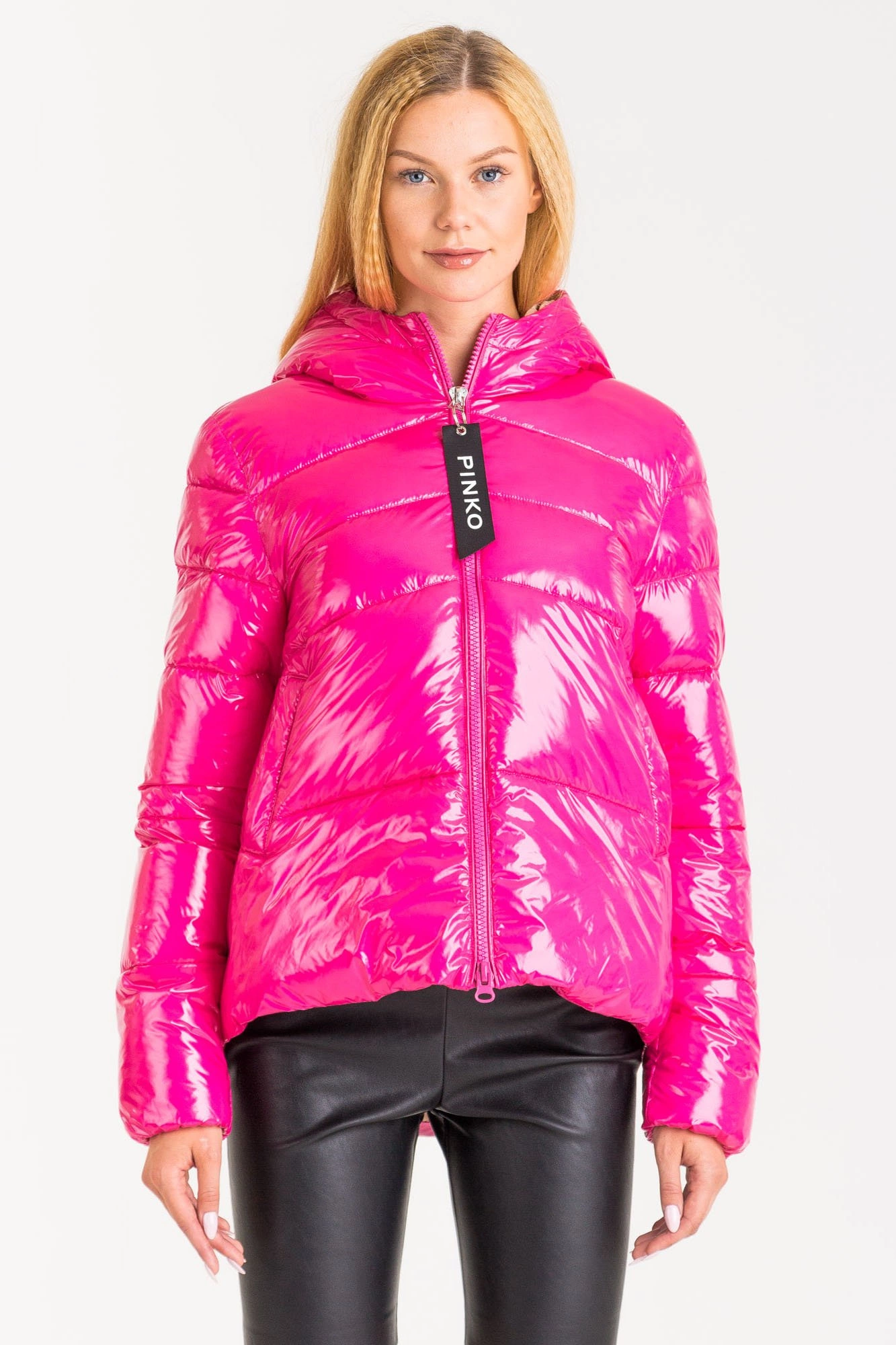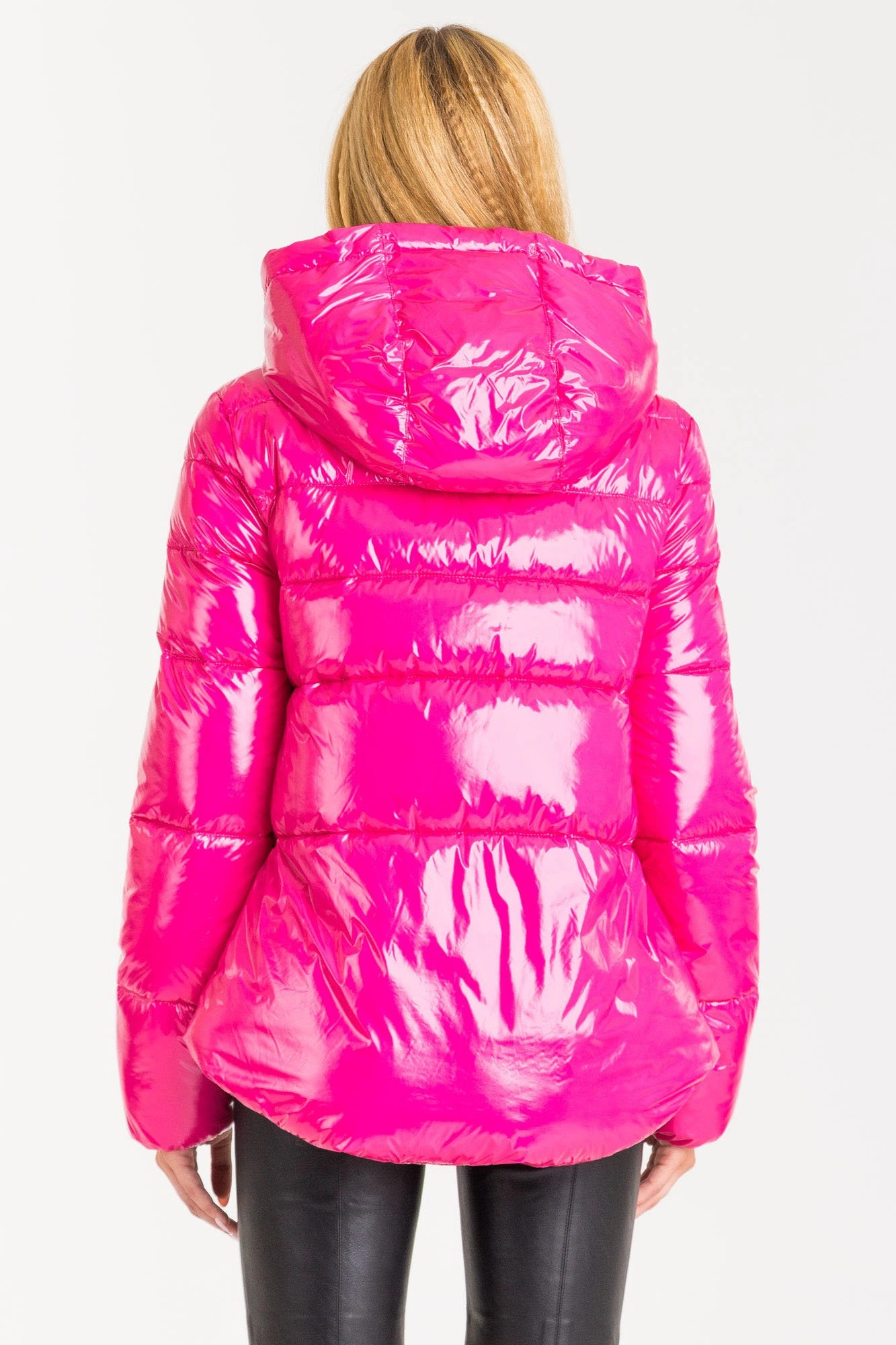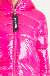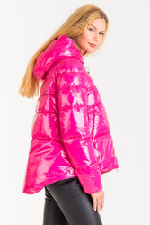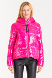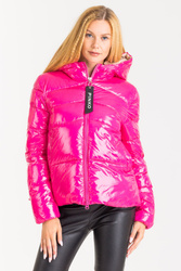 Pikowana kurtka z kapturem w różowym kolorze. Zapinana na dwukierunkowy zamek w tym samym kolorze z czarną zawieszką. Z przodu dwie, zapinane na srebrne napy, kieszenie. Rękawy wykończone ściągaczem. Dół regulowany za pomocą czarnych troczków. Podszewka w beżowym kolorze, ze srebrnym nadrukiem logo marki. Wykonana z wysokiej jakości materiałów. Lekka i ciepła.