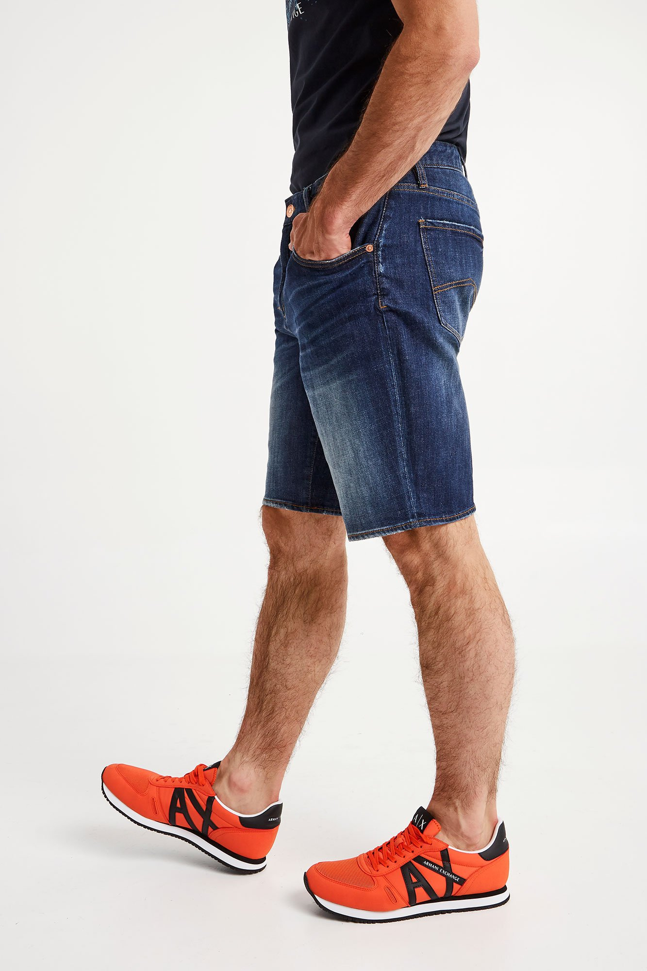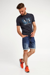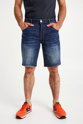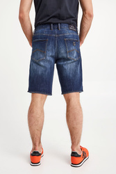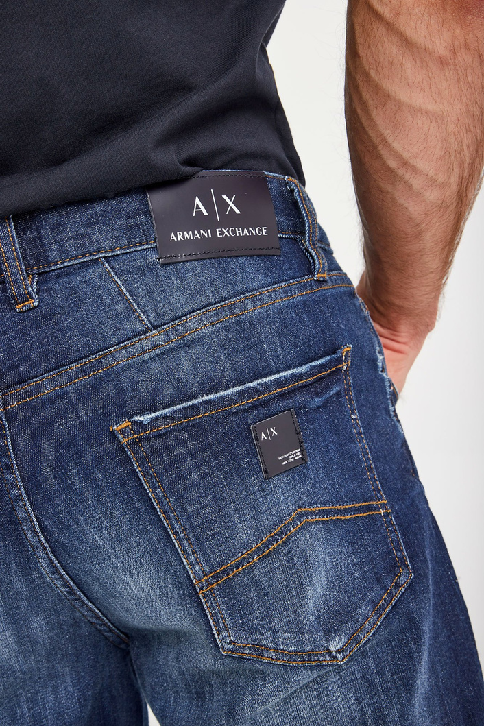 Spodenki jeansowe marki Armani Exchange w granatowym kolorze. Fason slim. Zapinane za pomocą zamka i miedzianego, sygnowanego guzika. Model z pięcioma kieszeniami. W pasie szlufki. Na całości przetarcia. Z tyłu, na pasie czarna, ozdobna aplikacja z logo marki. Wykonane z bawełnianej tkaniny z domieszką elastanu.