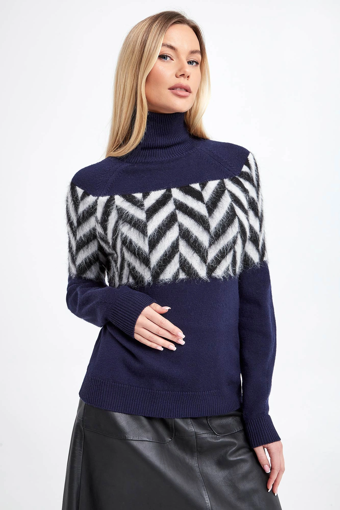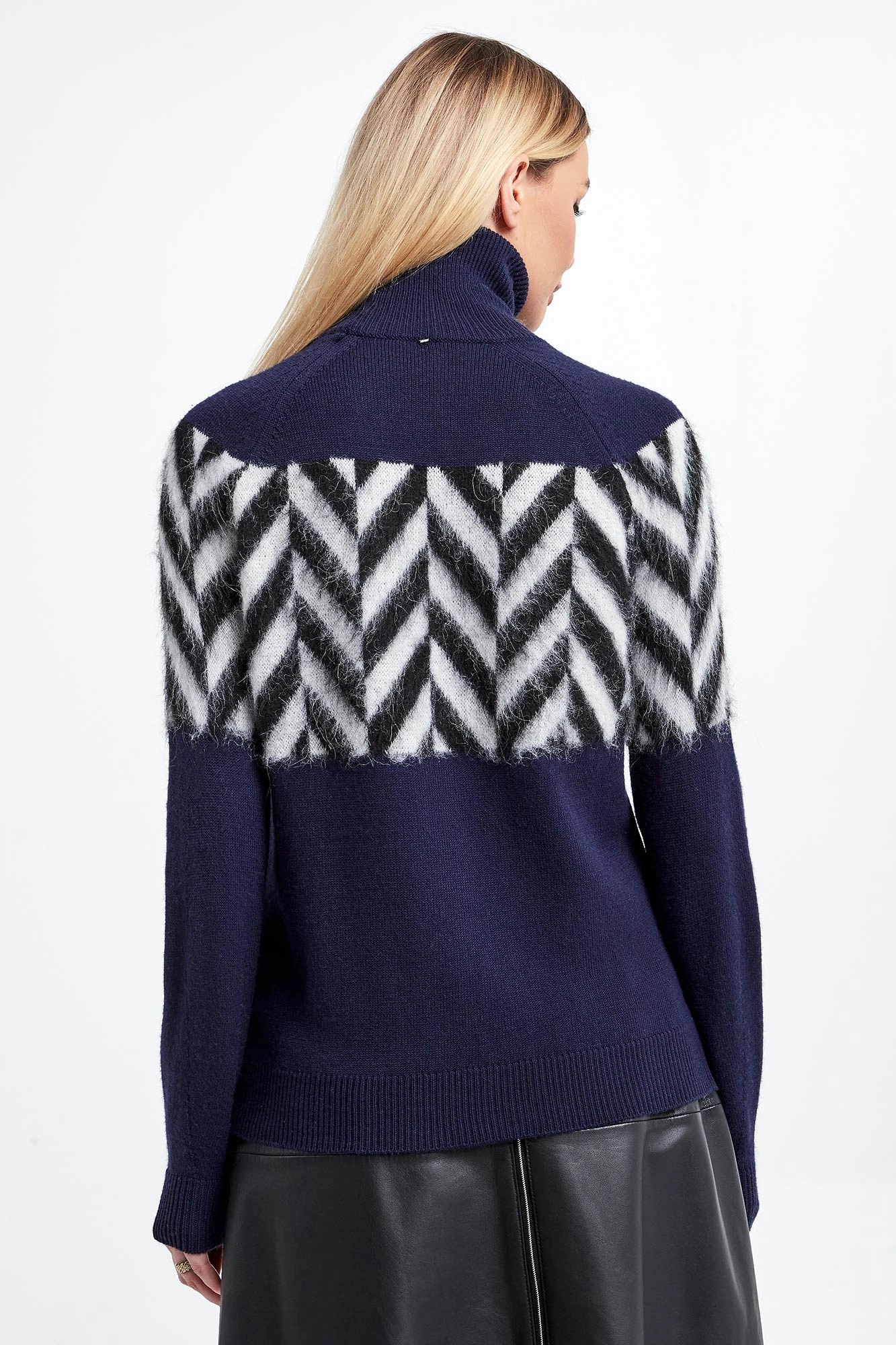 Sweter marki Sportmax Code w kolorze granatowym. Dekolt wykończony prążkowanym golfem. Na wysokości piersi pas z futerkowego materiału w czarno-biały, geometryczny wzór. Dół i rękawy wykończone prążkowanymi ściągaczami. Fason typu regular.