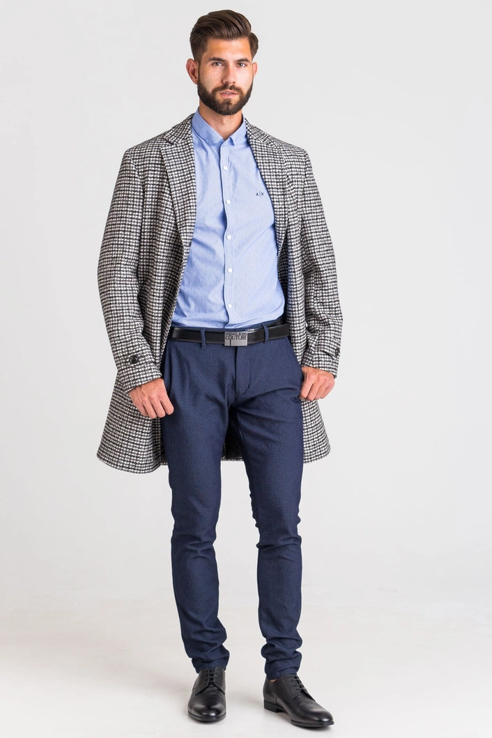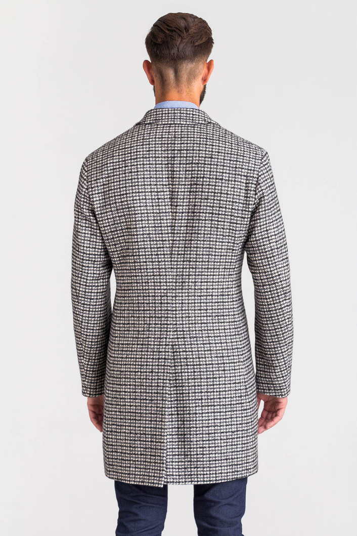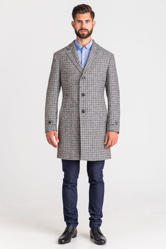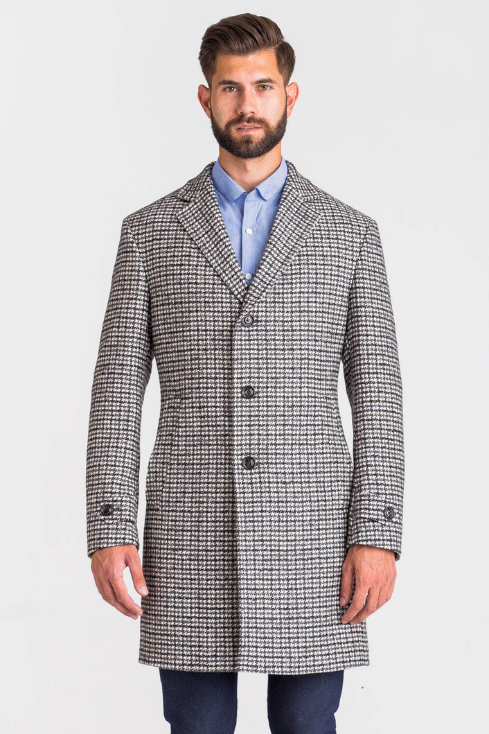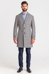 Płaszcz w czarno - białym kolorze, we wzór w pepitkę. Zapinany na czarne guziki, sygnowane logo marki. Z przodu dwie, niezapinane kieszenie. Pikowana podszewka w czarnym kolorze. Dwie wewnętrzne kieszenie, w tym jedna zapinana na guzik. Płaszcz wykonany z wysokiej jakości materiałów z dodatkiem żywej wełny. Przyjemny w dotyku i wygodny.