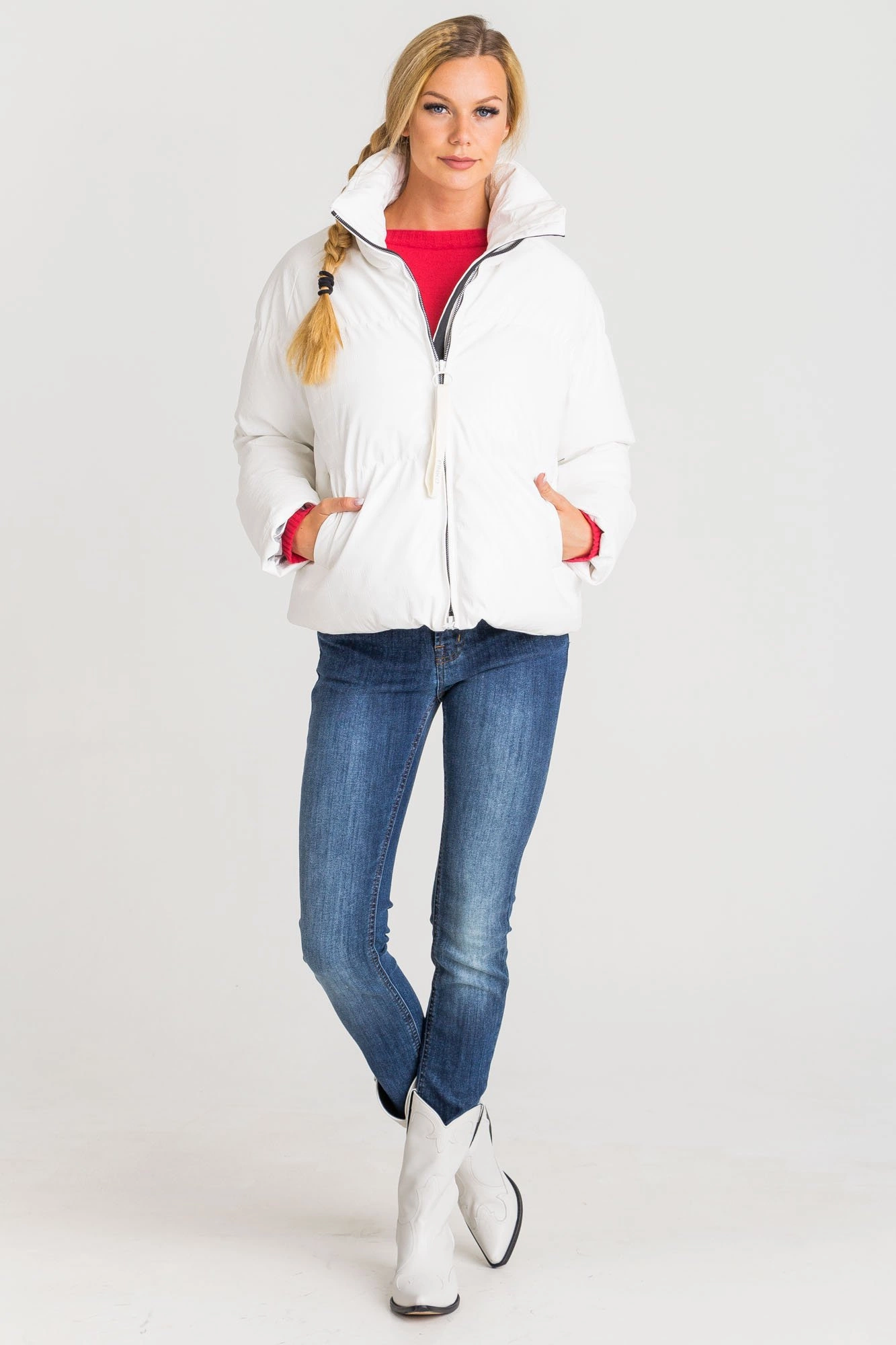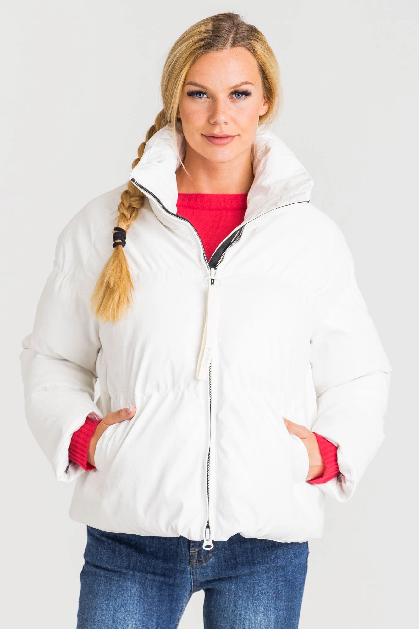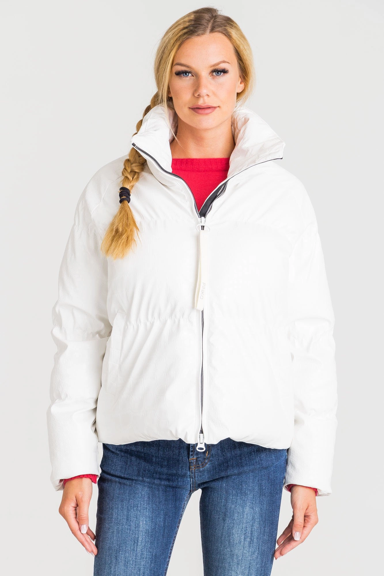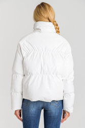 Kurtka pikowana w kolorze białym. Fason oversize. Zapinana na dwukierunkowy zamek, z ozdobną zawieszką z logo marki. Na całości ozdobne tłoczenia. Z przodu dwie kieszenie, zapinane na napy. Dół regulowany za pomocą troczków. Kurtka wykonana z wysokiej jakości materiałów. Podszewka gładka, w kolorze srebrnym.
