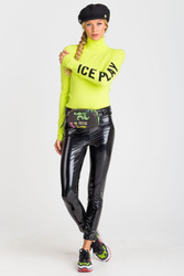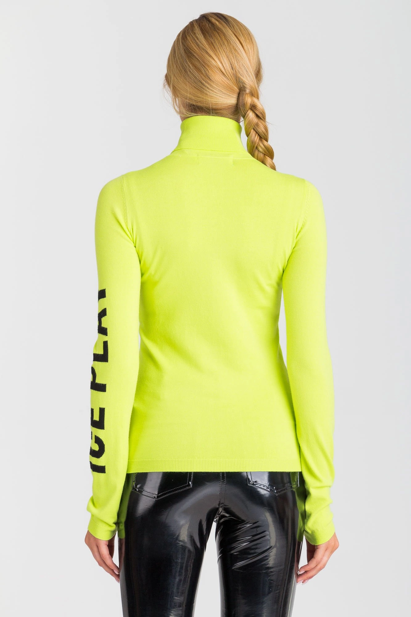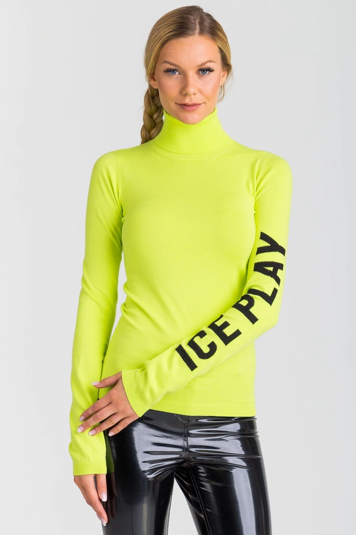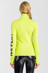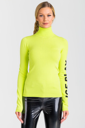 Golf w limonkowym kolorze o dopasowanym fasonie. Dekolt, rękawy i dół wykończone ściągaczem. Na rękawie czarny wzór z logo marki. Wykonany z wysokiej jakości dzianiny.