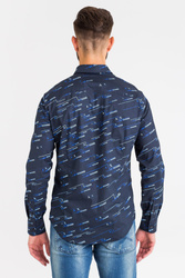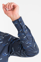 Koszula w granatowym kolorze, tkana we wzór logo i nazwy marki w odcieniach niebieskiego. Kołnierzyk typu włoskiego. Zapinana na granatowe guziki sygnowane logo marki. Mankiety zaokrąglone, zapinane na jeden guzik. Koszula wykonana z wysokiej jakości bawełny z domieszką elastanu.