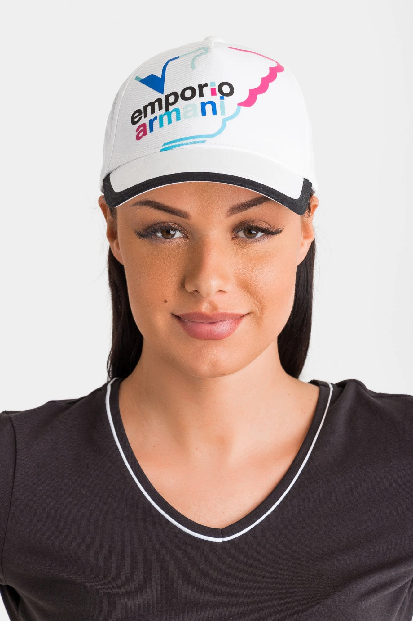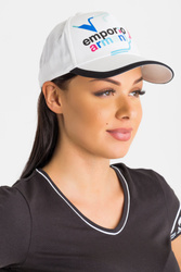 Biała czapka z daszkiem. Z przodu wielokolorowe logo i nazwa marki. Regulowana z tyłu przy pomocy ściągacza. Wykonana z wysokiej jakości bawełny. Lekka i wygodna.
