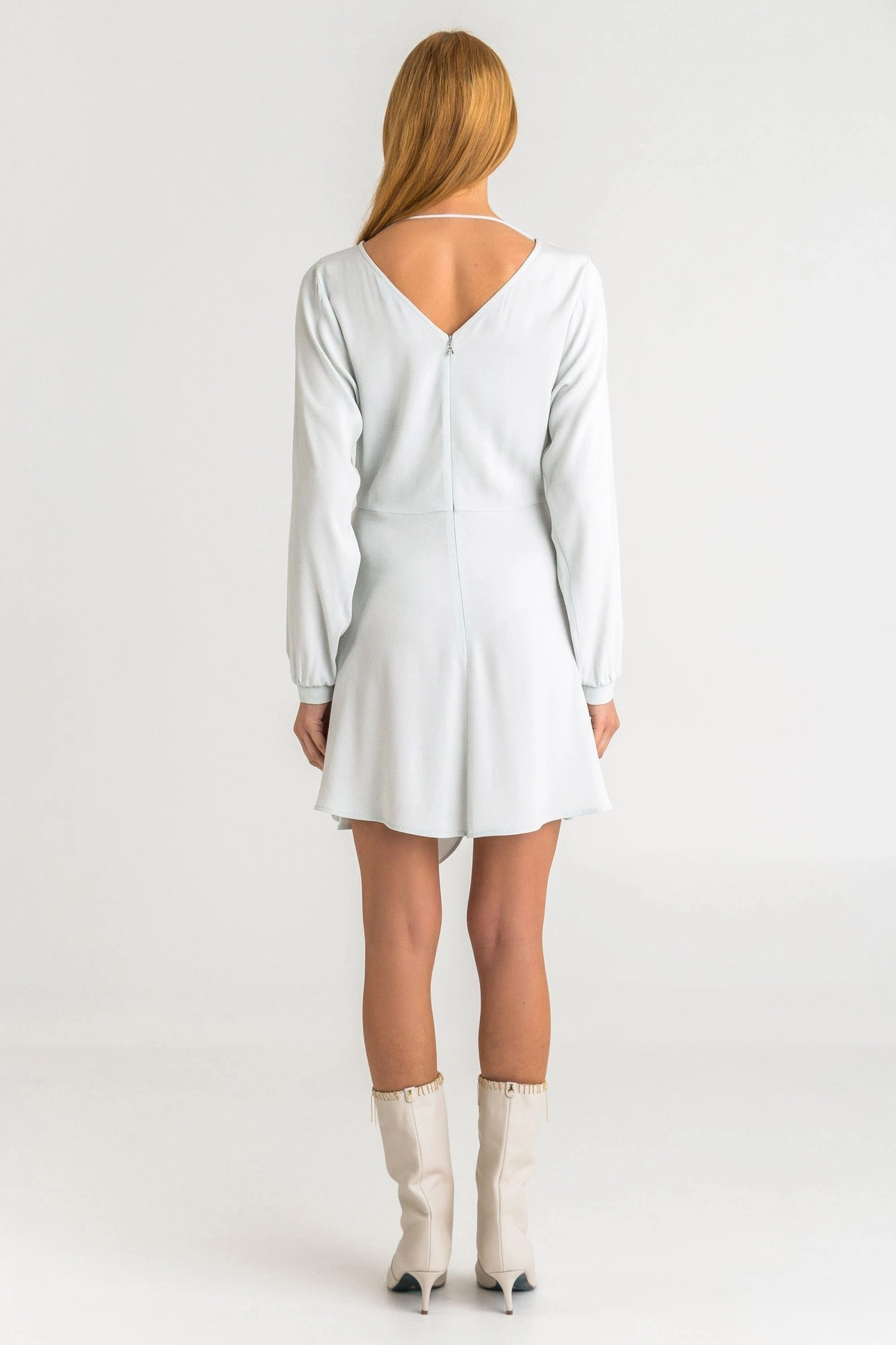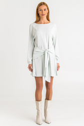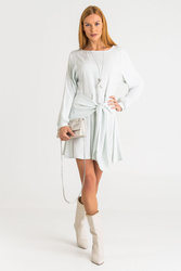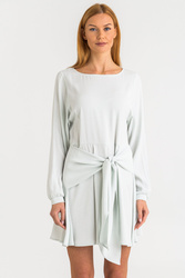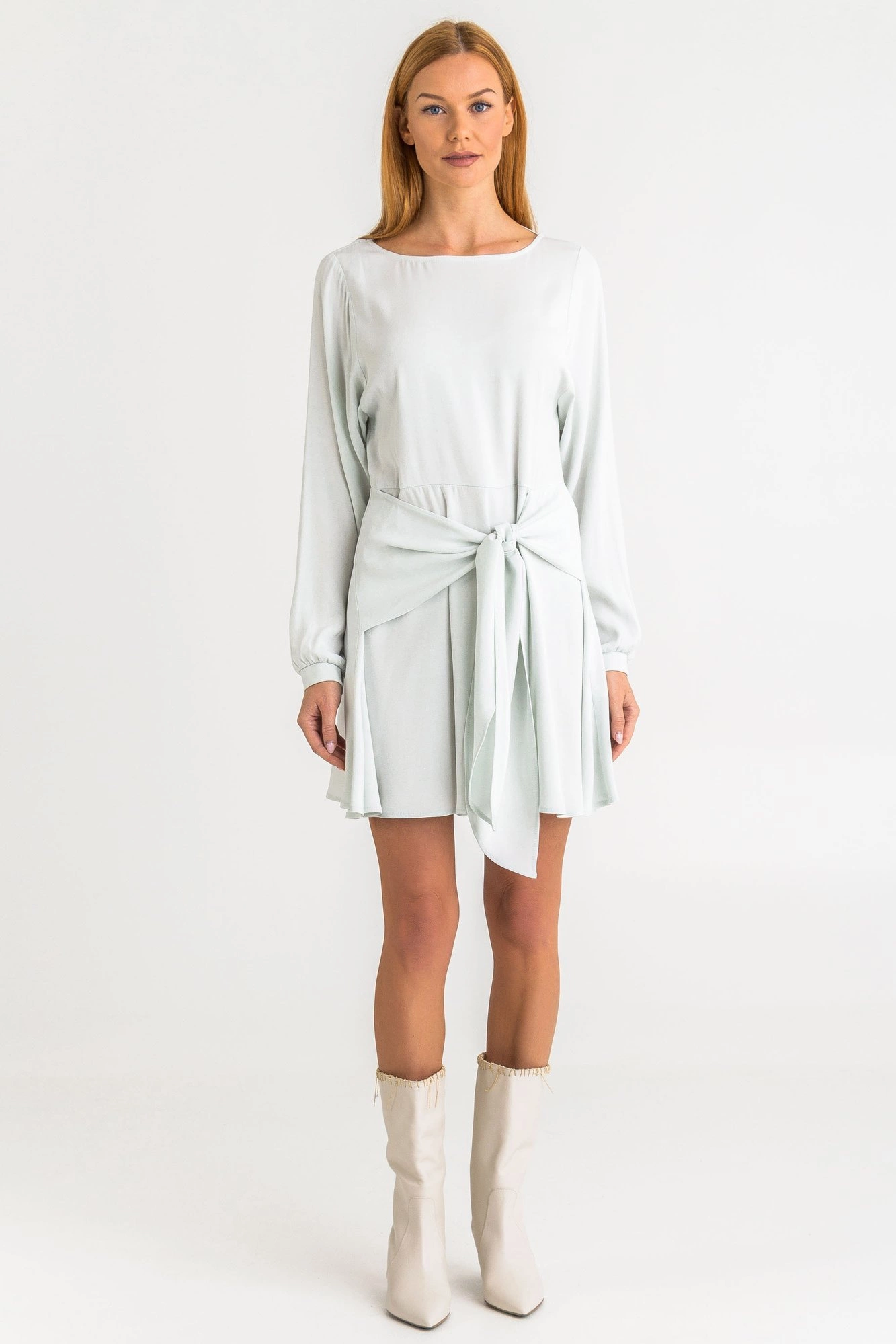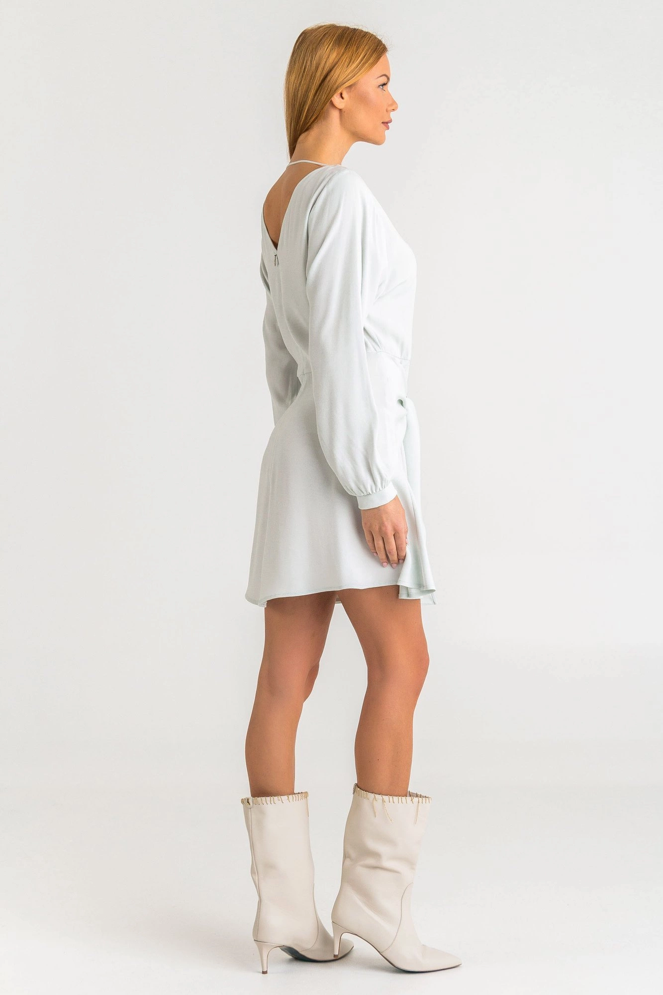 Sukienka w kolorze jasnomiętowym. Dekolt typu o-neck. W talii ozdobne wiązanie. Z tyłu zapięcia na kryty zamek, z niewielką aplikacja w postaci logo marki. Długość mini. Wykonana z wysokiej jakości materiałów.