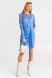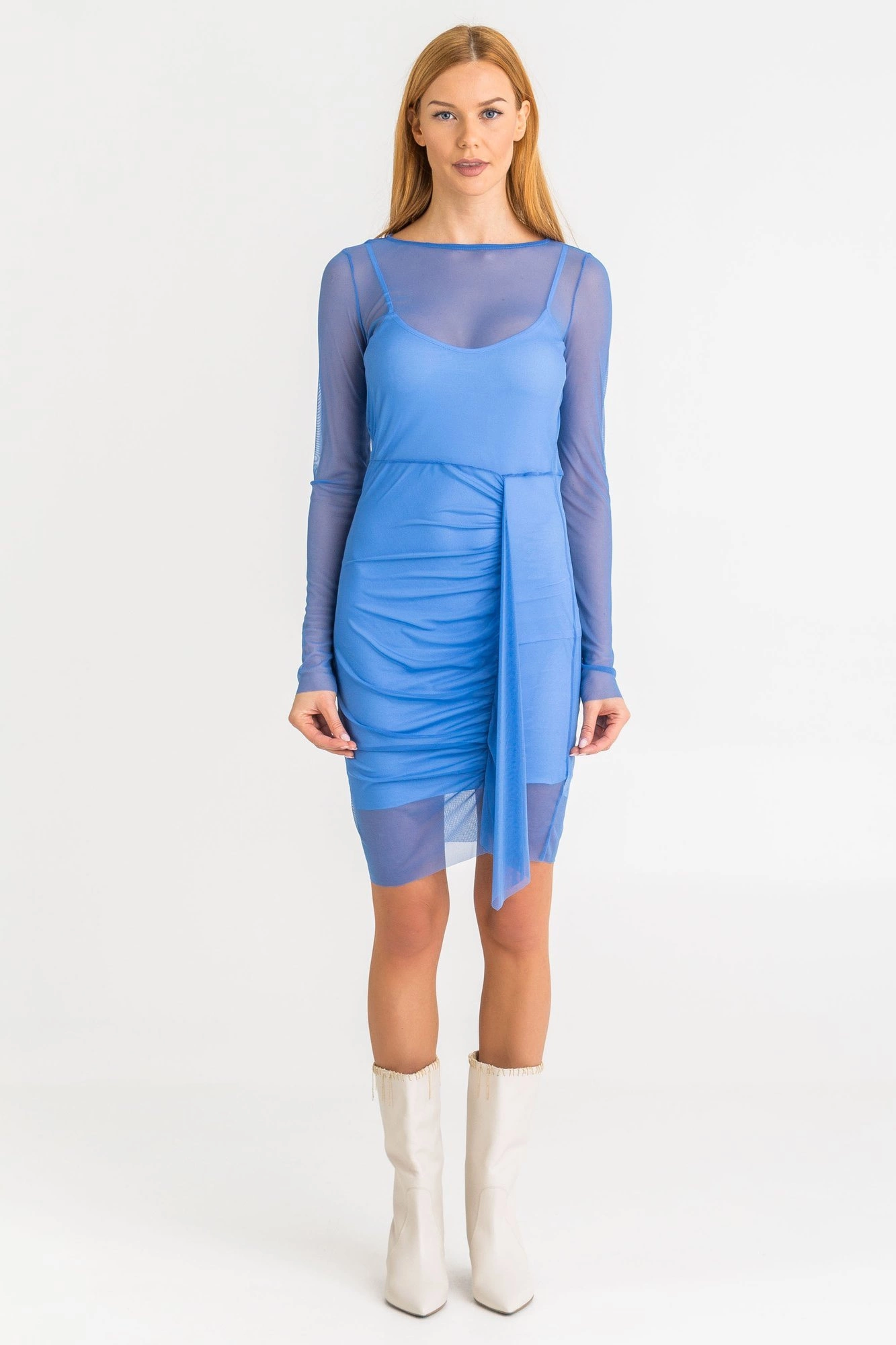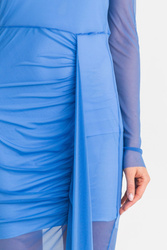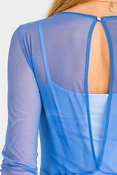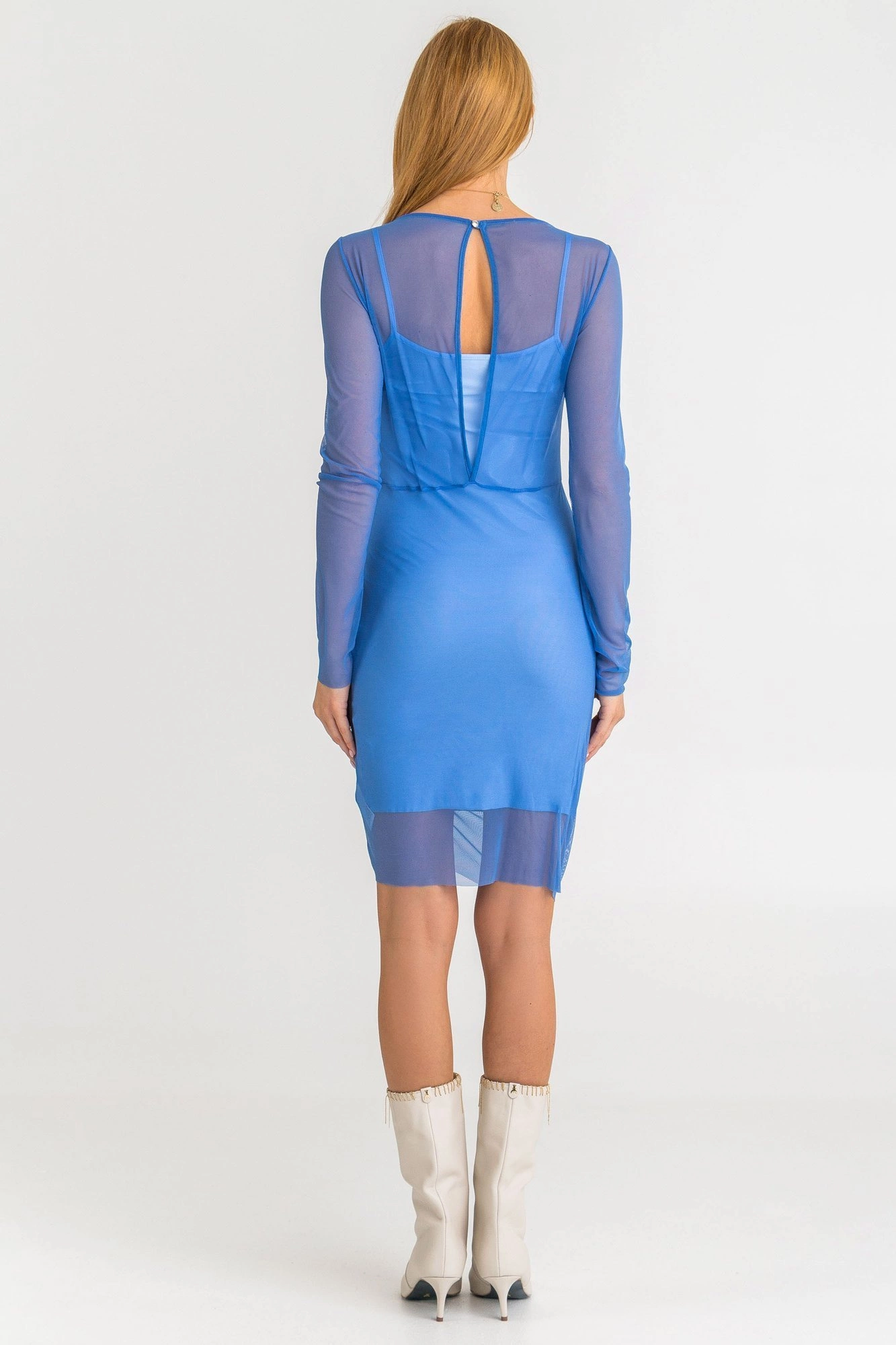Sukienka w kolorze błękitnym. Wykonana z transparentnego materiału. Dekolt typu o-neck. Z tyłu rozcięcie, oraz zapięcie na guzik. W talii odcięcie. W komplecie halka w kolorze błękitnym na regulowanych ramiączkach. Długość mini. Wykonana z wysokiej jakości materiałów.