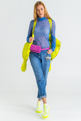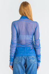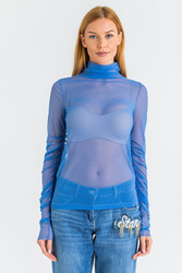 Bluzka w kolorze niebieskim o prostym kroju. Góra wykończona golfem. Na dole niewielka, metalowa aplikacja z logo marki. Rękawy marszczone. Wykonana z wysokiej jakości materiałów. Transparentna i przyjemna w dotyku.