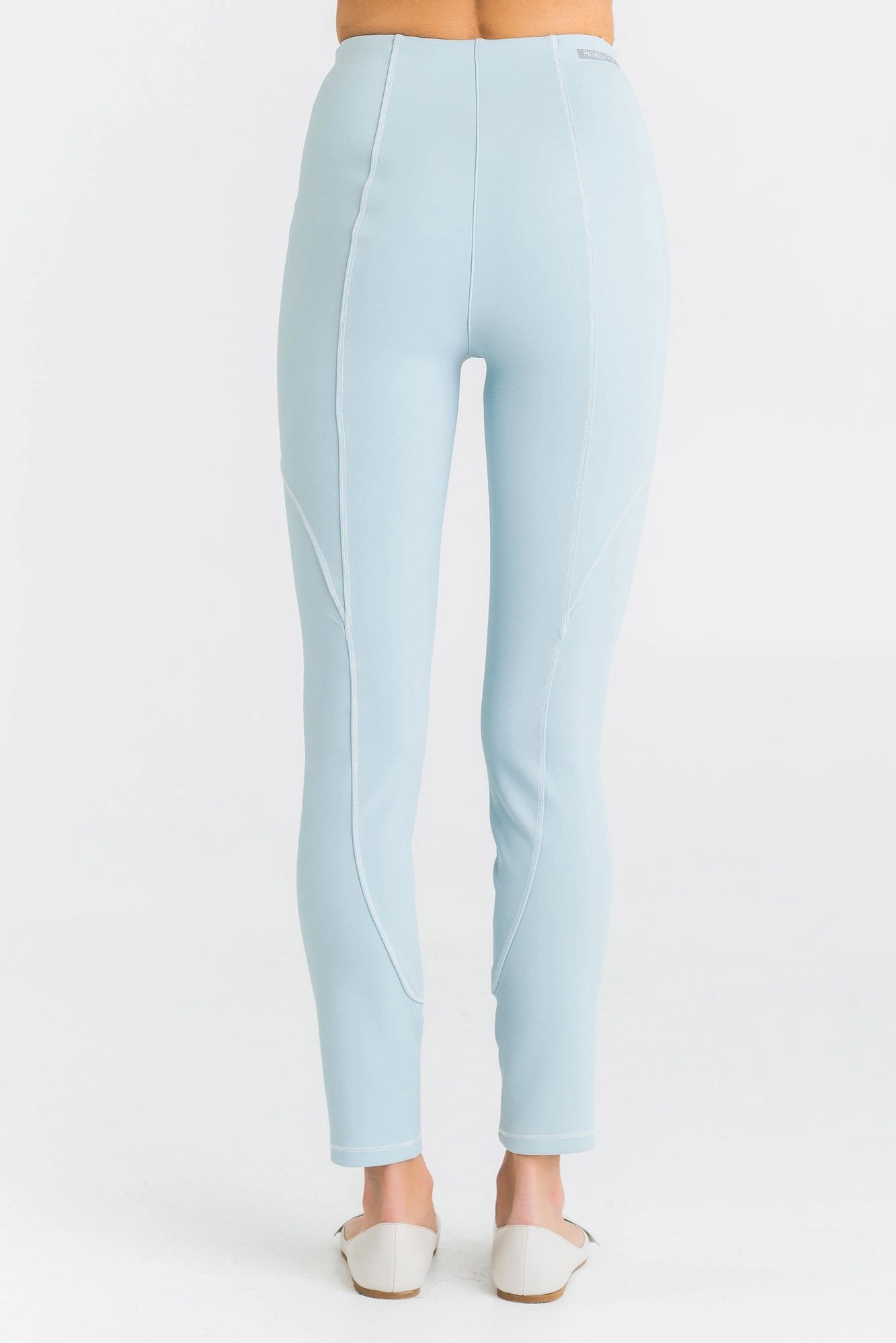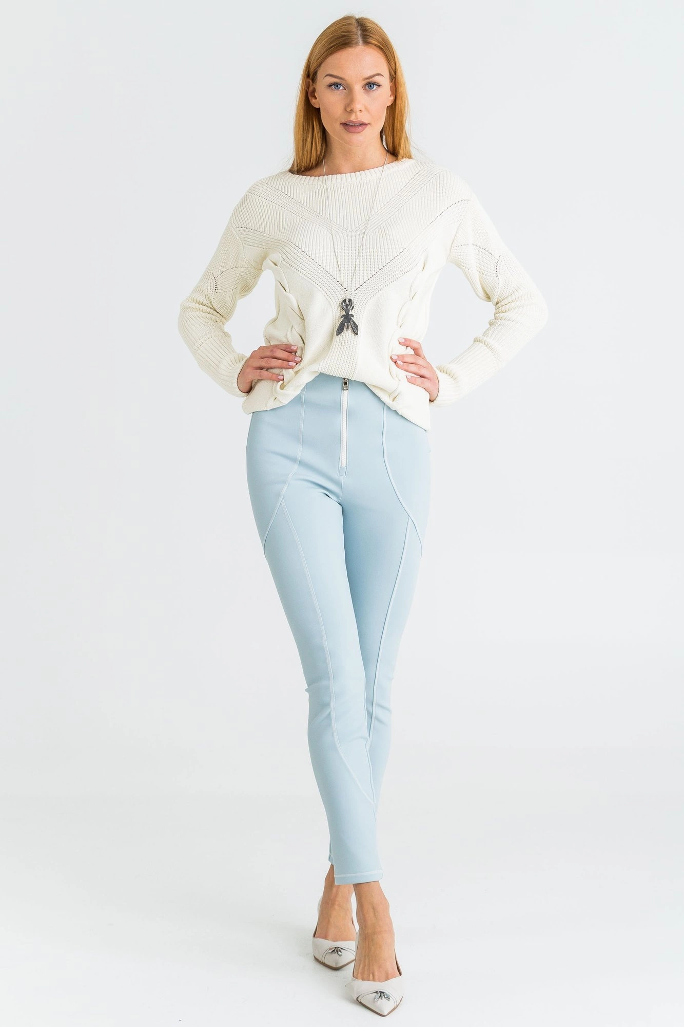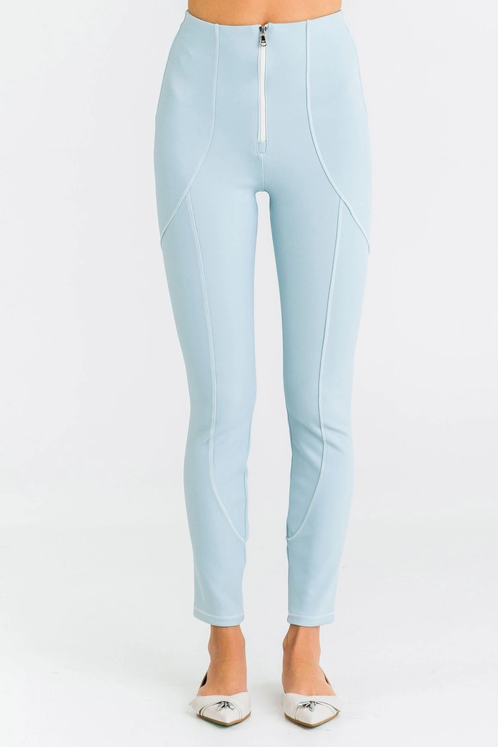 Spodnie w kolorze gołębiego błękitu o dopasowanym fasonie. Zapinane z przodu zamek. Na całości ozdobne przeszycia. Nogawki delikatnie zwężane. Dopasowane i wygodne.