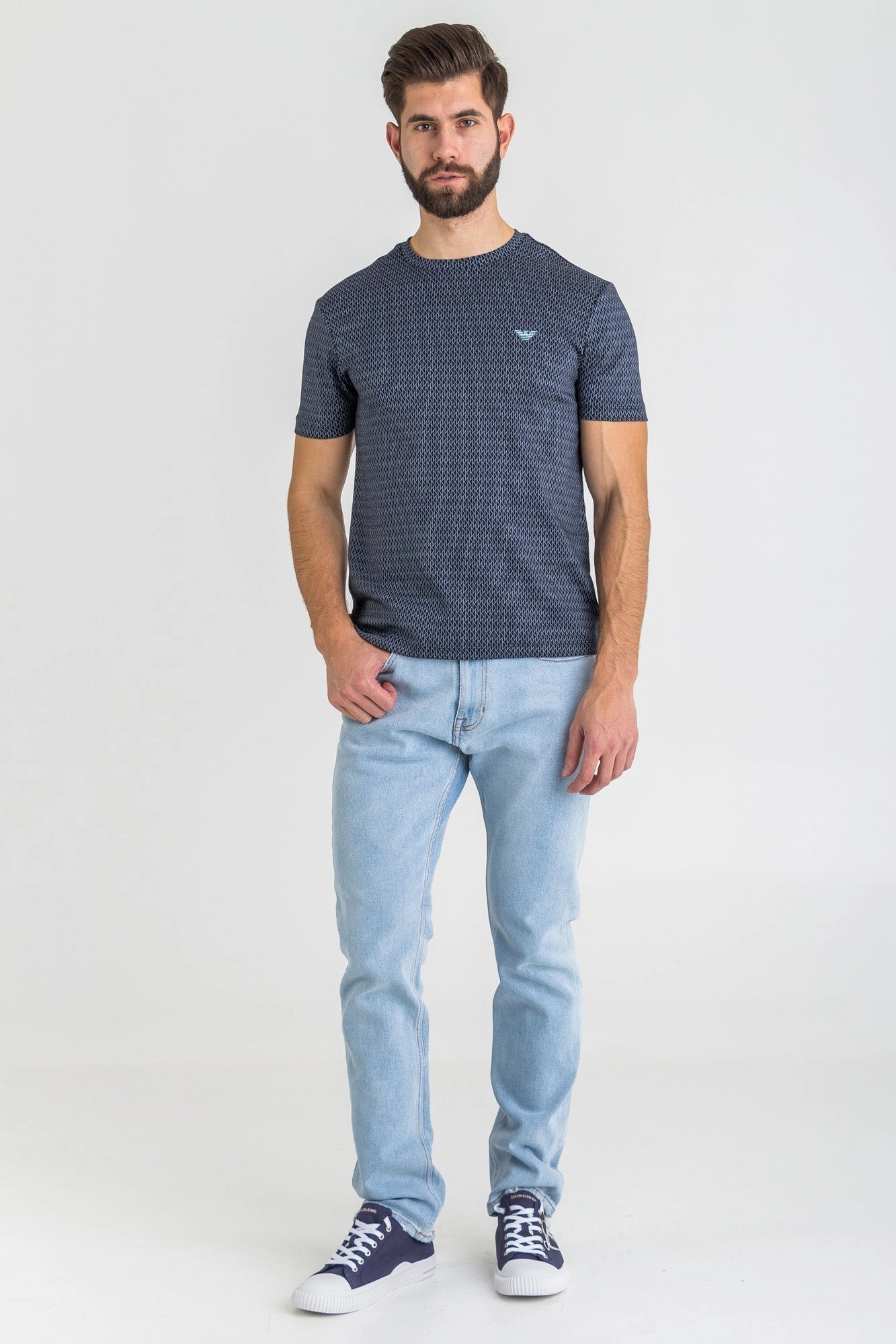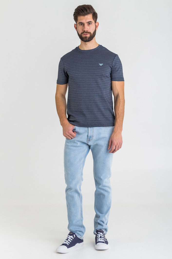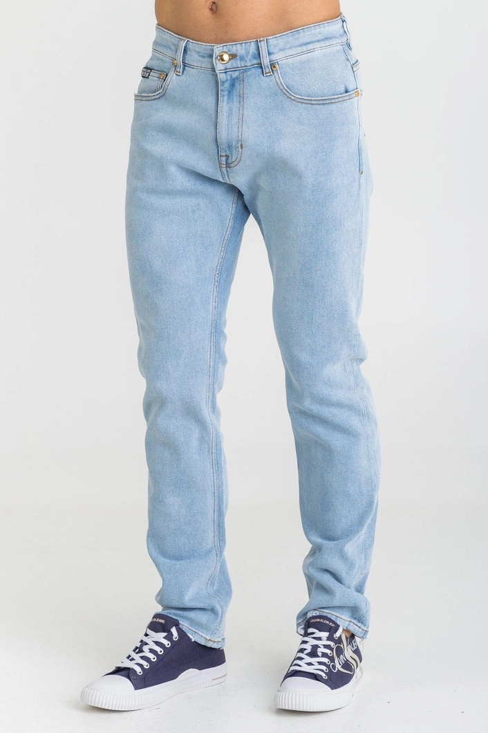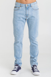 Jeansy w kolorze jasnoniebieskim. Fason typu slim fit. Zapinane na złoty zamek i guzik sygnowany logo marki. Z przodu dwie niezapinane kieszenie i bilonówka. Na niej czarno-biała aplikacja. Z tyłu dwie naszyte, niezapinane kieszenie. Na prawej czarny nadruk nazwy marki. Jeansy wykonane z wysokiej jakości bawełny z domieszką elastanu. Przyjemne w dotyku i wygodne.