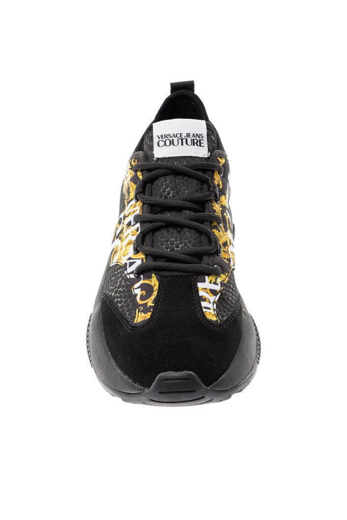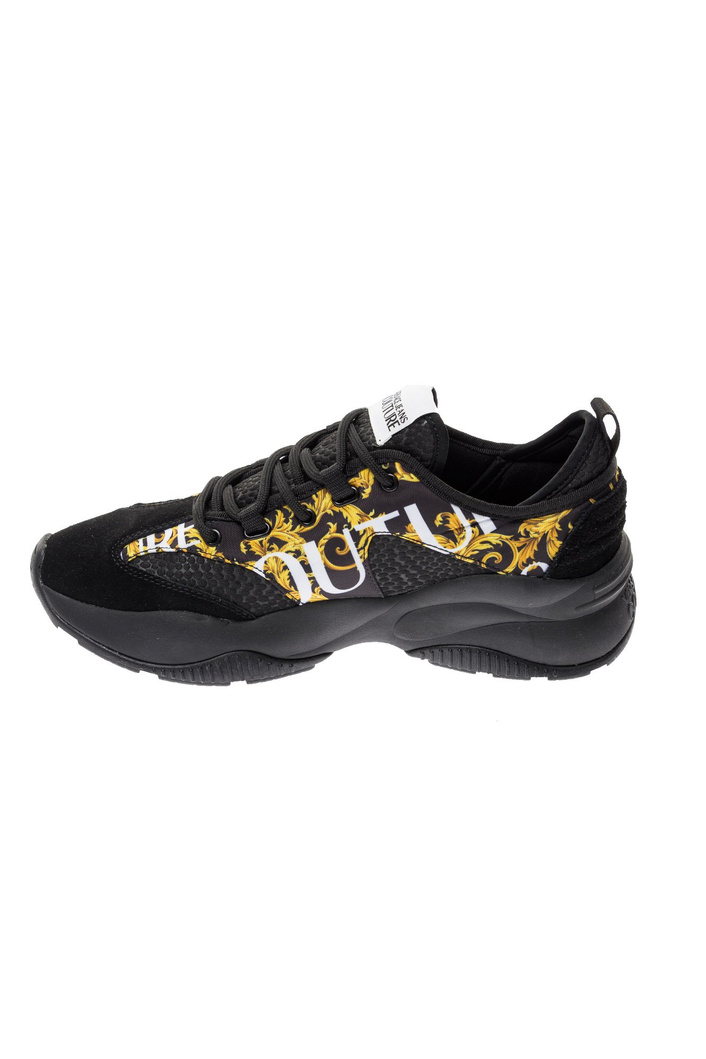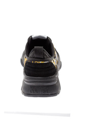 Sneakersy w kolorze czarnym. Wiązane na sznurówki. Na języku naszyta aplikacja w kolorze białym z logo marki. Na całości wielokolorowe wstawki w kolorze żółci, bieli i czerni. Przód i zapiętek wykończone zamszowymi naszyciami w kolorze czarnym. Na zapiętku czarna pętelka ułatwiająca zakładanie. Podeszwa czarna wykonana z materiału syntetycznego. Na podeszwie, z tyłu logo marki. Wysokość podeszwy ok. 6 cm.