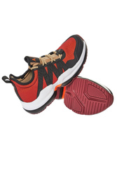 Sneakersy w kolorze ceglanej czerwieni z czarnymi wstawkami. Wiązane na beżowe sznurówki. Na języku i z tyłu czarna aplikacja z nazwą marki. Podeszwa w kolorze białym, z materiału syntetycznego o wysokości około 4 cm. Komfortowe i wygodne.