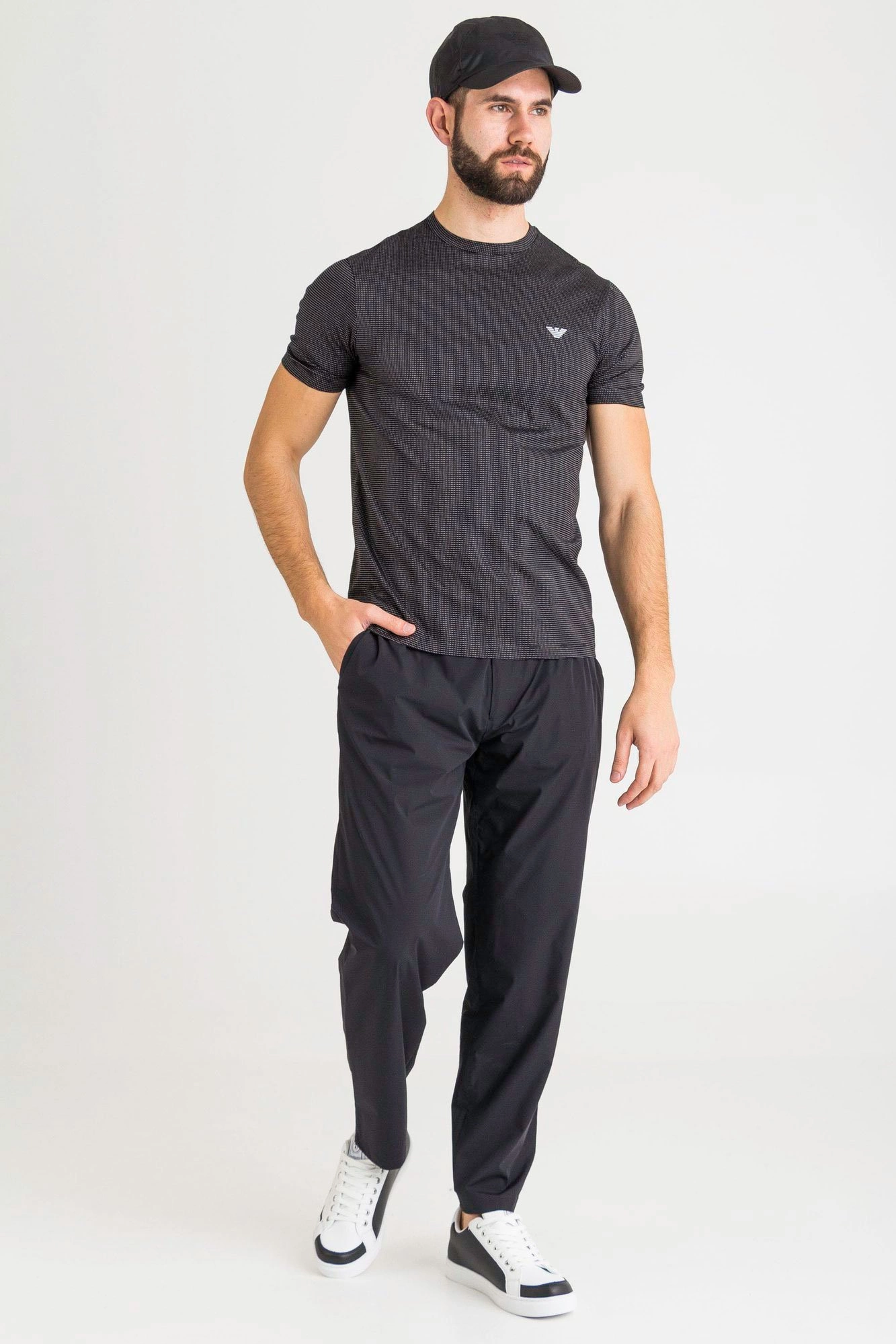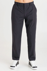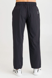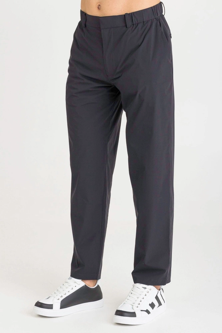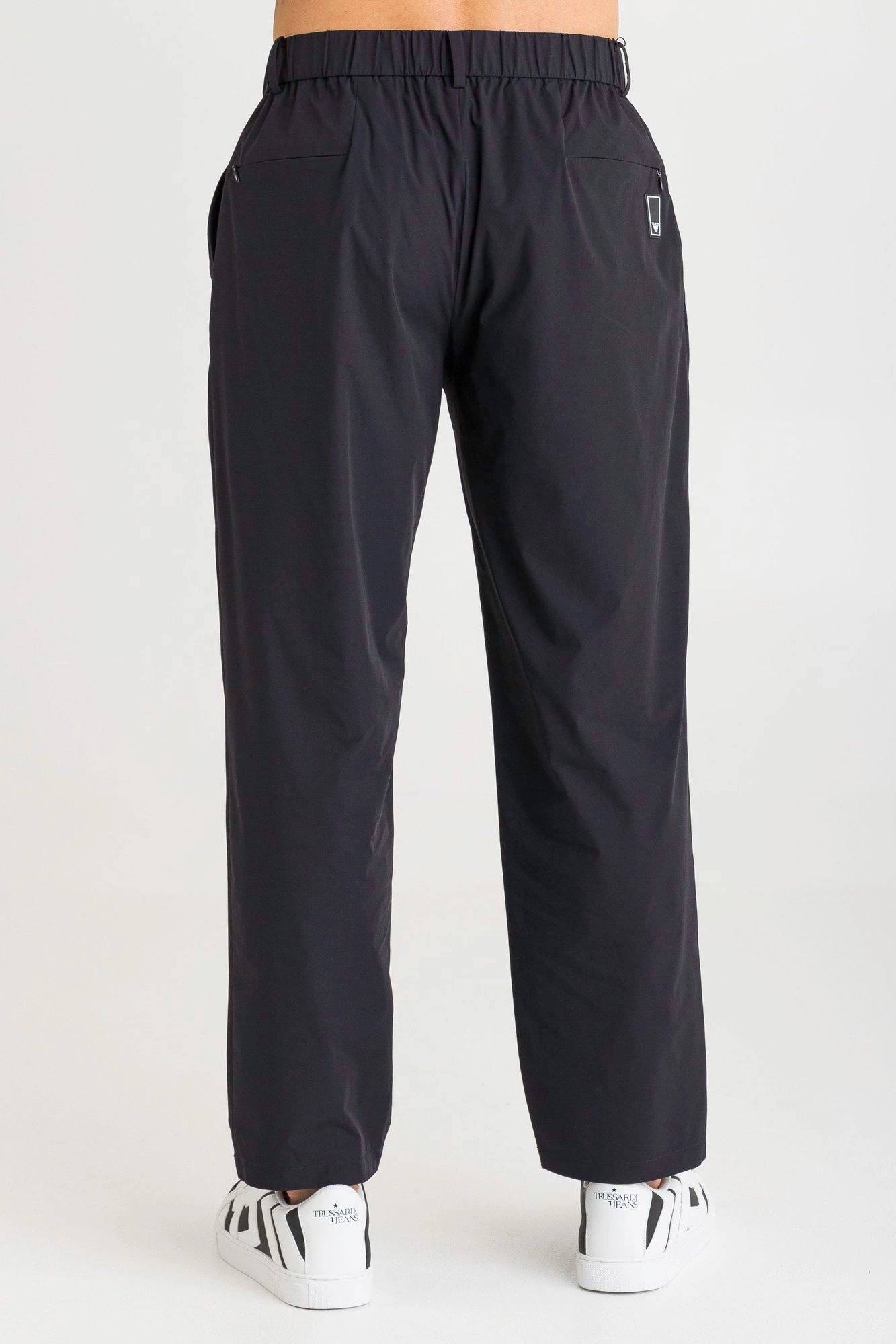 Spodnie w czarnym kolorze. Zapinane na zamek i haftkę. W pasie elastyczny ściągacz. Dwie boczne kieszenie. Z tyłu dwie kieszenie zapinane na zamek. Na prawej biała aplikacja logo marki. Spodnie z linii Travel Essential, charakteryzującej się niezwykłą wygodą i jakością materiałów. W zestawie dołączona saszetka z białym logo marki do przechowywania spodni.