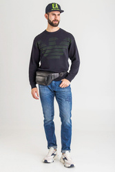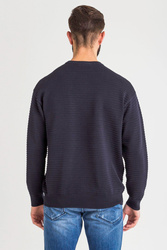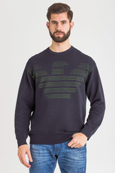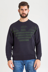 Pulower w granatowym kolorze. Dekolt typu o-neck. Na całości ozdobne tłoczenie. Z przodu duży, limonkowy wzór w postaci logo marki. Rękawy, góra i dół wykończone ściągaczem. Sweter wykonany z wysokiej jakości materiałów . Miękki, ciepły i komfortowy.