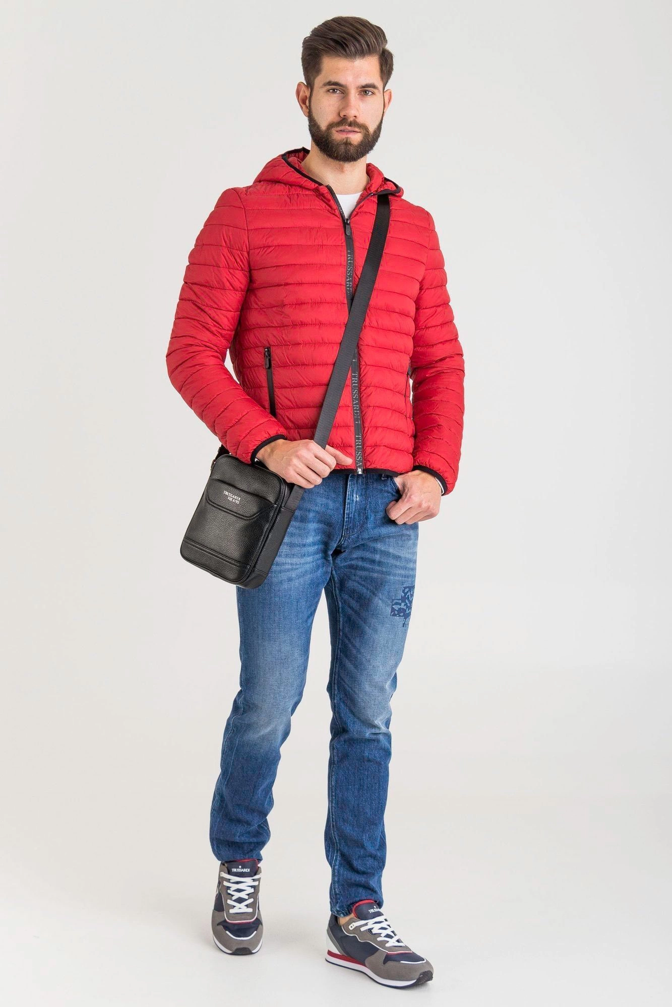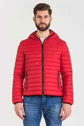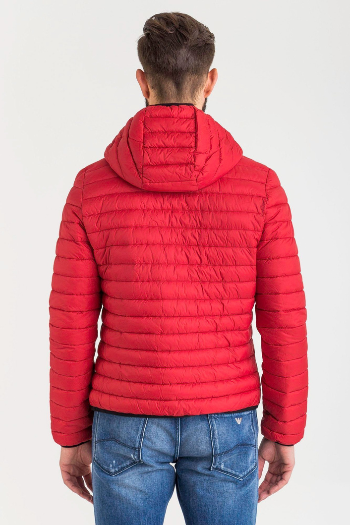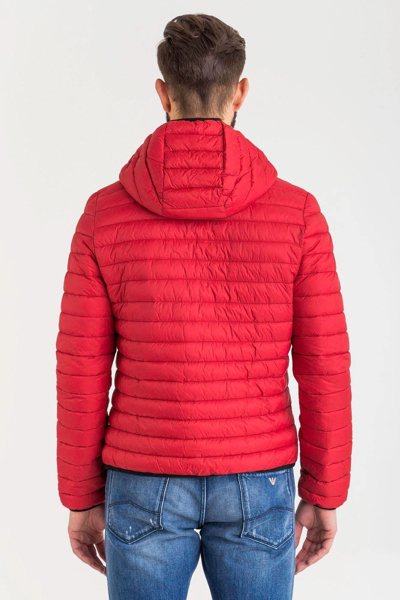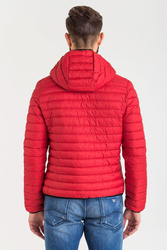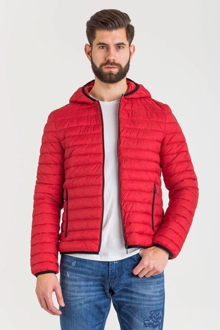 Pikowana kurtka w czerwonym kolorze z kapturem. Zapinana na czarny zamek, sygnowany logo marki. Na rękawie ozdobna aplikacja w postaci nazwy i logo marki. Po bokach dwie, zapinane na zamek kieszenie. Wszystkie zamki zakończone są ozdobną zawieszką z logo marki. Wewnątrz, po obu stronach pionowe głębokie kieszenie oraz dodatkowe kieszonki. Kaptur, rękawy i dół wykończone czarną lamówką. Lekka, ciepła i wygodna.