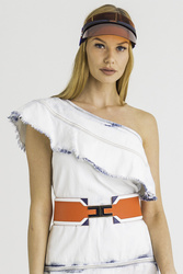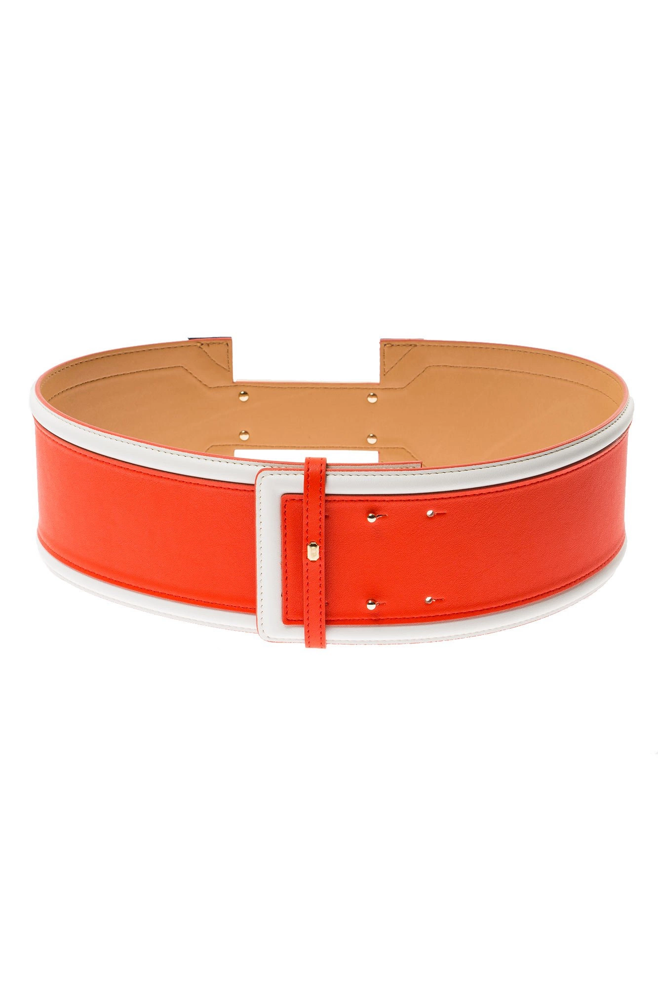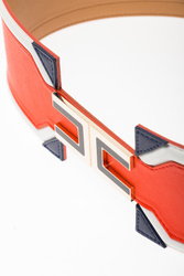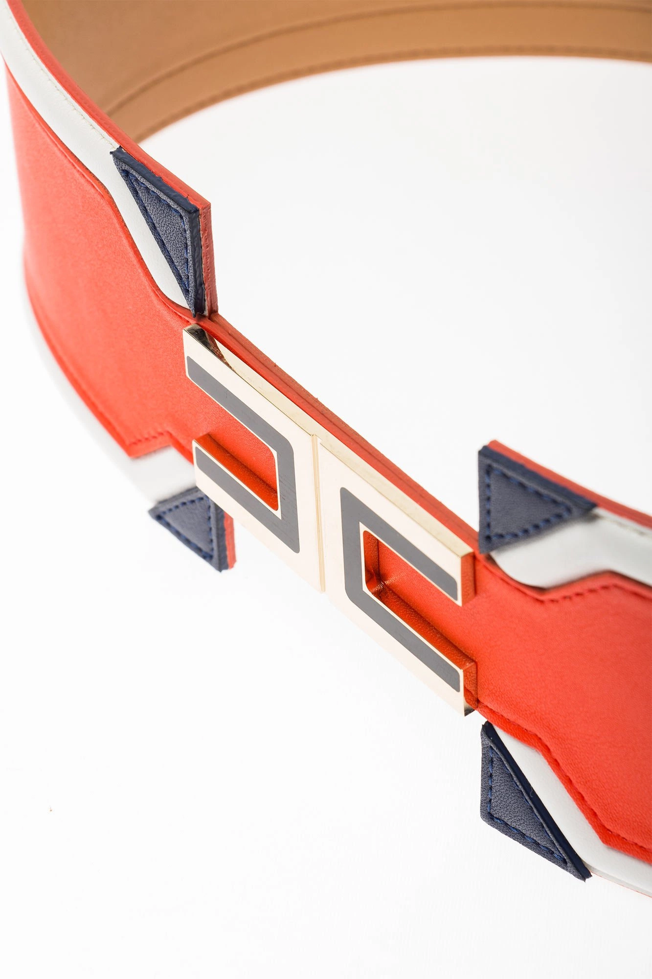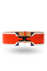 Szeroki pasek w czerwonym kolorze. Na całości białe i granatowe wstawki. Na środku złoto-granatowa aplikacja logo marki. Pasek wykonany z wysokiej jakości skóry ekologicznej.