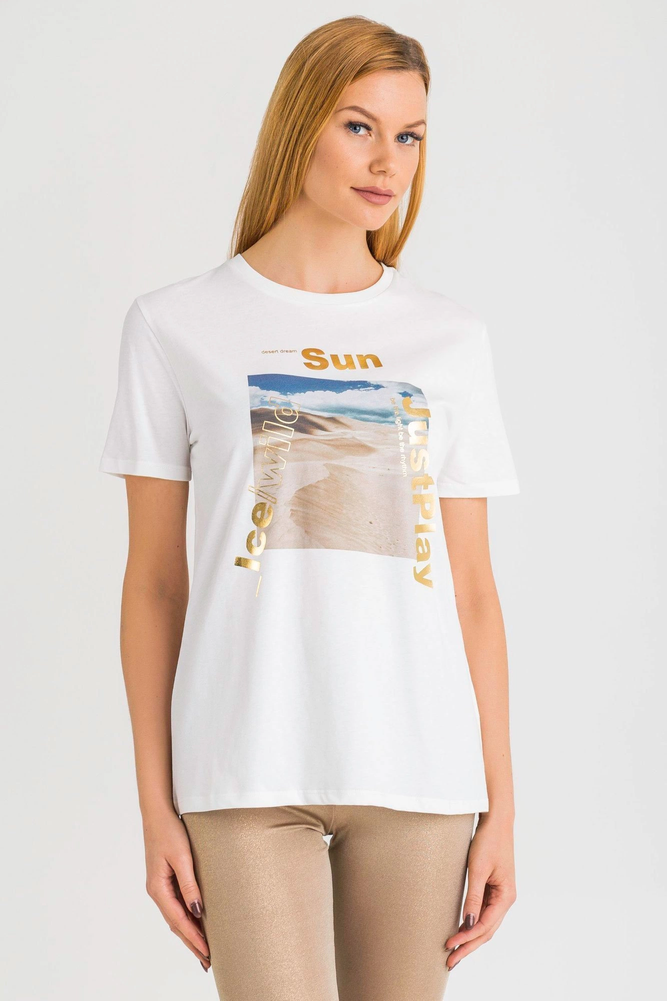 T-shirt w kolorze białym. Fason regular. Dekolt typu o-neck. Z przodu wielokolorowy nadruk.T-shirt wykonany z wysokiej jakości bawełny. Komfortowy i przyjemny w dotyku.
