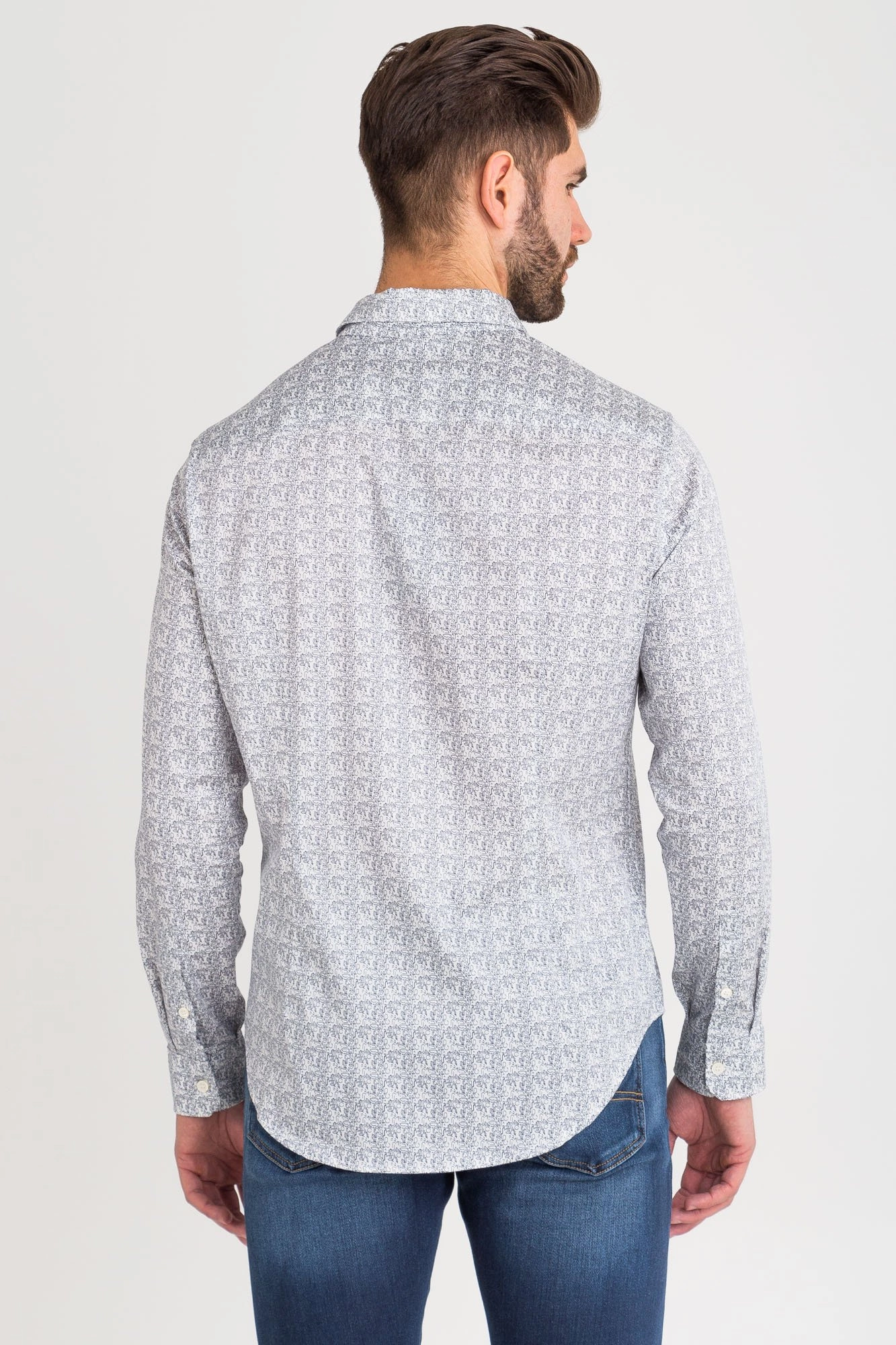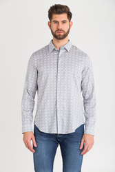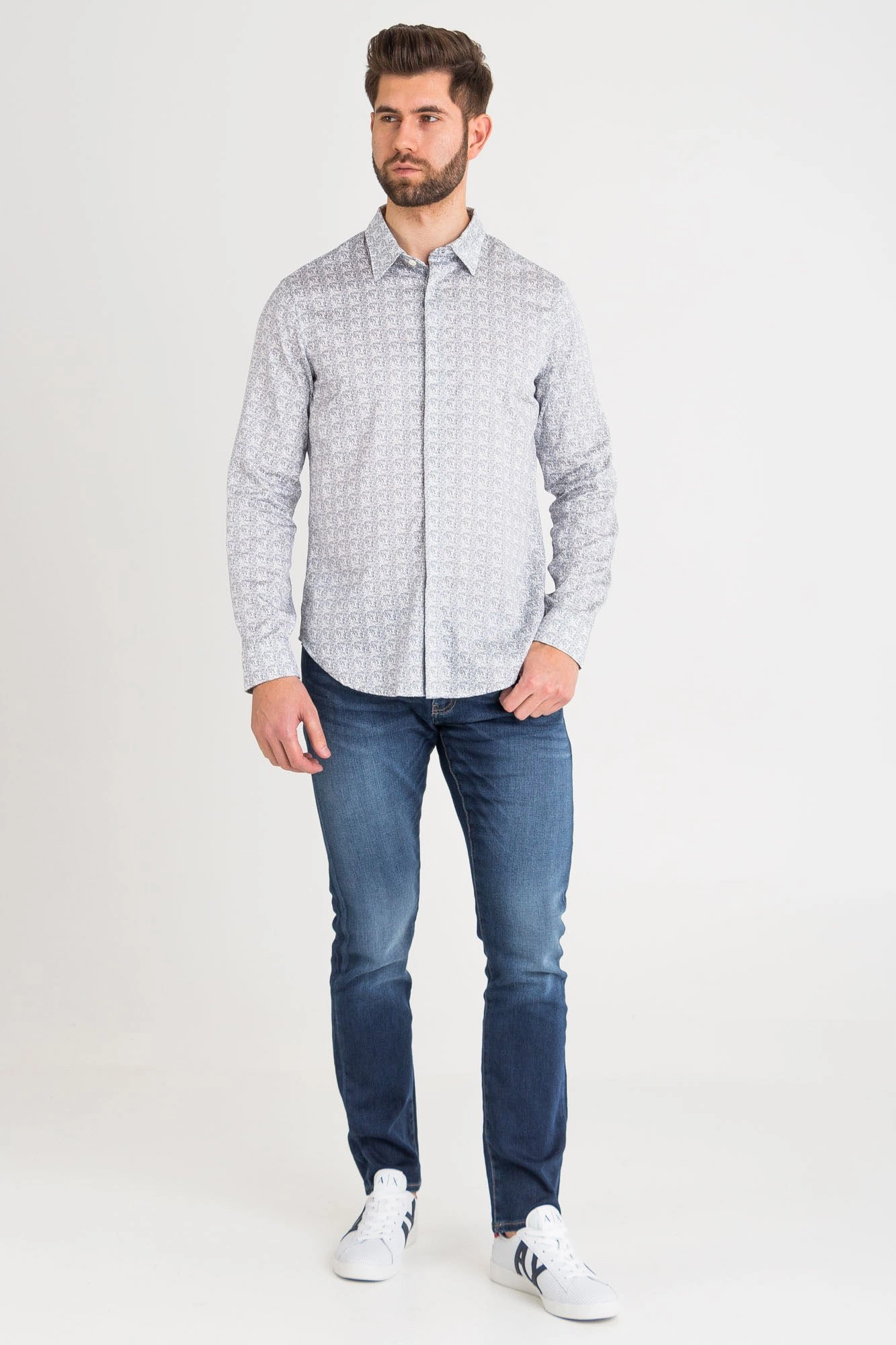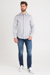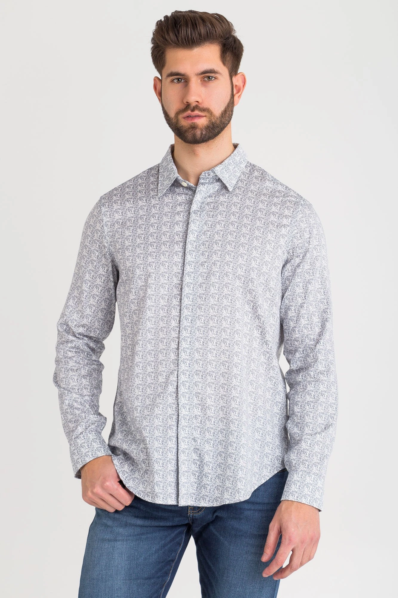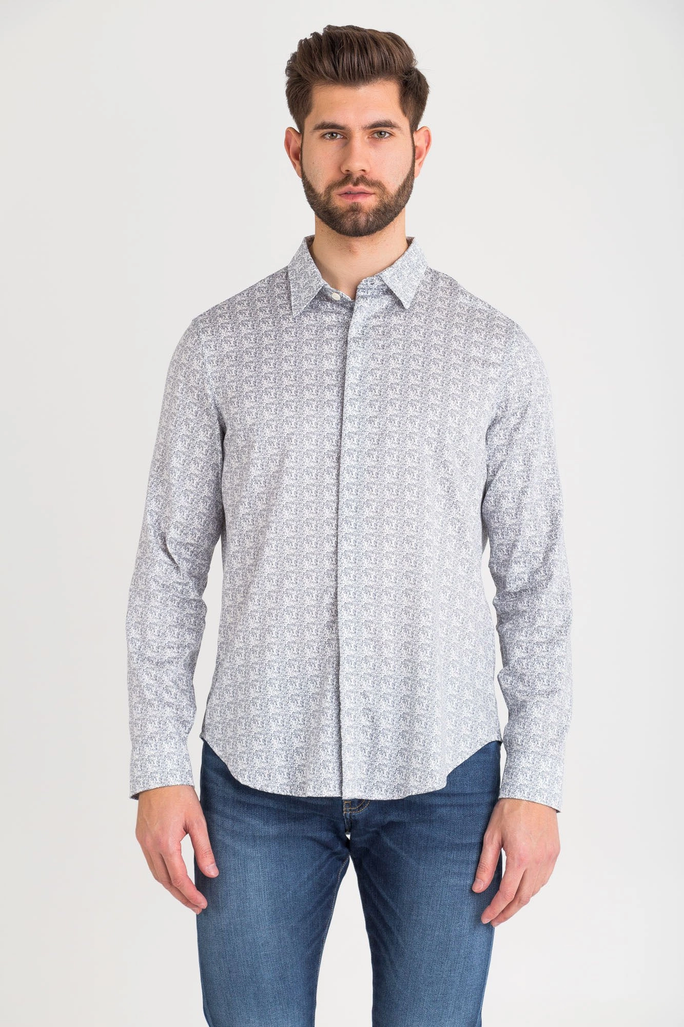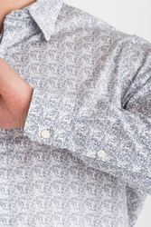 Koszula w białym kolorze. Na całości granatowy wzór w postaci nazwy marki. Fason slim fit. Zapinana na białe guziki. Kołnierzyk typu włoskiego. Rękaw wykończony prostym mankietem, zapinany na jeden guzik. Koszula wykonana z wysokiej jakości bawełny z dodatkiem elastanu. Miękka i komfortowa.