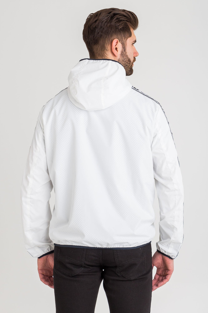 Kurtka w białym kolorze z kapturem. Zapinana na srebrny, dwukierunkowy zamek sygnowany logo marki. Z przodu dwie kieszenie zapinane na zamek. Na rękawach jasnoszare wstawki z granatowym haftem nazwy marki. Kaptur, rękawy i dół wykończone elastyczną lamówką w kolorze granatowym. Wewnątrz kieszeń zapinana na kryty zamek. Podszewka w postaci siatki, biała. Kurtka wykonana z wysokiej jakości materiału. Lekka i delikatnie transparentna.