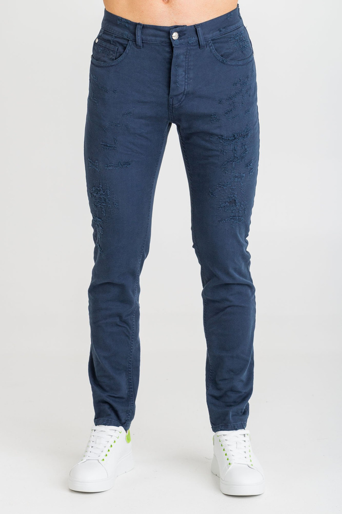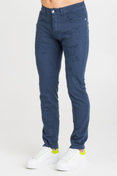 Jeansy w kolorze granatowym. Fason skinny fit. Zapinane na srebrne guziki sygnowane logo marki. Z przodu dwie, niezapinane kieszenie i bilonówka. Nogawki proste. Na nich liczne przetarcia. Z tyłu naszyte dwie, niezapinane kieszenie, oraz brązowa aplikacja z limonkowym tłoczeniem nazwy marki. Jeansy wykonane z wysokiej jakości bawełny z dodatkiem elastanu. Wygodne i lekko elastyczne.