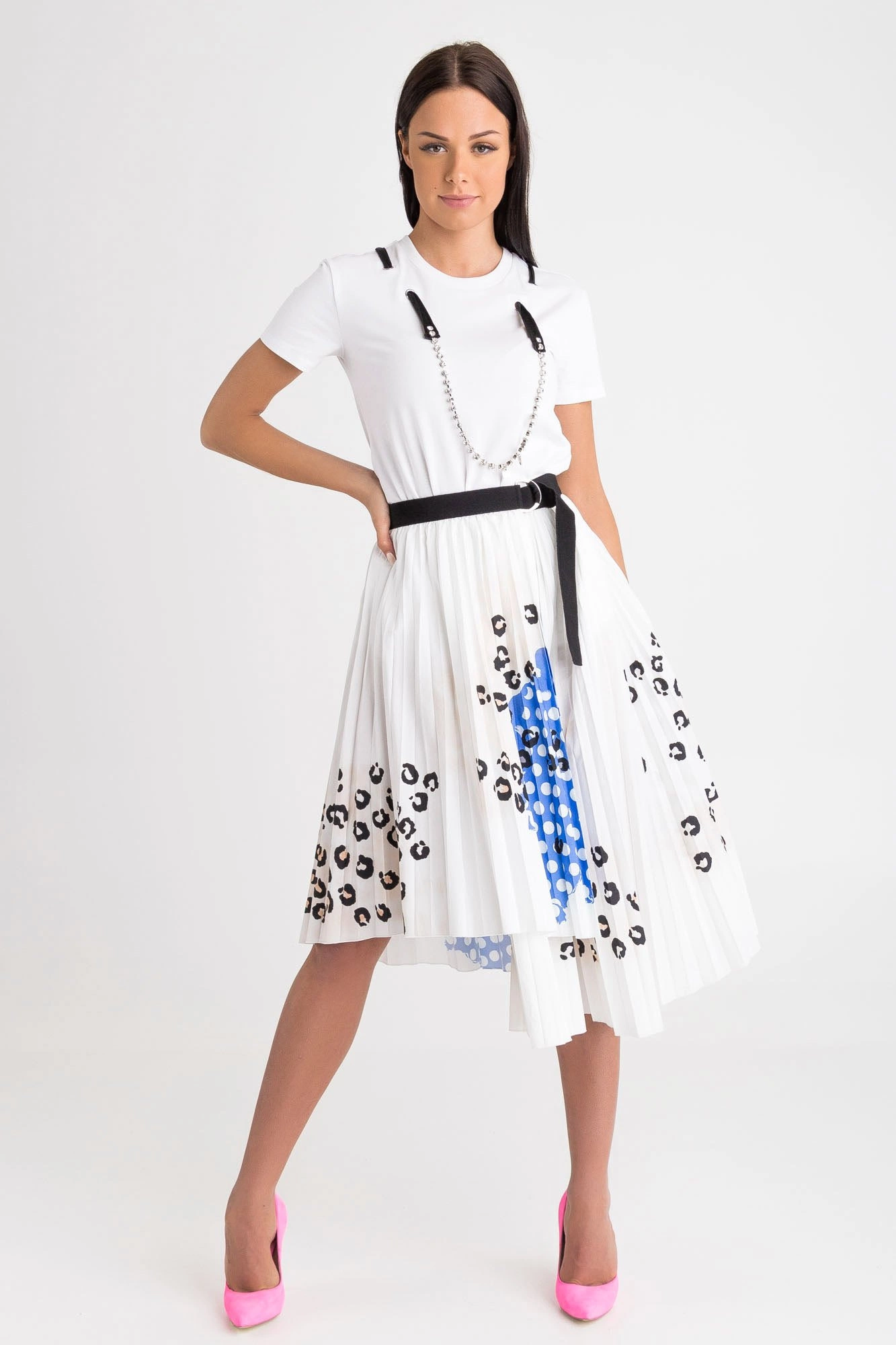 Biała spódnica o fasonie kopertowym. Zapinana w pasie przy pomocy czarnej taśmy ze srebrnymi ringami. Na całości wielokolorowy wzór. Dół lekko asymetryczny. Długość midi. Spódnica wykonana z wysokiej jakości bawełny. Przyjemna w dotyku i zwiewna.