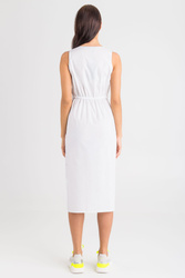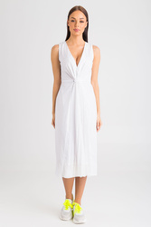 Sukienka w białym kolorze. Głęboki dekolt typu v-neck. Odcięta w pasie. Z przodu plisowana wstawka z transparentnego materiału, wykończona u góry węzłem, a u dołu szeroko koronką. Z tyłu w pasie ściągacz. Wykonana z wysokiej jakości bawełny z domieszką elastanu. Lekka i wygodna.