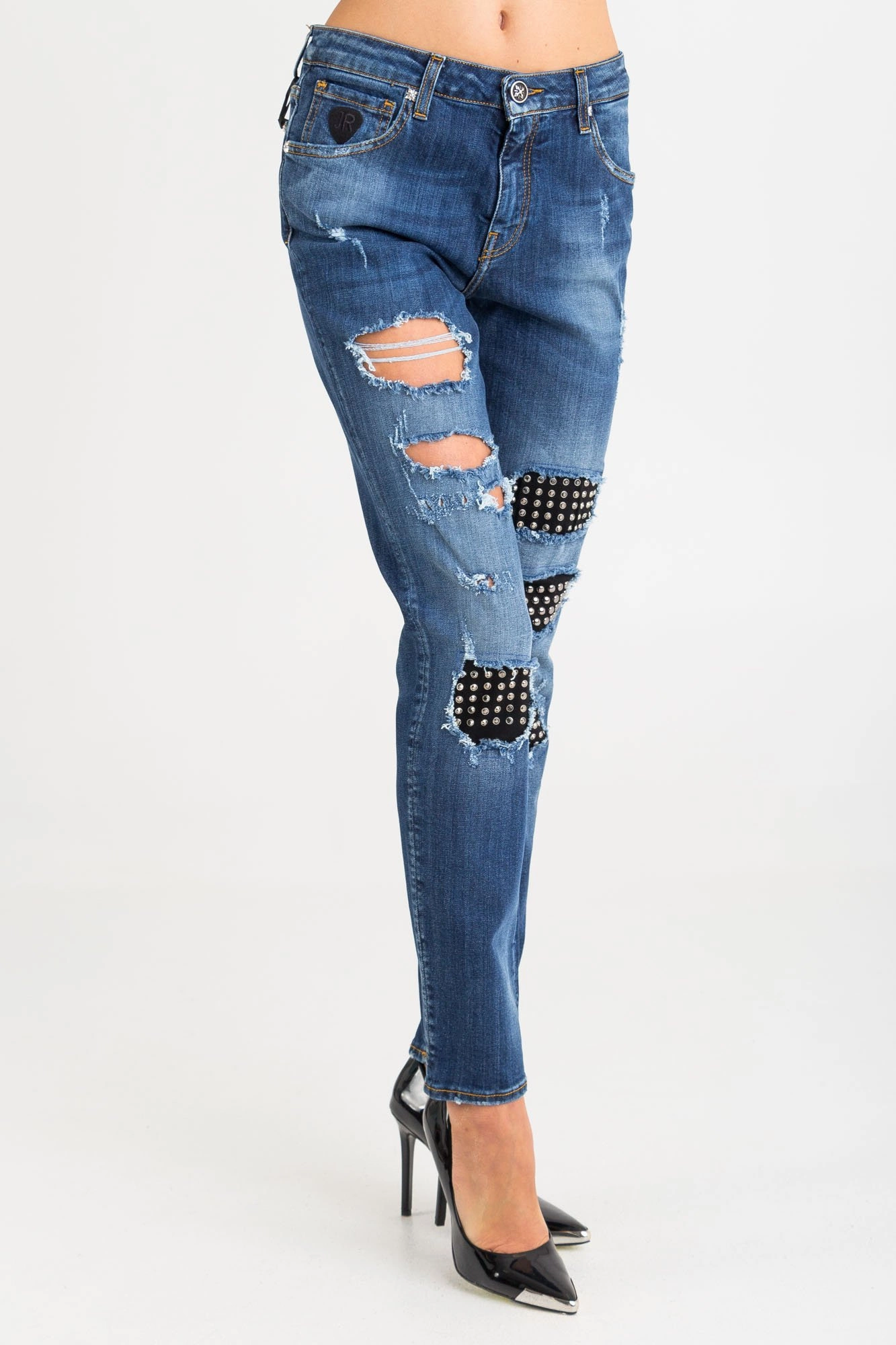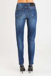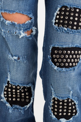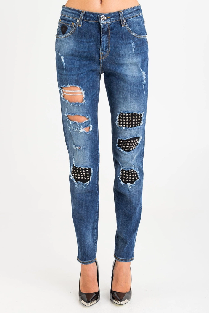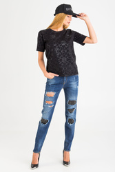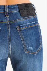Jeansy w kolorze granatowym. Fason skinny fit. Zapinane na zamek i guzik sygnowany logo marki. Z przodu dwie, niezapinane kieszenie i bilonówka. Na niej niewielka czarna aplikacja z logo marki. Nogawki wąskie i dopasowane. Z przodu na całości liczne przetarcia i dziury podszyte czarnym materiałem ze srebrnymi dżetami. Z tyłu dwie niezapinane kieszenie. Nad prawą czarna aplikacja sygnowana logo marki. Wykonane z wysokiej jakości bawełny z dodatkiem elastanu. Wygodne i lekko elastyczne.