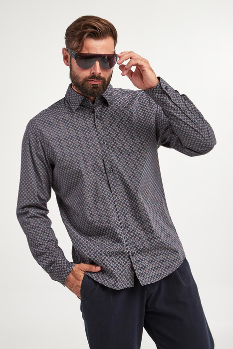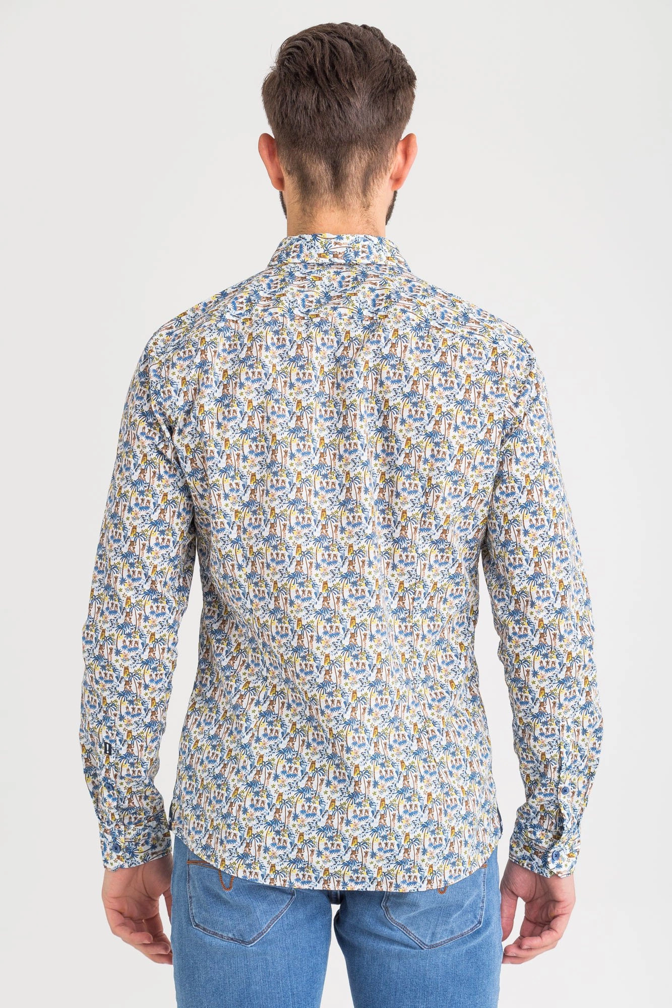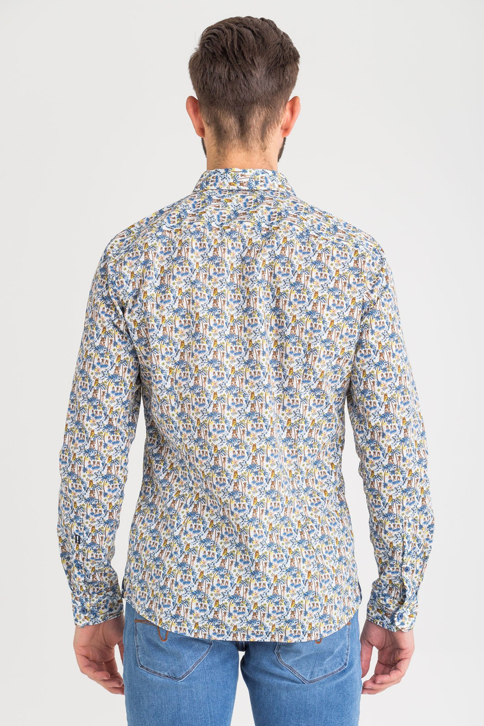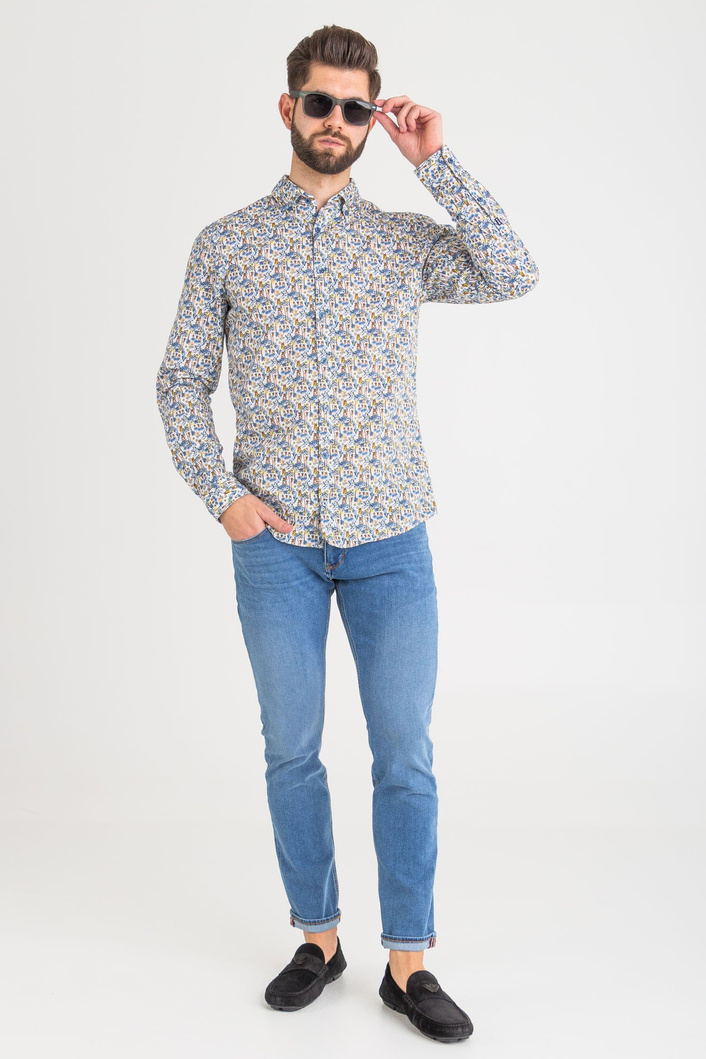 Wielokolorowa koszula. Na całości wzór. Fason slim fit. Kołnierzyk prosty, typu kent. Zapinana na niewielkie, perłowe guziki. Mankiet ścięty, zapinany na jeden guzik. Na lewym rękawie, niewielki czarny haft logo marki. U dołu po bokach niewielkie aplikacje z logo marki. Dół asymetryczny. Koszula wykonana z wysokiej jakości bawełny. Przyjemna w dotyku, wygodna.
