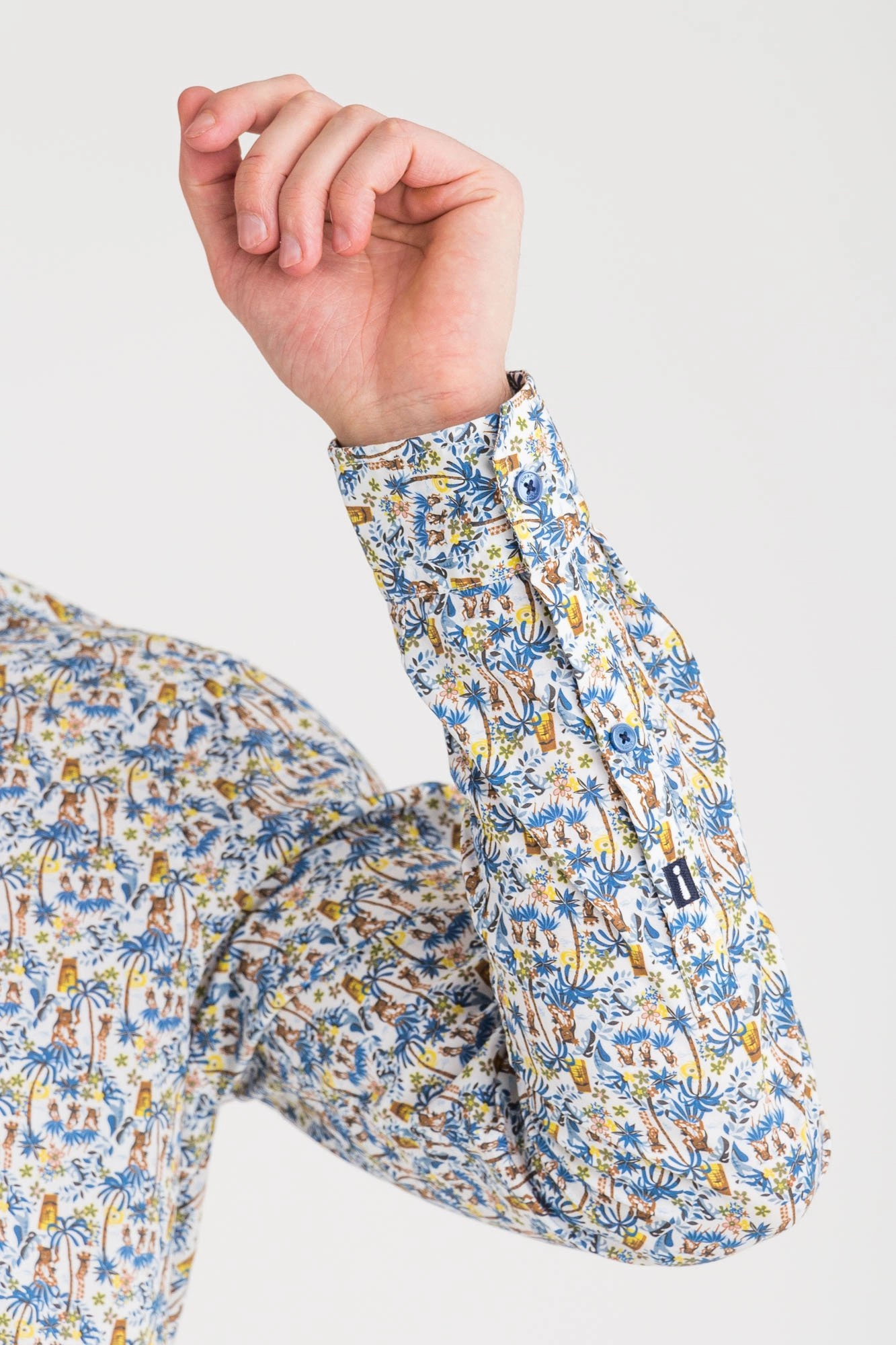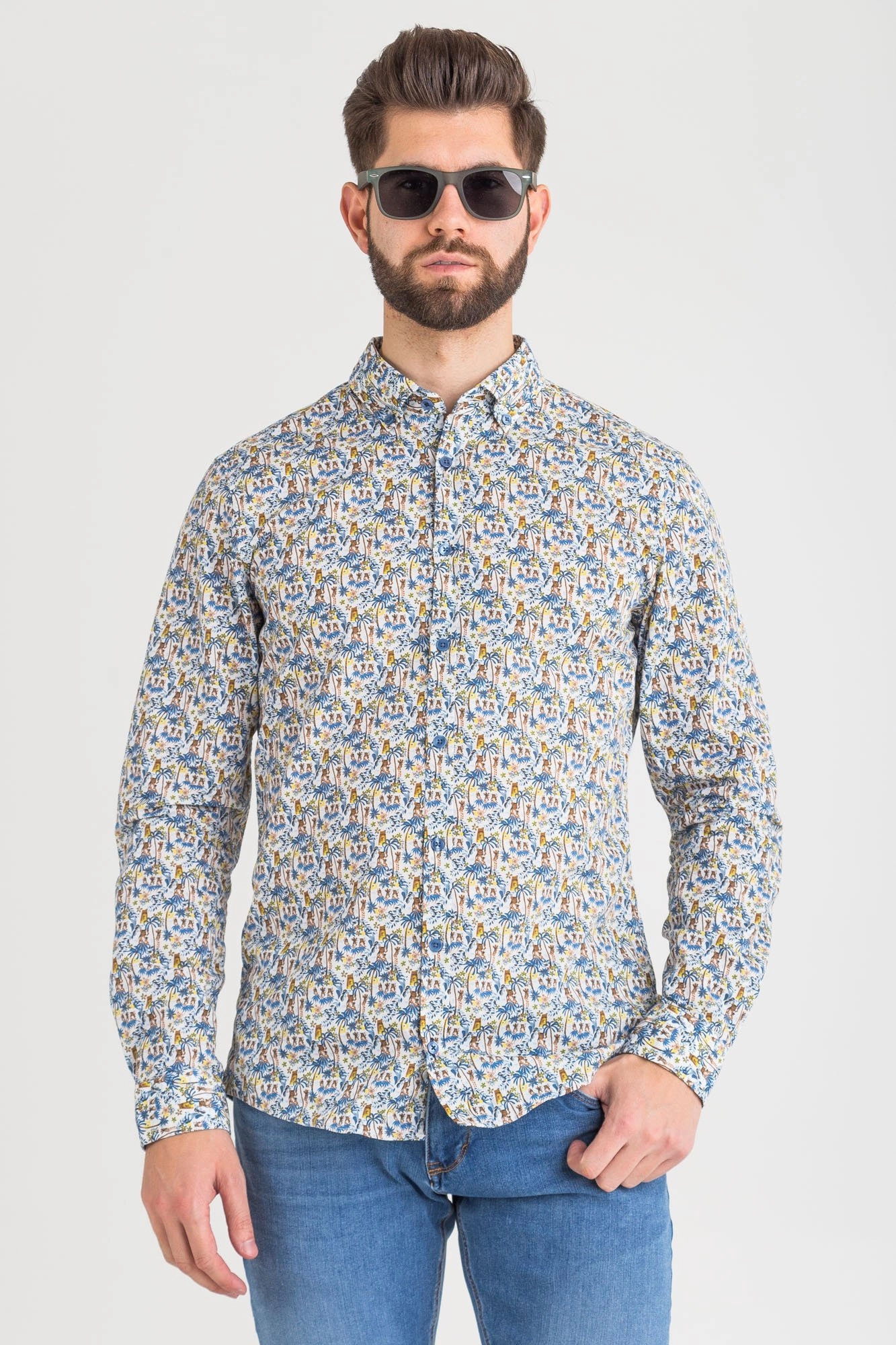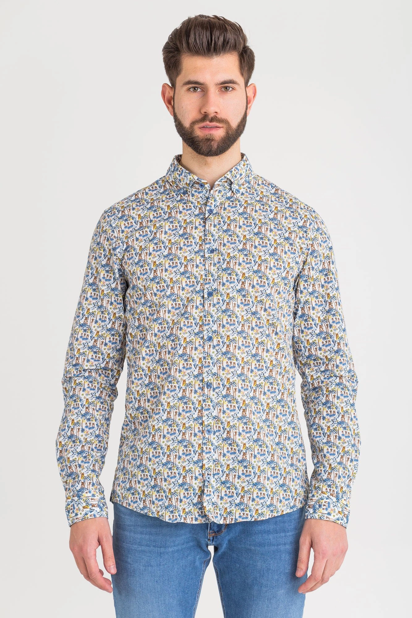 Wielokolorowa koszula. Na całości wzór. Fason slim fit. Kołnierzyk prosty, typu kent. Zapinana na niewielkie, perłowe guziki. Mankiet ścięty, zapinany na jeden guzik. Na lewym rękawie, niewielki czarny haft logo marki. U dołu po bokach niewielkie aplikacje z logo marki. Dół asymetryczny. Koszula wykonana z wysokiej jakości bawełny. Przyjemna w dotyku, wygodna.