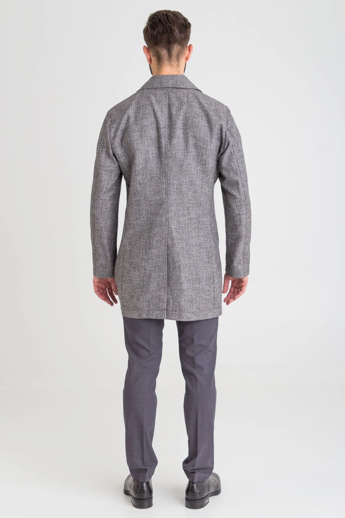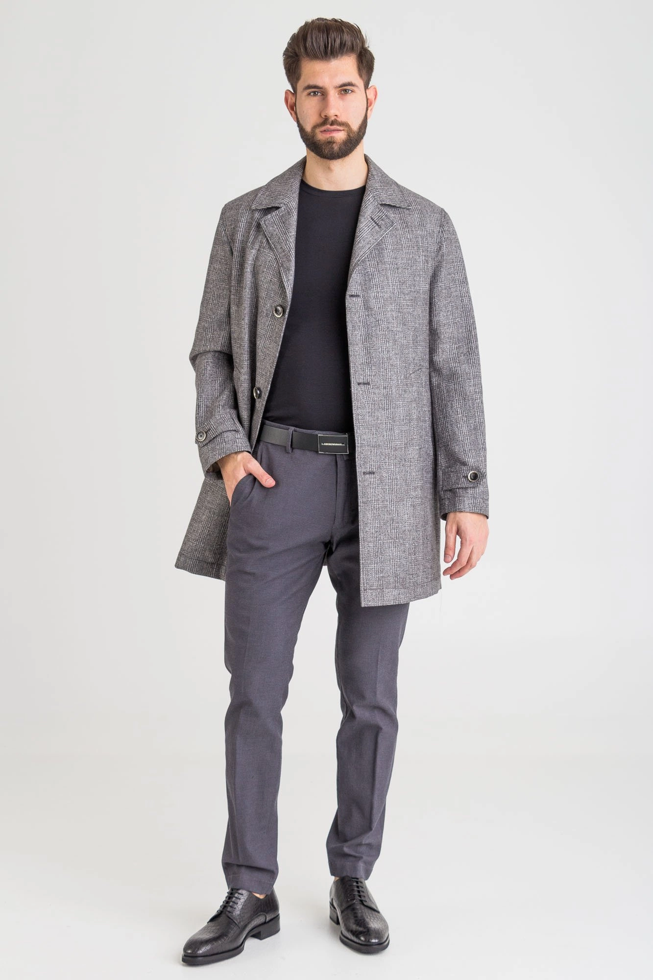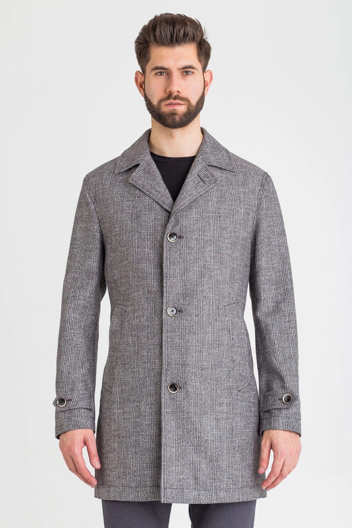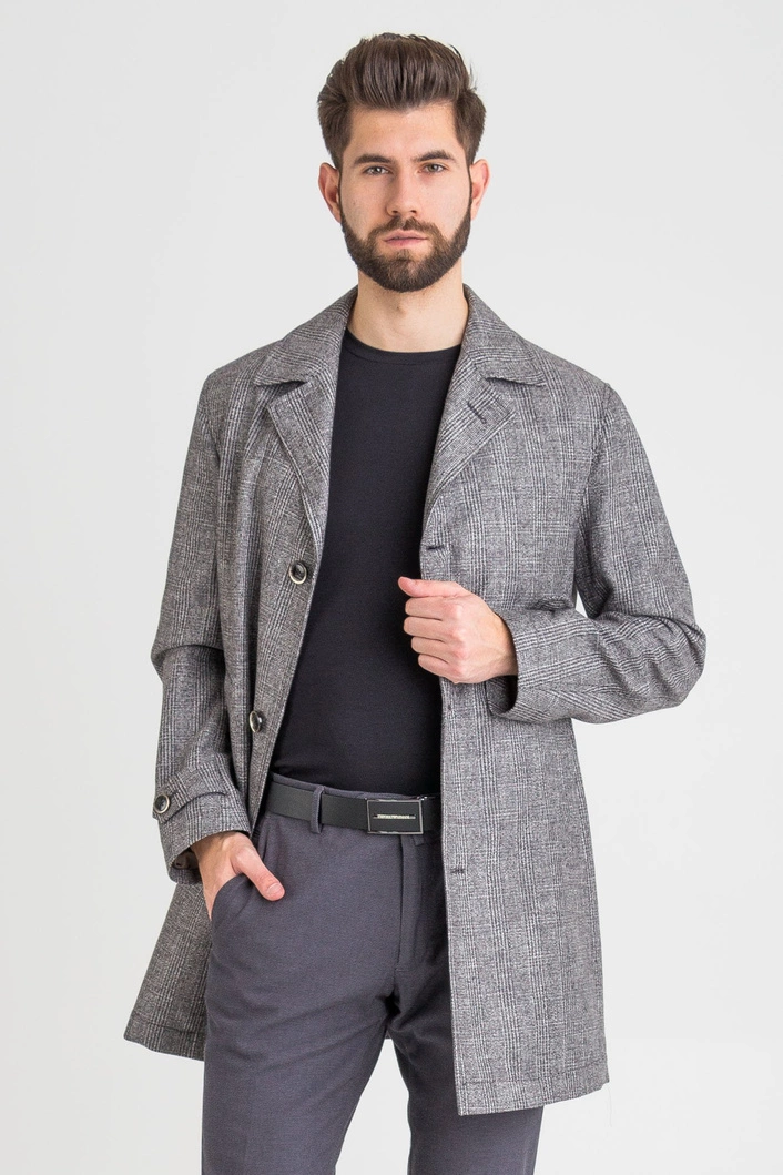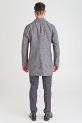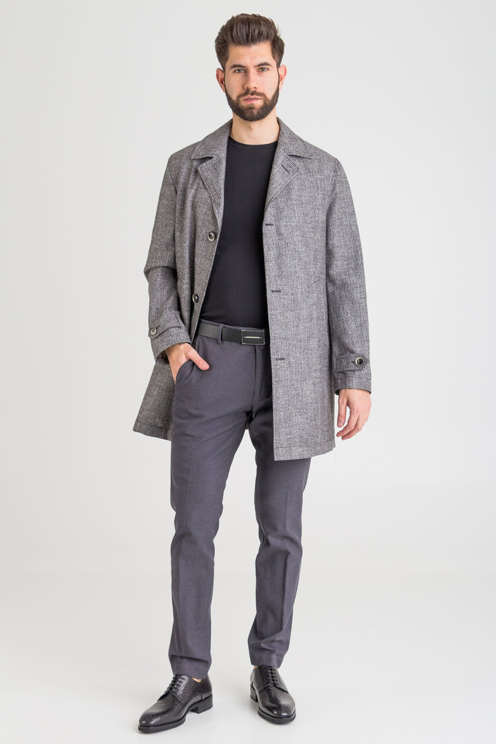 Płaszcz w szarym kolorze, w melanżowy wzór. Zapinany na guziki, sygnowane logo marki. Z przodu dwie, niezapinane kieszenie. Jedna wewnętrzna kieszeń zapinana na guzik. Na rękawie patka z ozdobnym guzikiem. Z tyłu rozcięcie. Płaszcz wykonany z wysokiej jakości materiałów. Przyjemny w dotyku i wygodny.