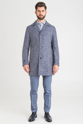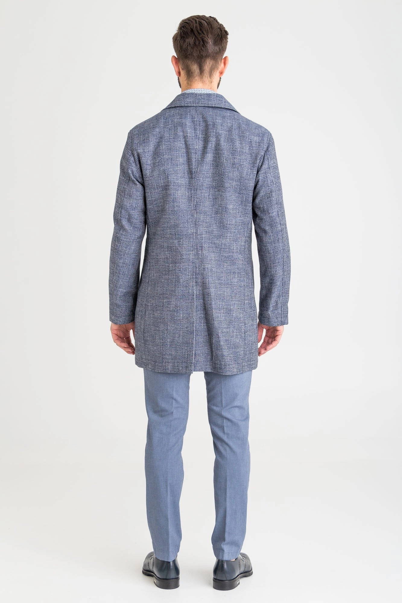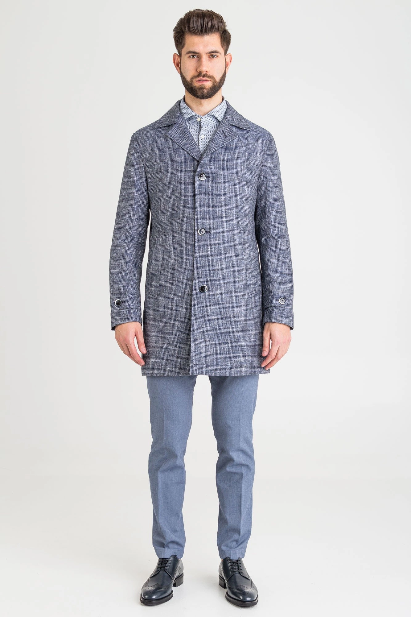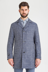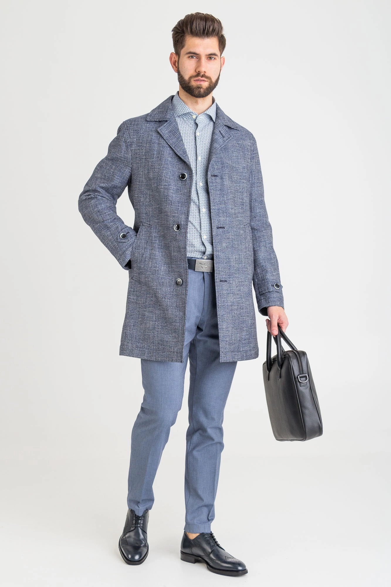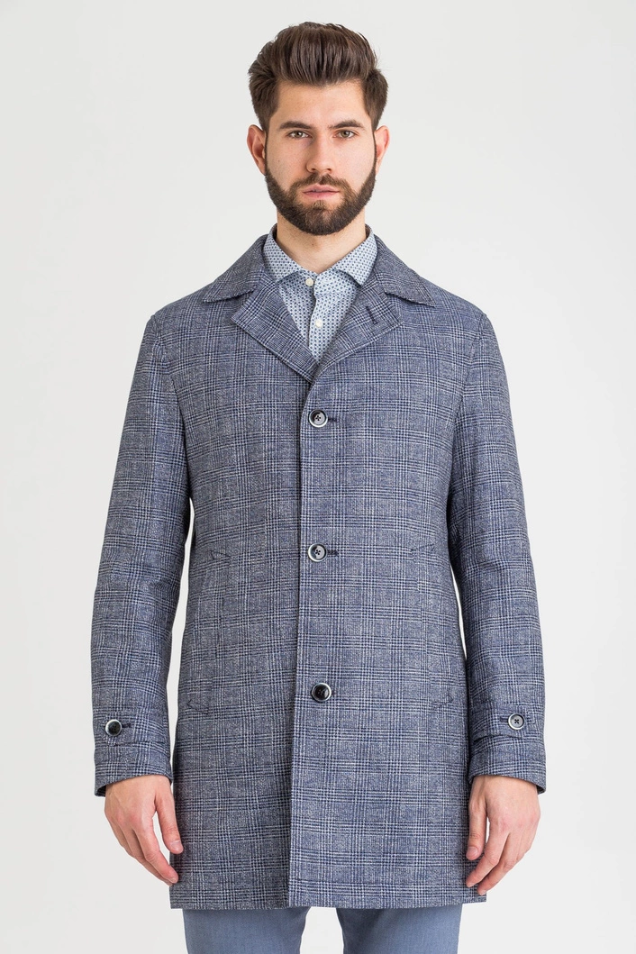 Płaszcz w niebieskim kolorze. Na całości wzór w pepitkę. Zapinany na guziki, sygnowane logo marki. Z przodu dwie, niezapinane kieszenie. Jedna wewnętrzna kieszeń zapinana na guzik. Na rękawie patka z ozdobnym guzikiem. Z tyłu rozcięcie. Płaszcz wykonany z wysokiej jakości materiałów. Przyjemny w dotyku i wygodny.