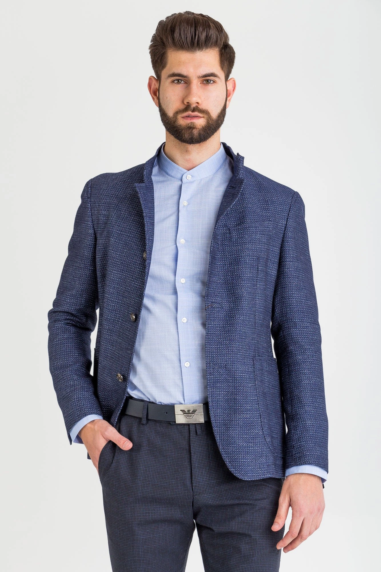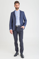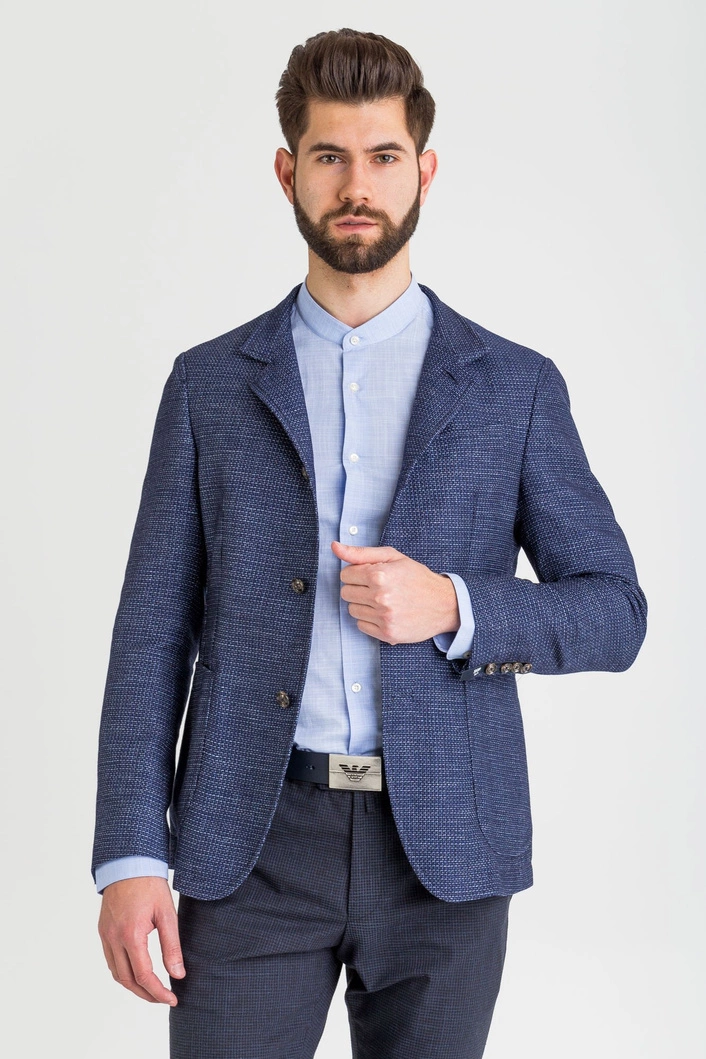 Marynarka w kolorze granatowym. Na całości wzór. Pod szyją stójka. Jednorzędowa, zapinana na guziki, sygnowane logo marki. Z przodu dwie, niezapinane kieszenie oraz niewielka kieszeń na butonierkę. Rękaw prosty wykończony rzędem guzików. Jednoszlicowa. Wykonana z najwyższej jakości materiałów, z dodatkiem żywej wełny.