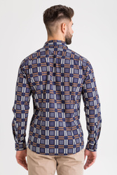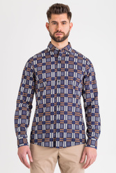 Koszula w granatowym kolorze. Na całości geometryczny wzór w odcieniach brązu i niebieskiego. Kołnierzyk typu włoskiego. Zapinana na granatowe guziki sygnowane nazwą marki. Rękawy wykończone ściętym mankietem, zapinane na jeden guzik. Po bokach granatowe wstawki z białym haftem nazwy marki. Koszula wykonana z wysokiej jakości bawełny.