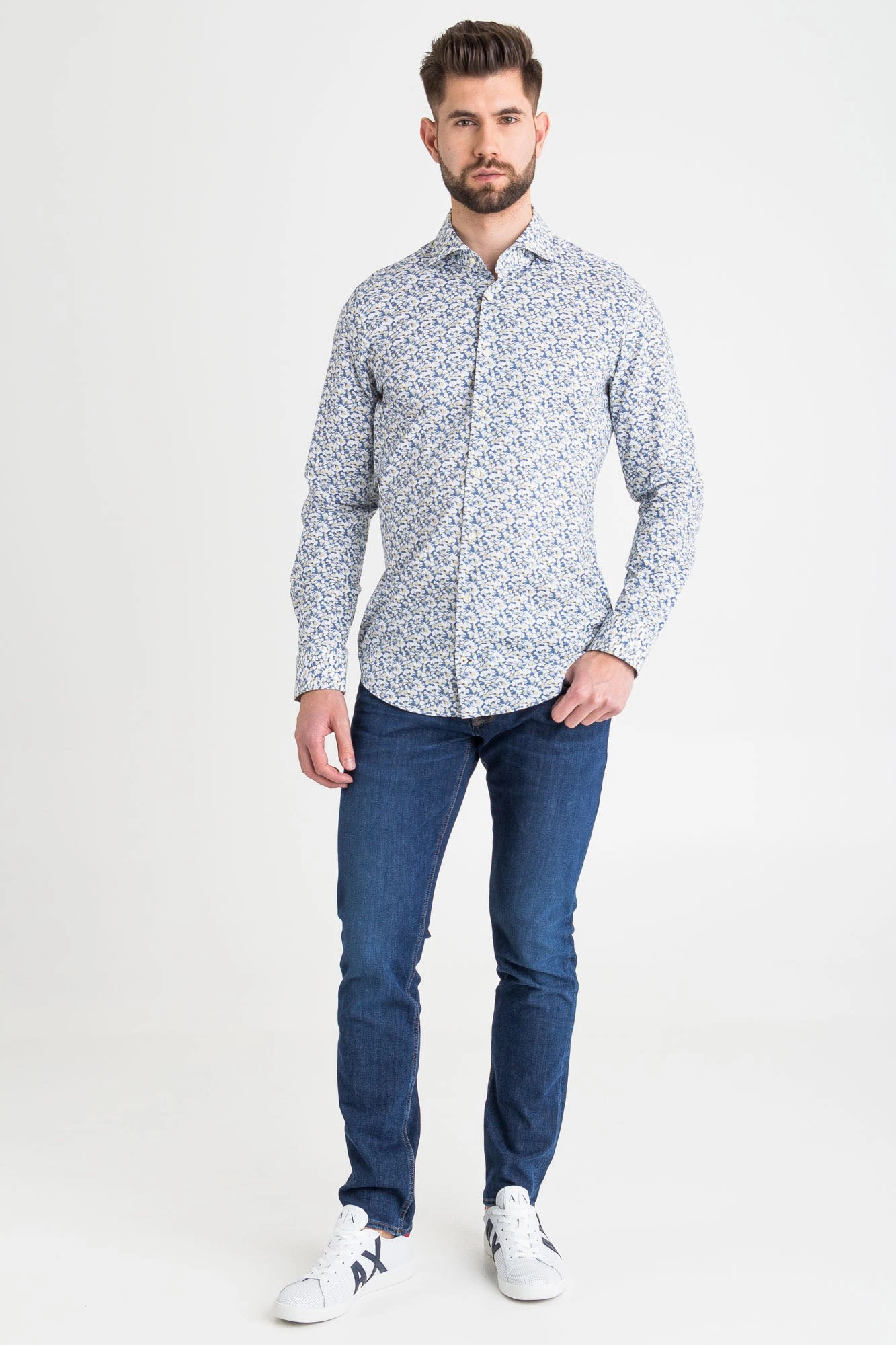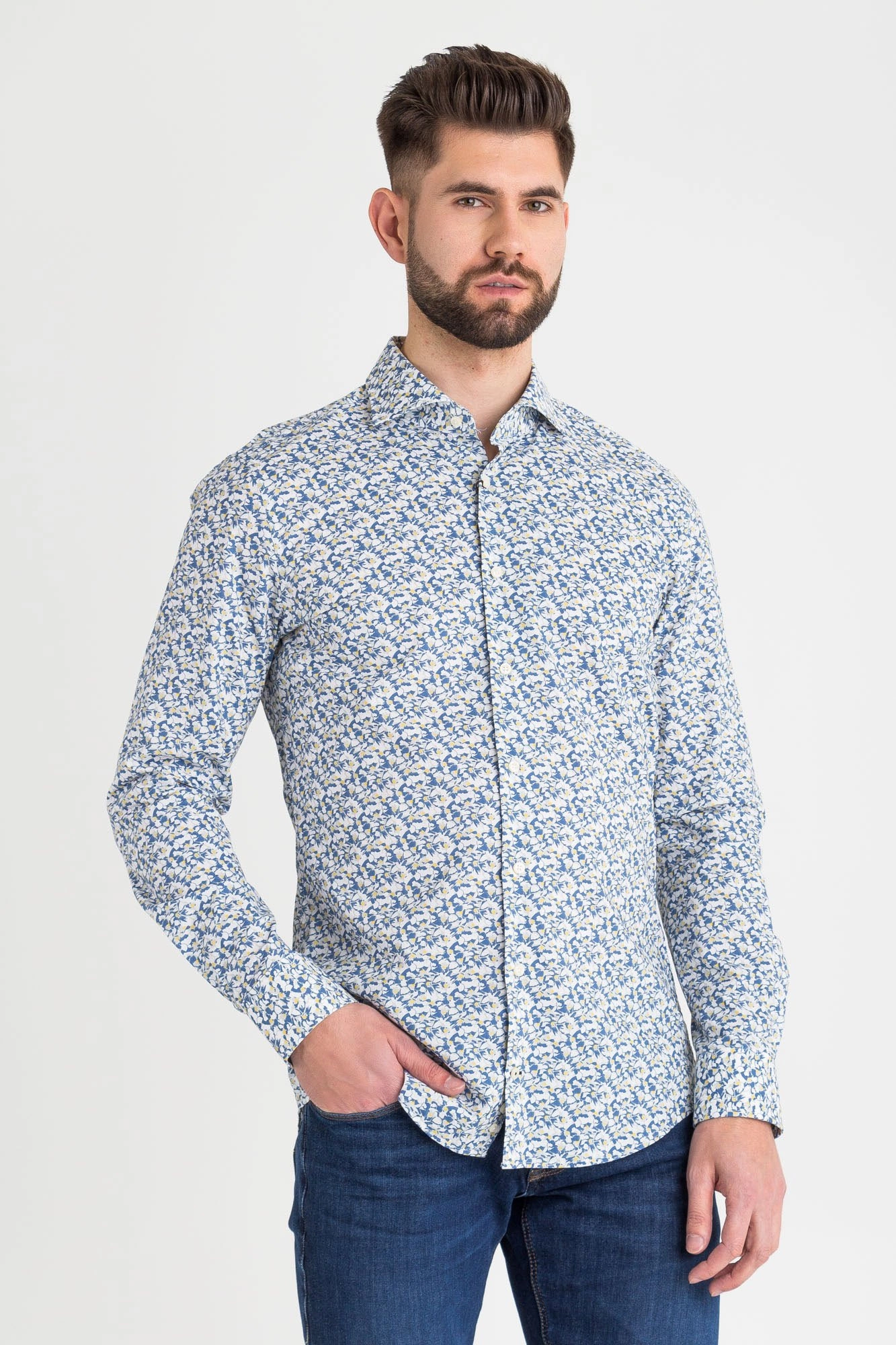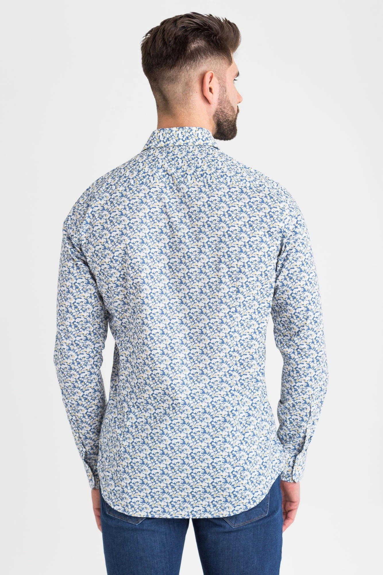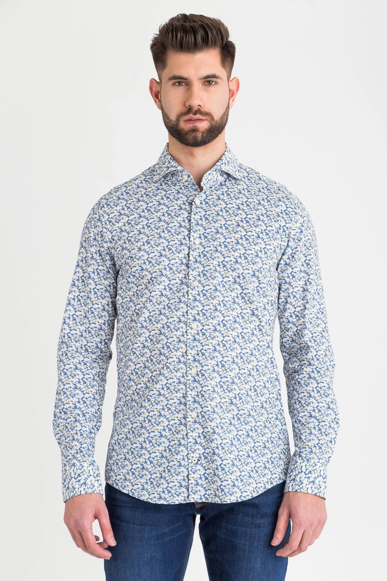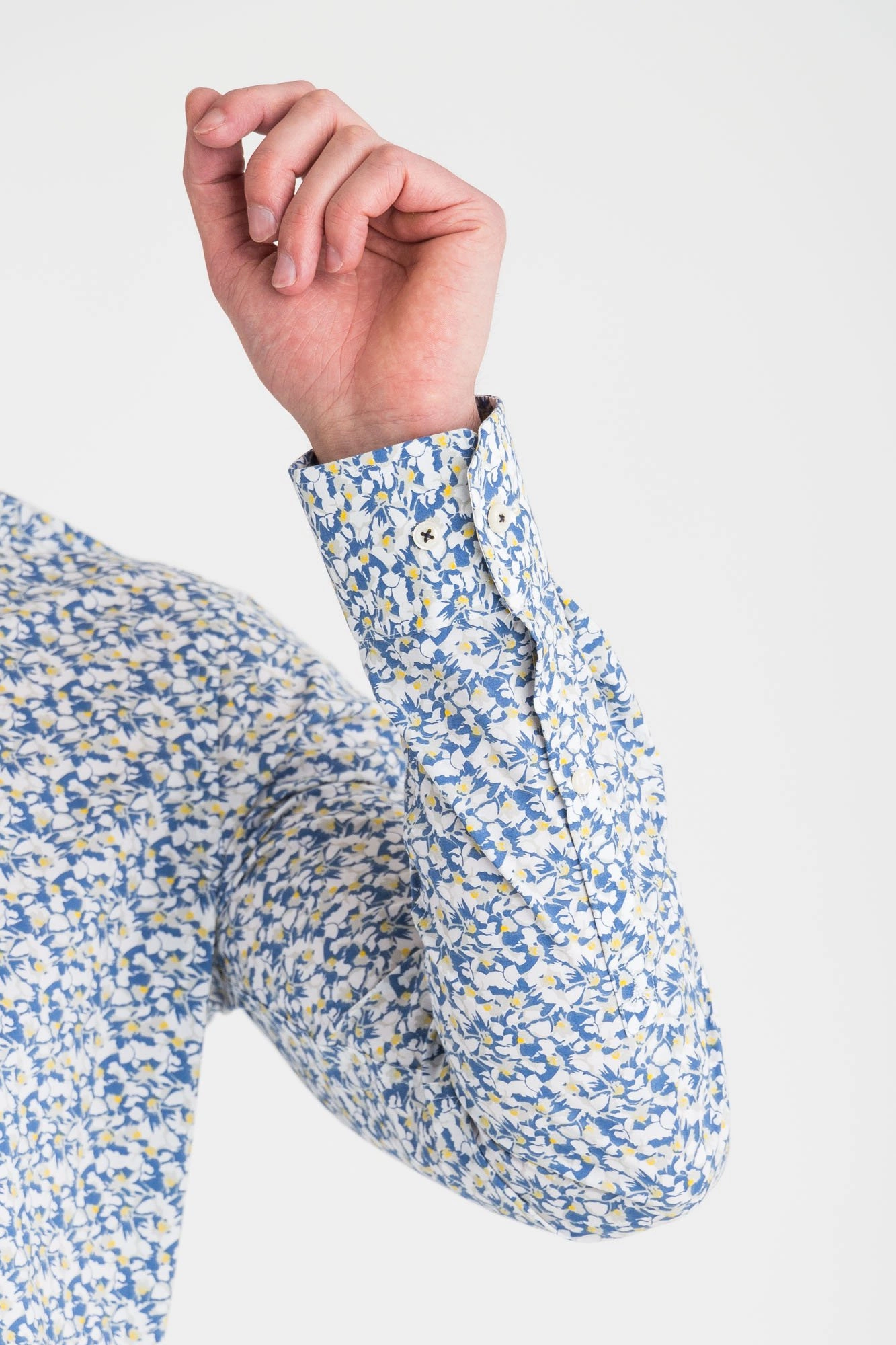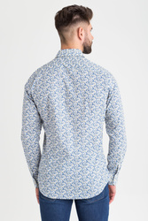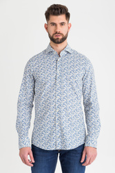 Bladoniebieska koszula w wielokolorowy wzór. Dopasowany krój. Kołnierzyk typu włoskiego. Zapinana na niewielkie, perłowe guziki. Rękawy wykończone ściętym mankietem, zapinane na jeden guzik. Koszula wykonana z wysokiej jakości bawełny. Elegancka, przyjemna w dotyku.
