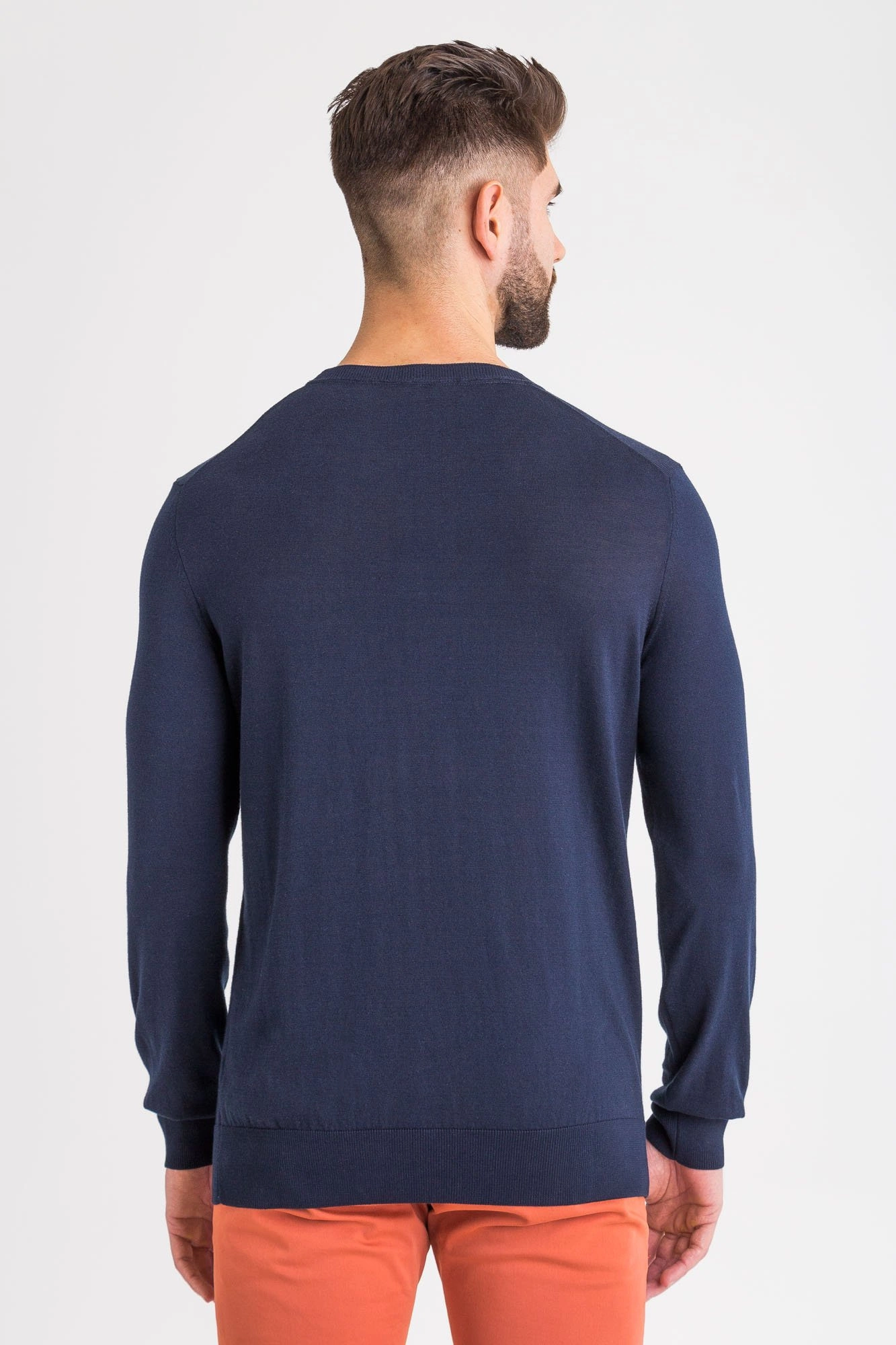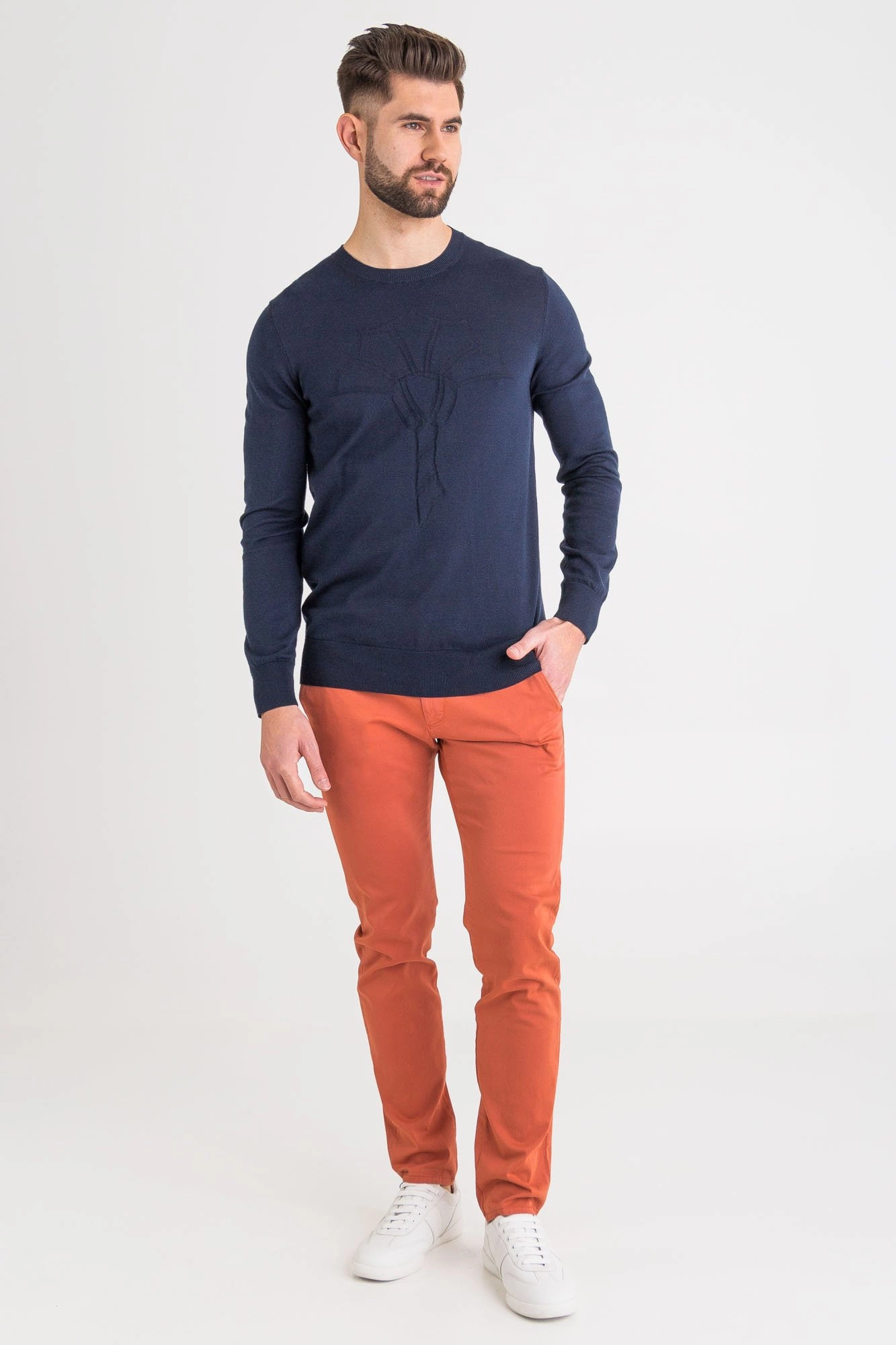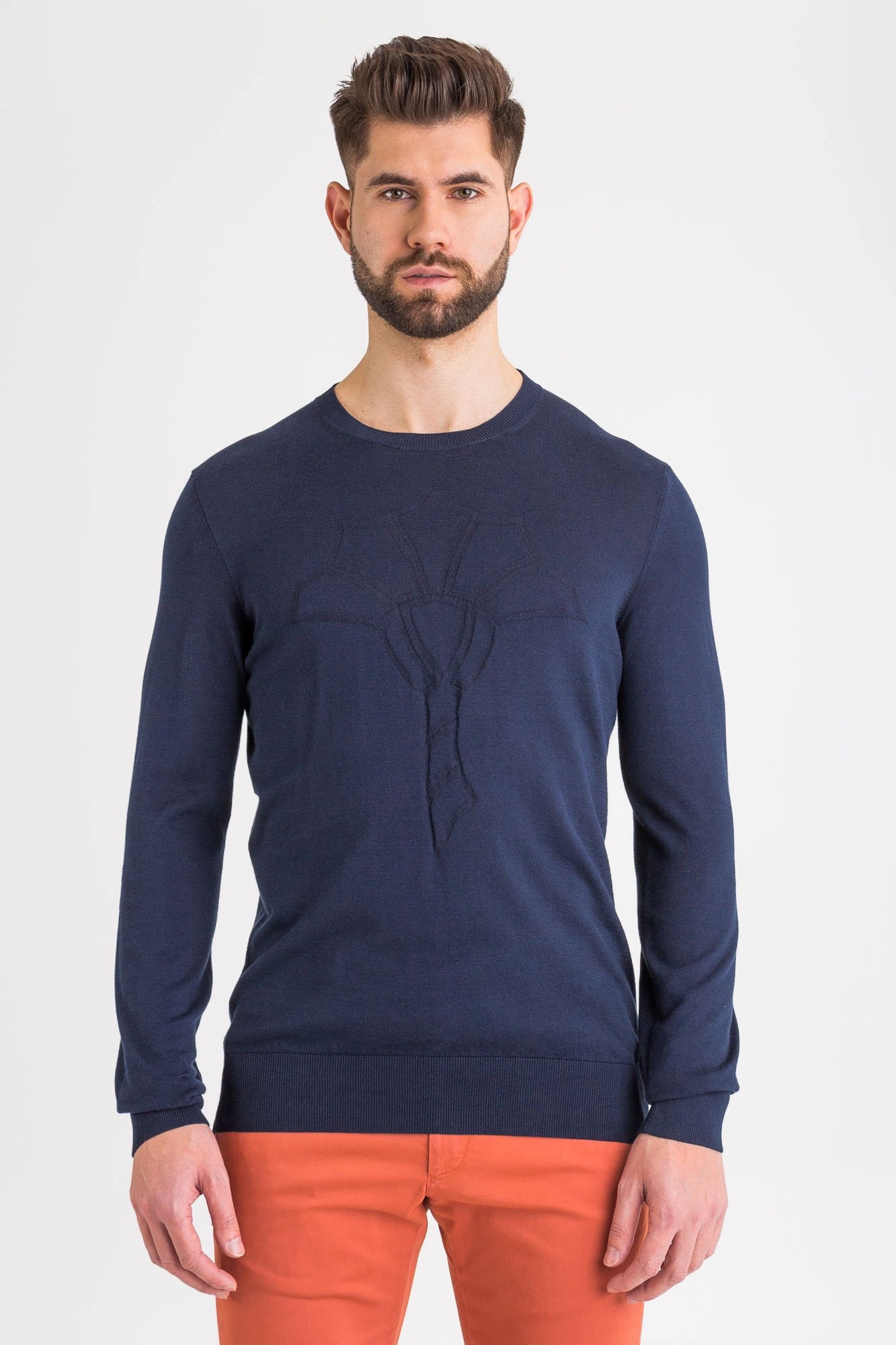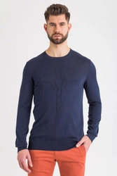 Sweter w granatowym kolorze. Dekolt typu o-neck. Z przodu wytłoczona aplikacja w postaci logo marki w tym samym kolorze. Góra, rękawy i dół wykończone ściągaczem. Wykonany z wysokiej jakości bawełny. Miękki i przyjemny w dotyku.