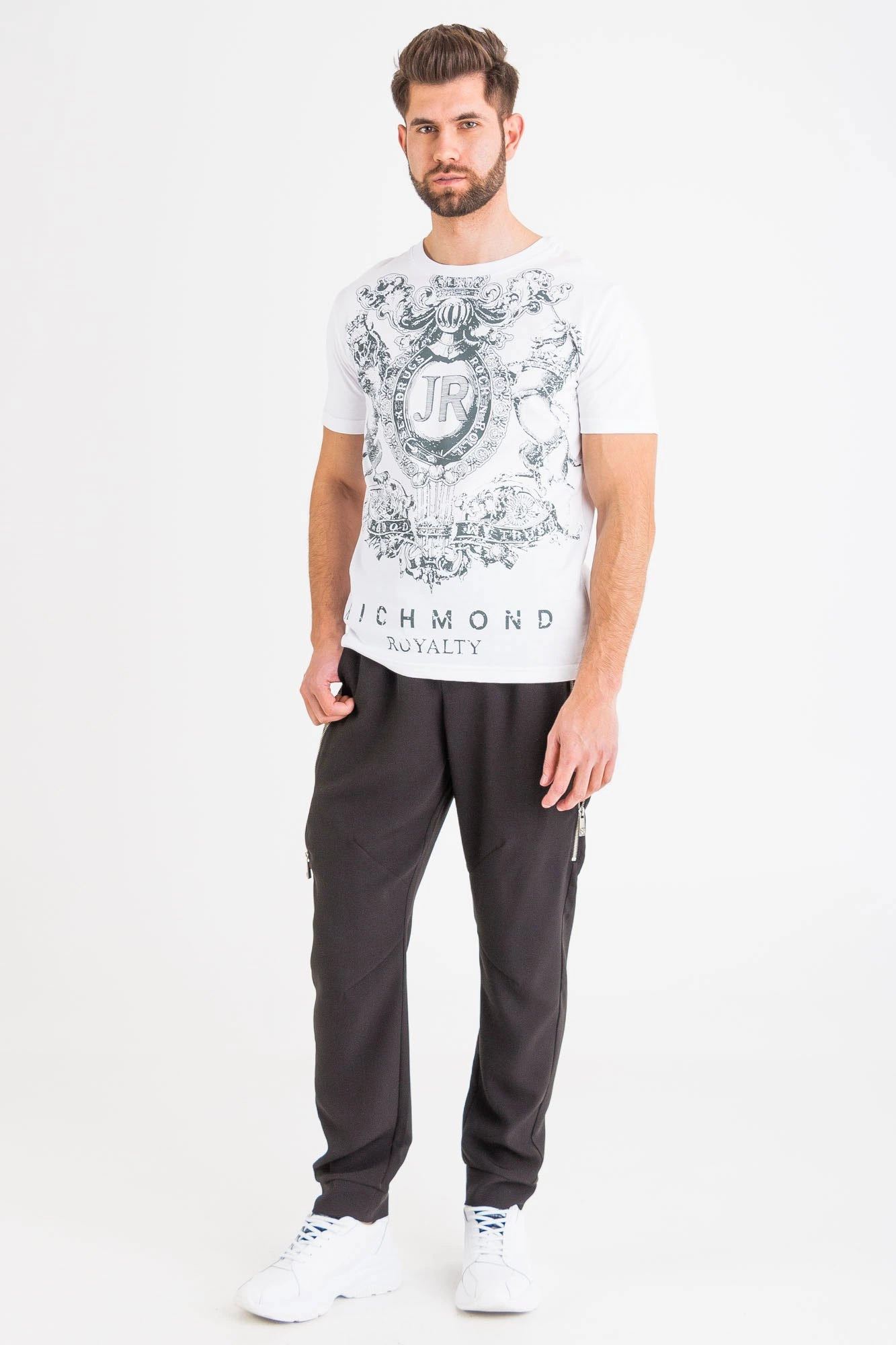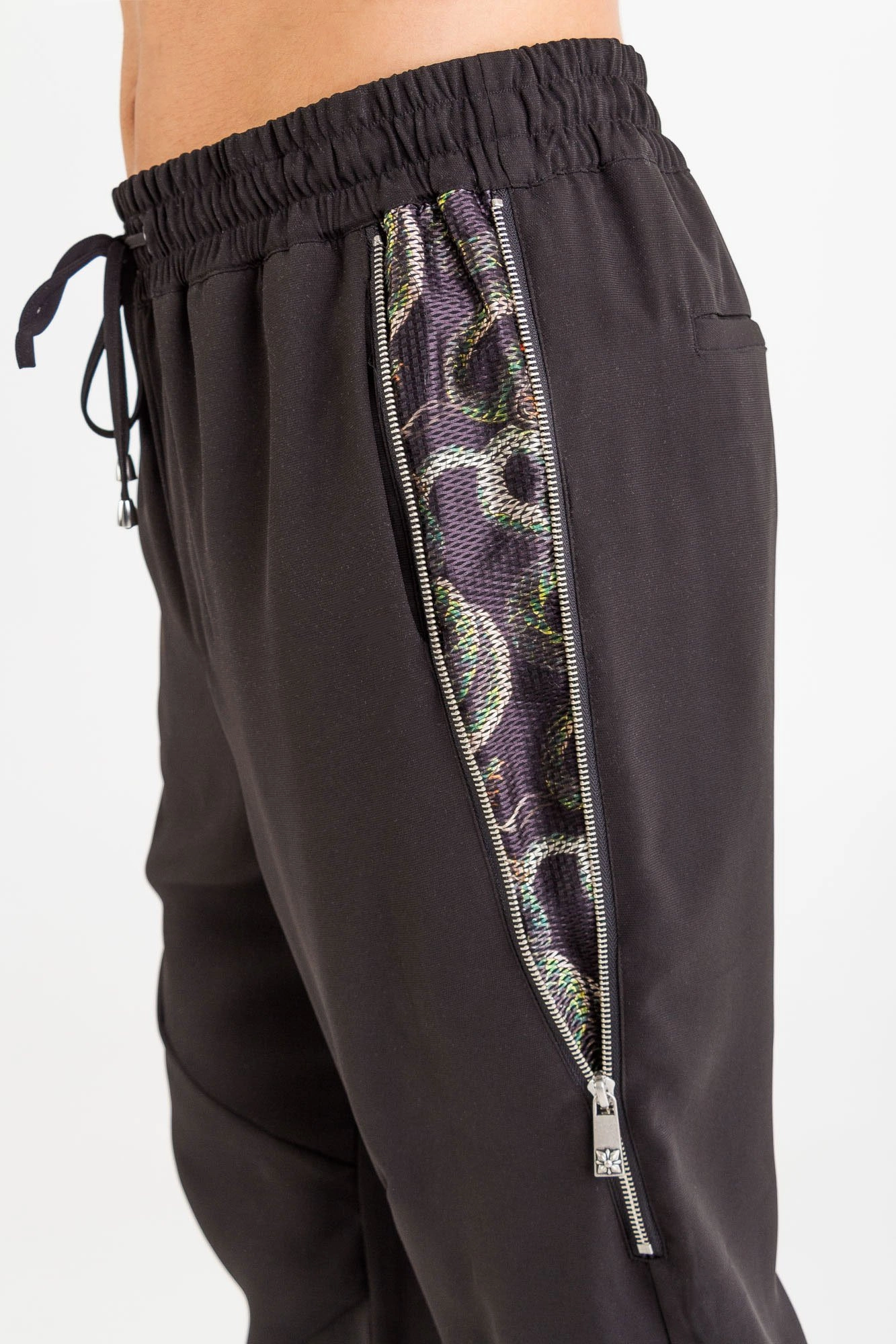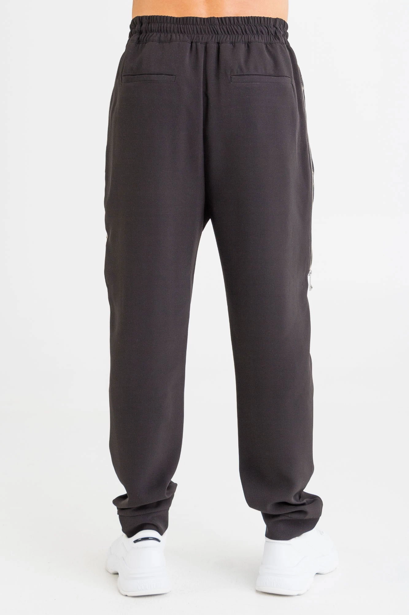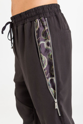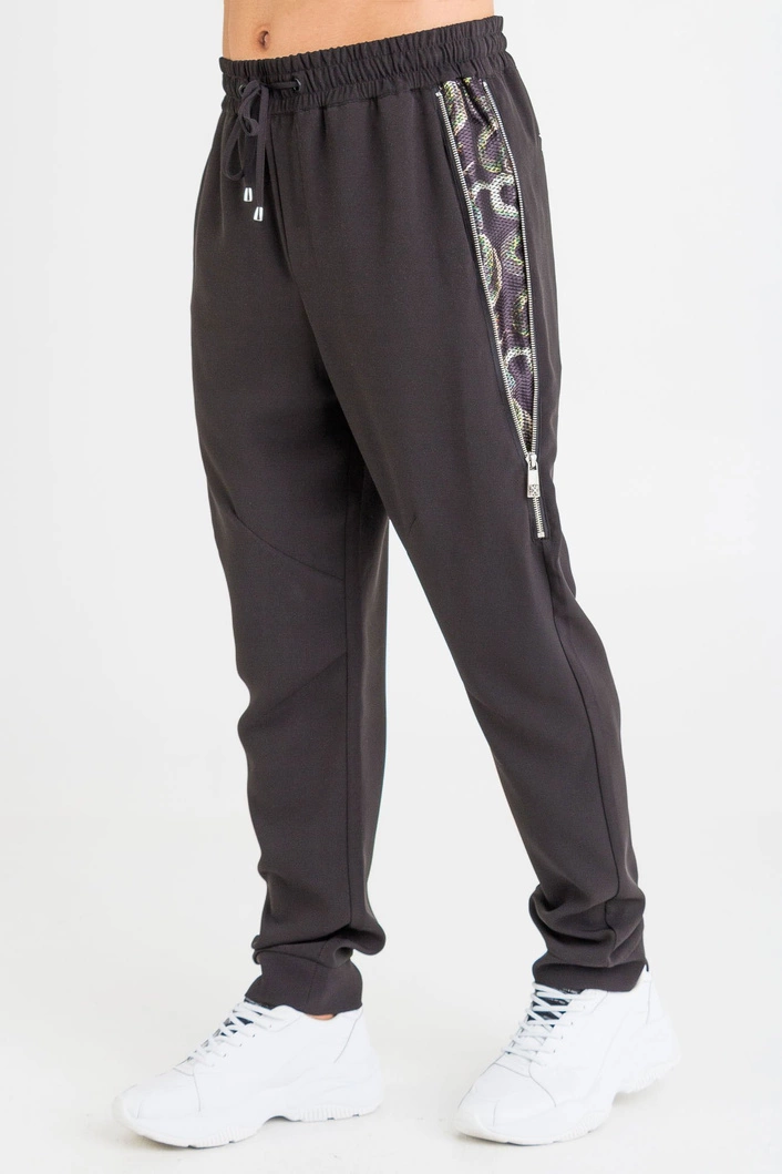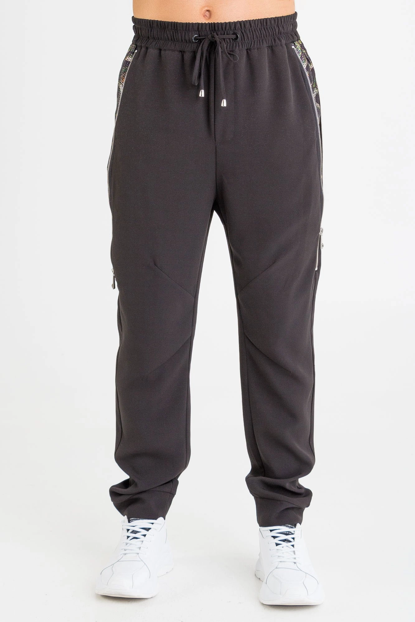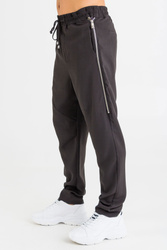 Spodnie dresowe w czarnym kolorze. Pas regulowany za pomocą troczków, wykończonych srebrnymi agletami. Z boku ozdobne, srebrne zamki, pod nimi wstawka z innego typu materiału. Nogawki wykończone ściągaczem. Spodnie dresowe wykonane z wysokiej jakości materiałów. Miękkie i wygodne.