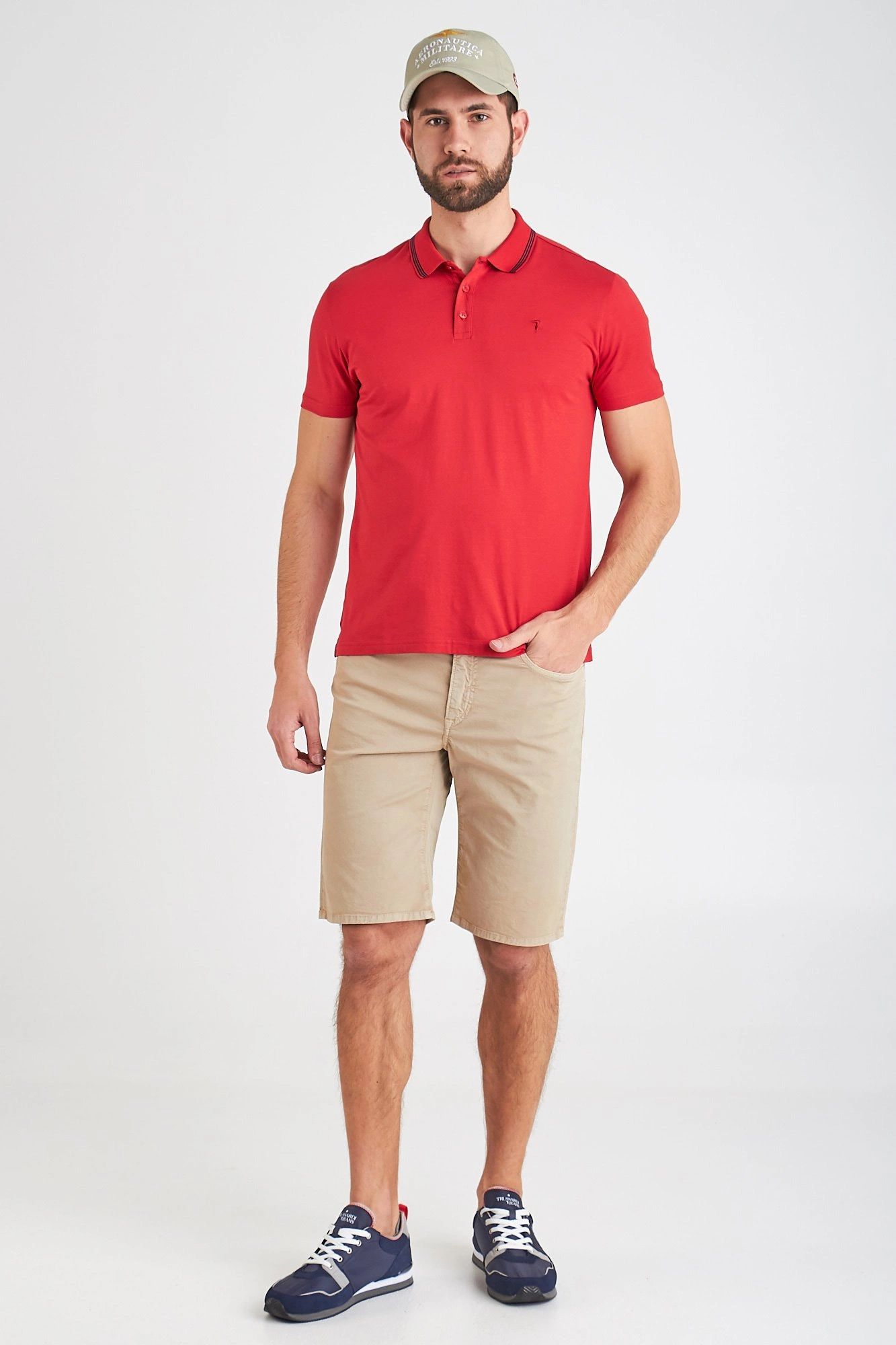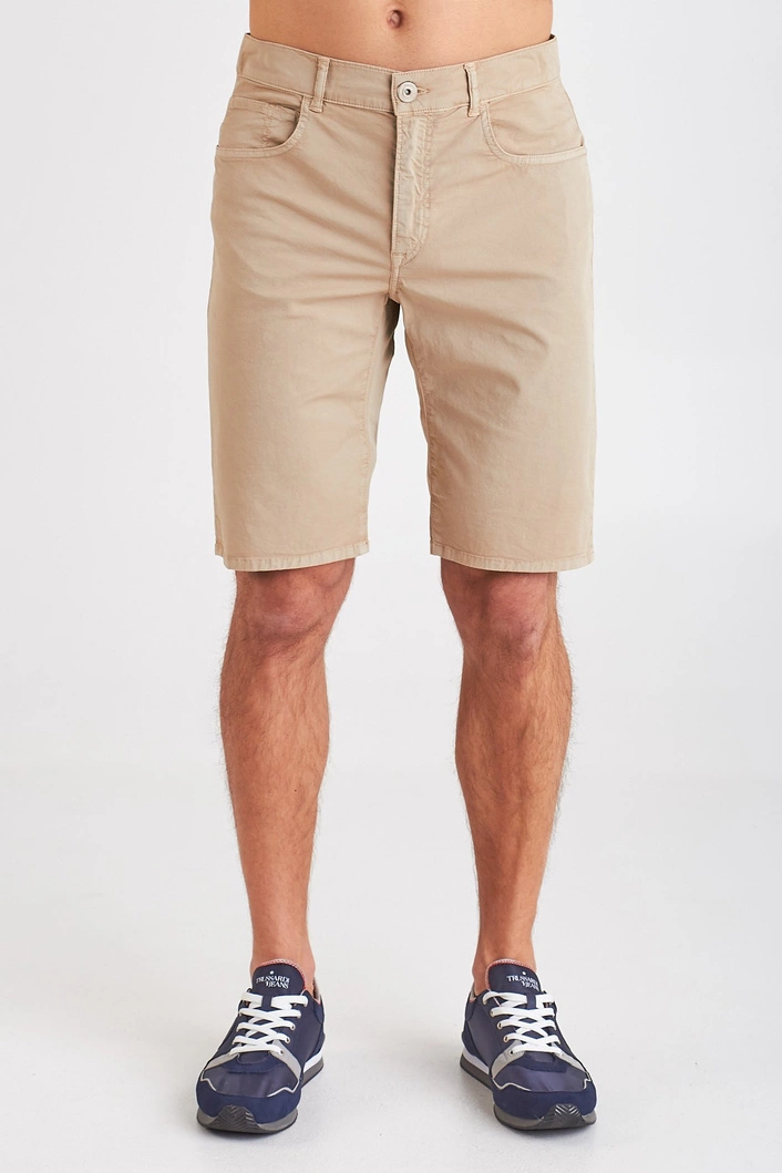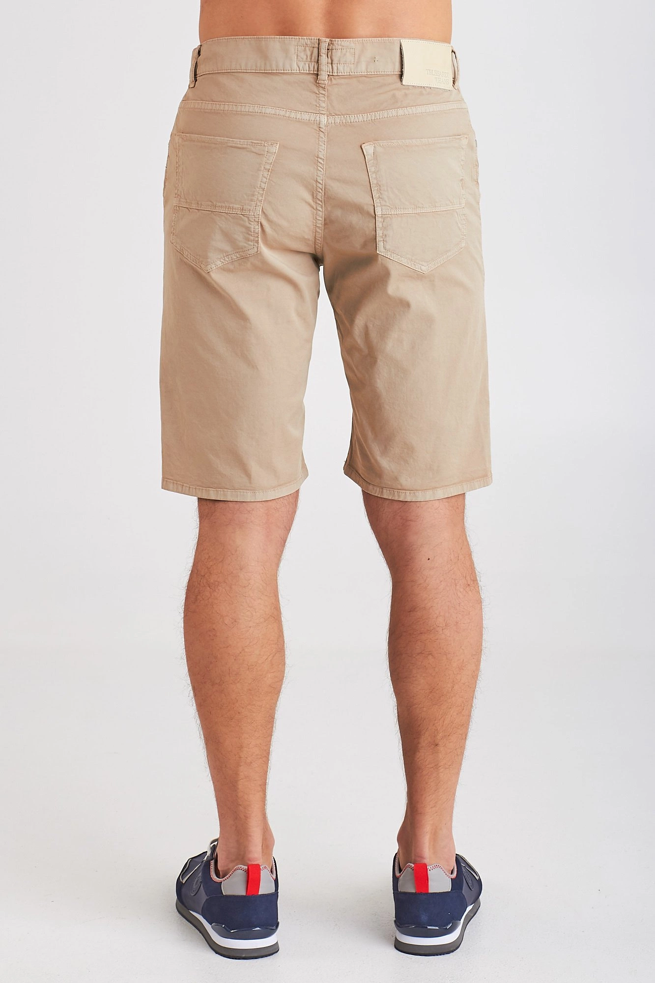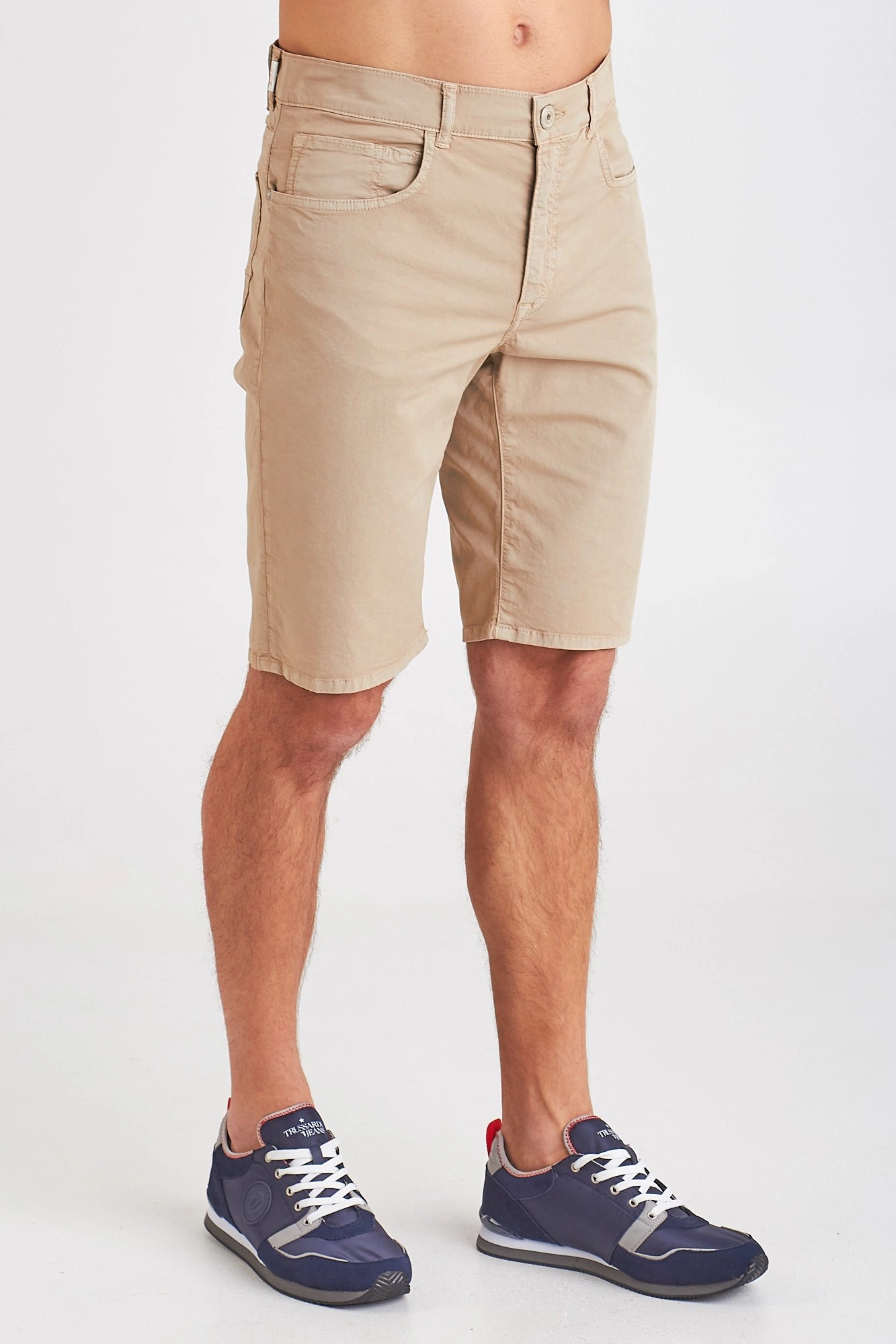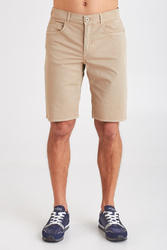 Bermudy w kolorze beżowym. Zapinane na guzik i suwak. Fason slim. Po bokach dwie kieszenie. Z tyłu również dwie kieszenie i czarna aplikacja z wytłoczoną nazwą marki. Wygodne, komfortowe , klasyczne bermudy. Wykonane z wysokiej jakości materiałów.