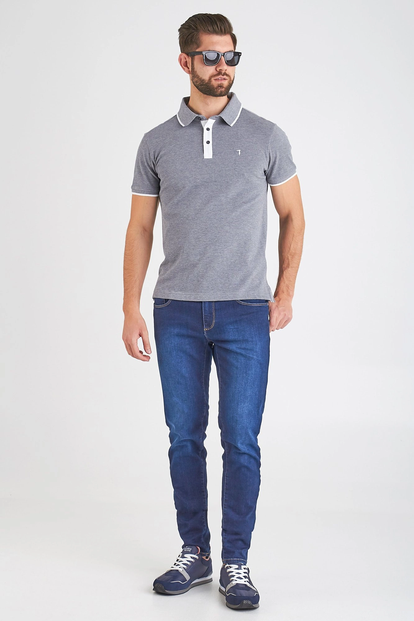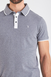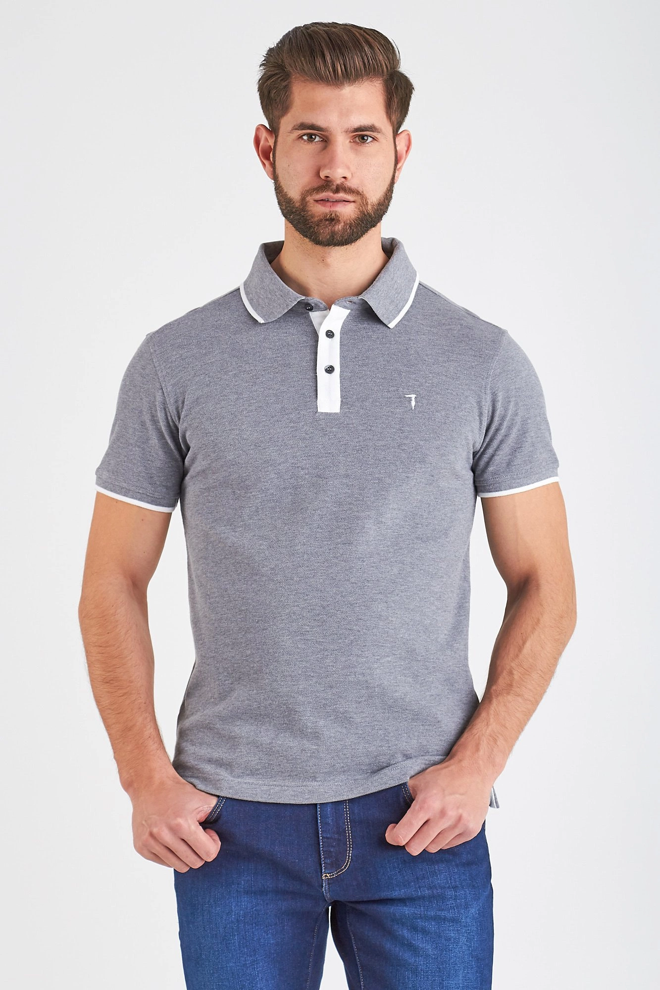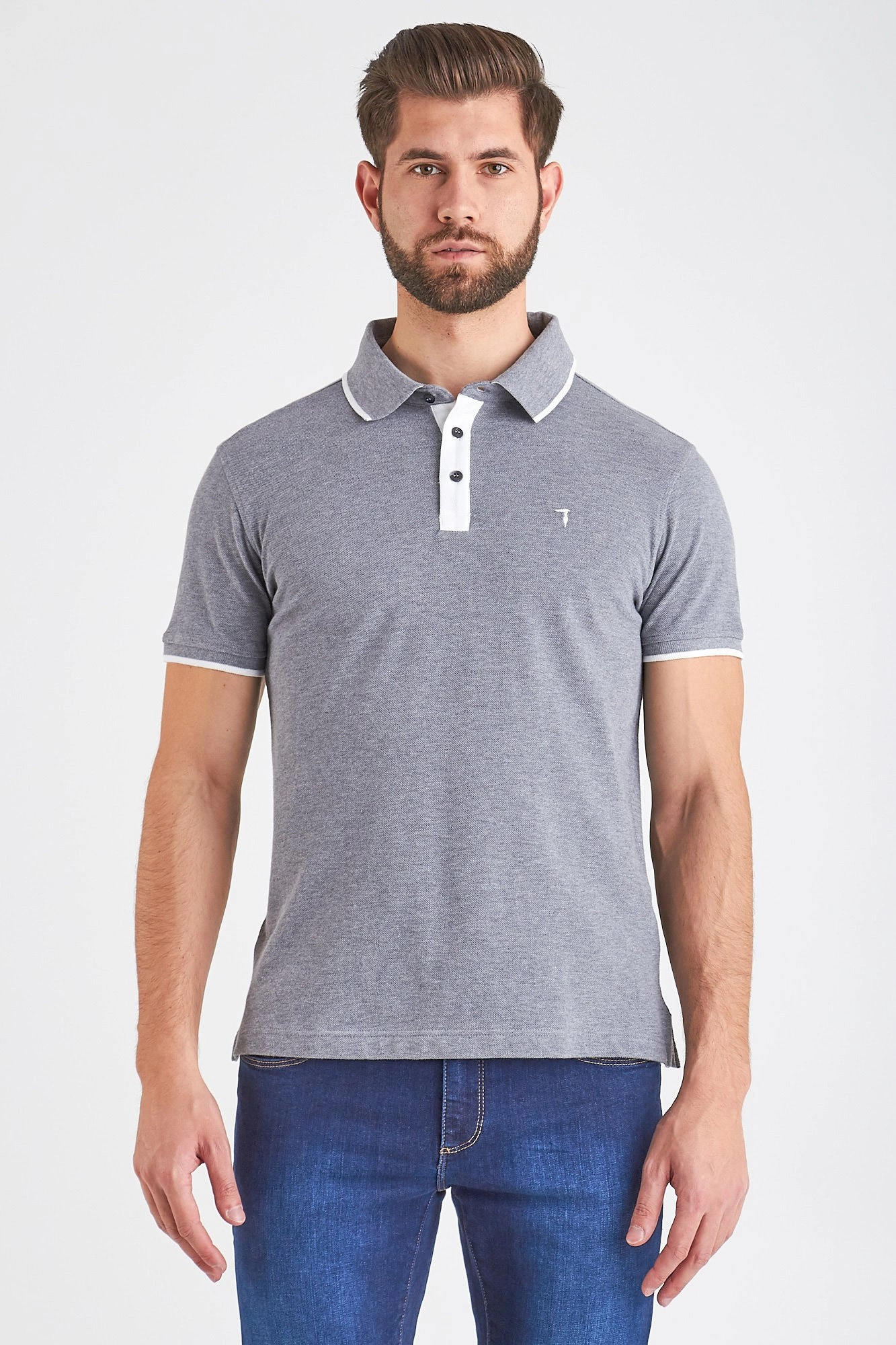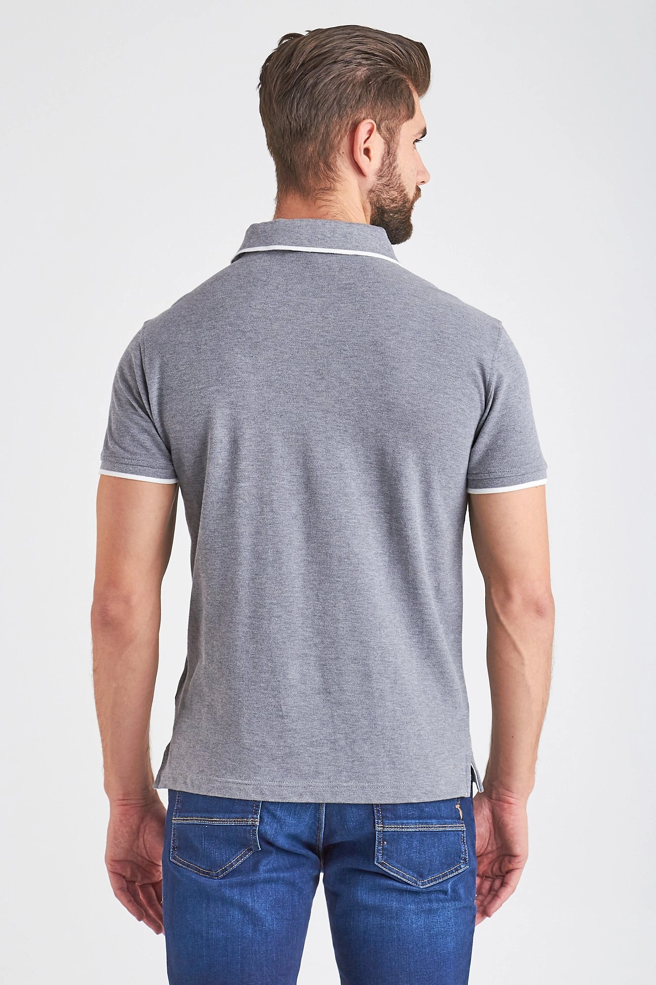 Klasyczne polo w kolorze szarego melanżu. Dopasowany fason. Zapinane na trzy, granatowe guziki. Z przodu niewielki, biały haft z logo marki. Rękaw wykończony ściągaczem z białą lamówką. Po bokach niewielkie rozcięcia. Wykonane z wysokiej jakości materiałów. Wygodne i lekkie.