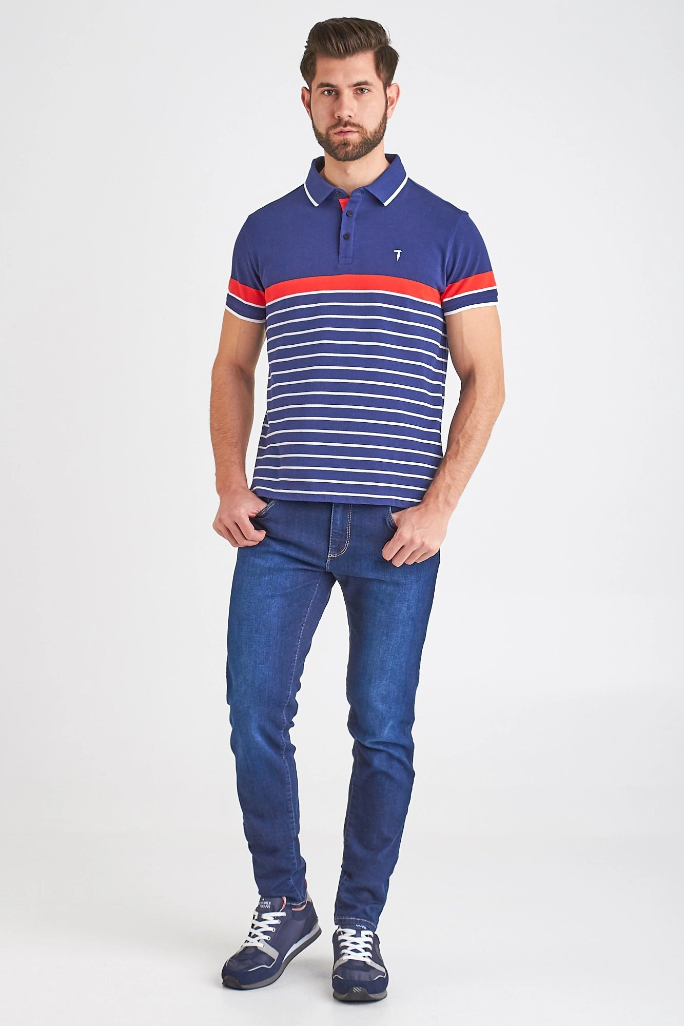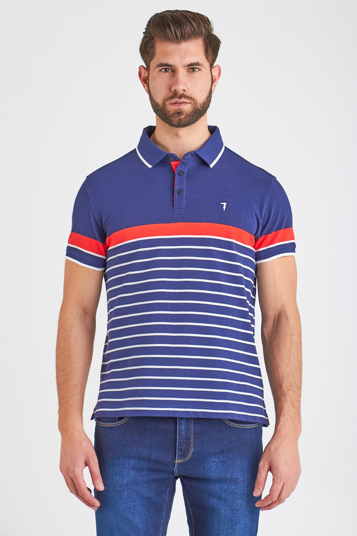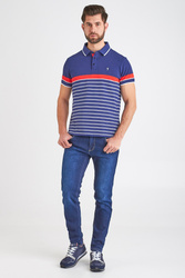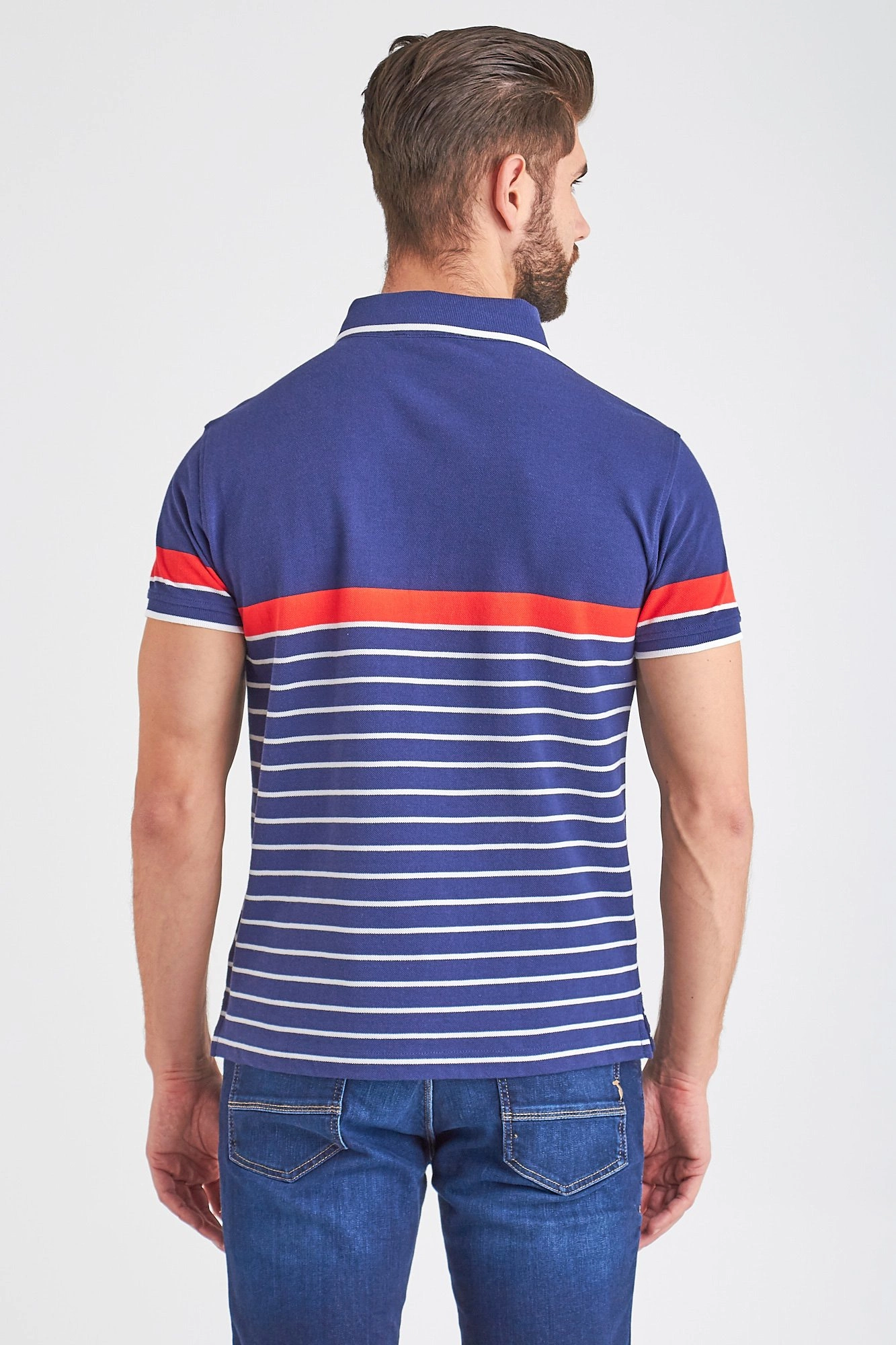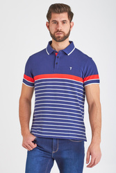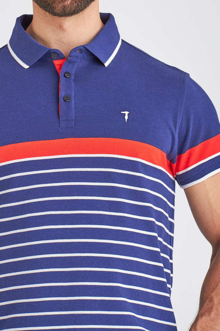 Granatowe polo w biało-czerwone paski. Dopasowany fason. Zapinane na trzy, sygnowane nazwą marki guziki. Z przodu niewielki, biały haft z logo marki. Rękaw wykończony ściągaczem z białą lamówką. Polo wykonane z wysokiej jakości materiałów. Wygodne i lekko elastyczne.