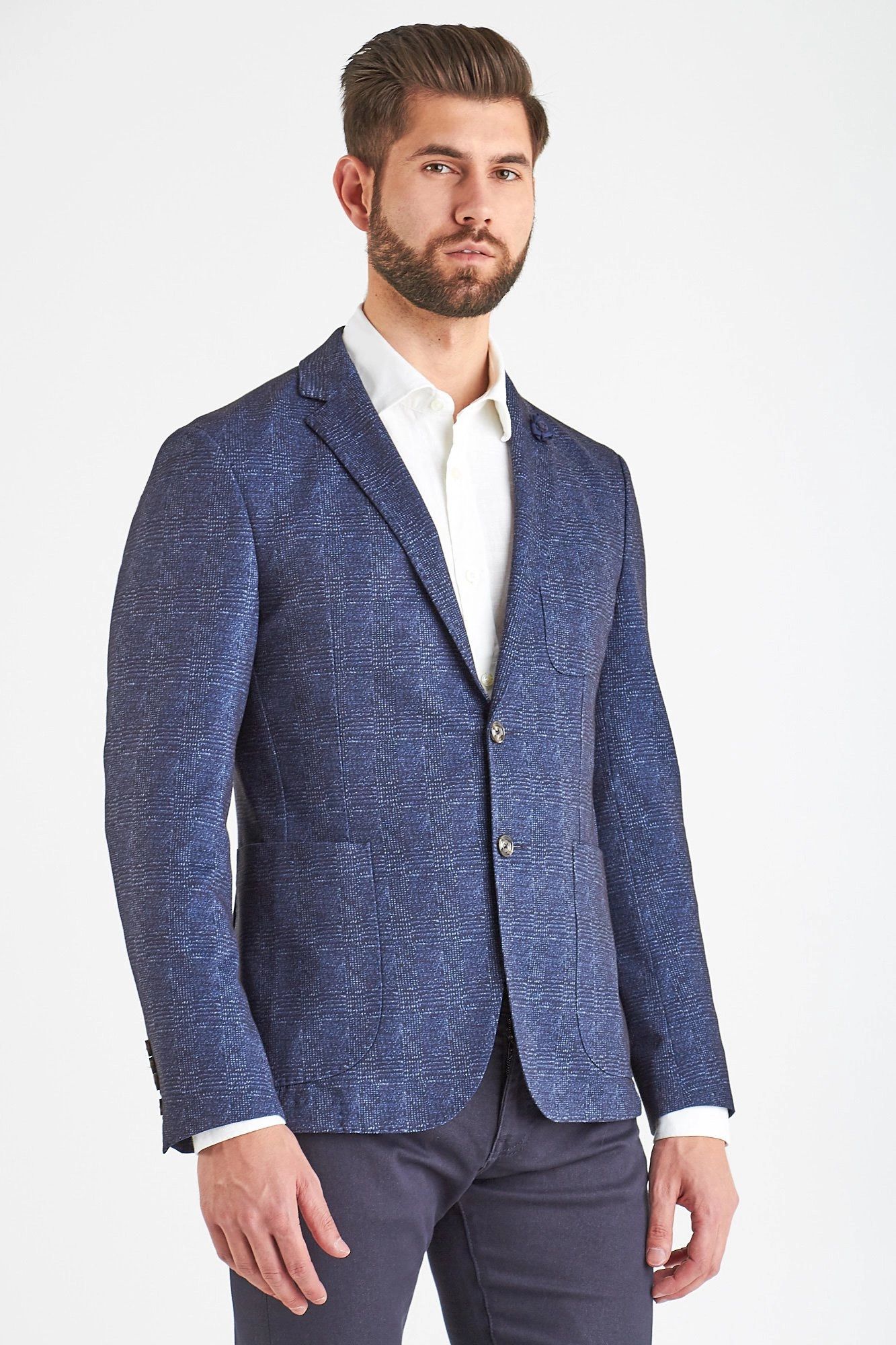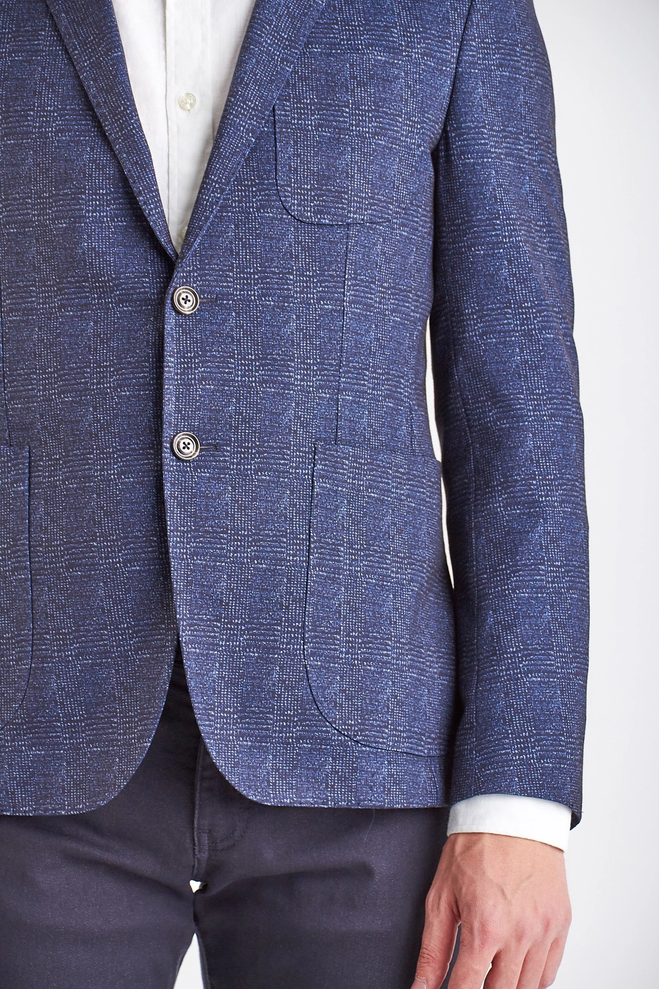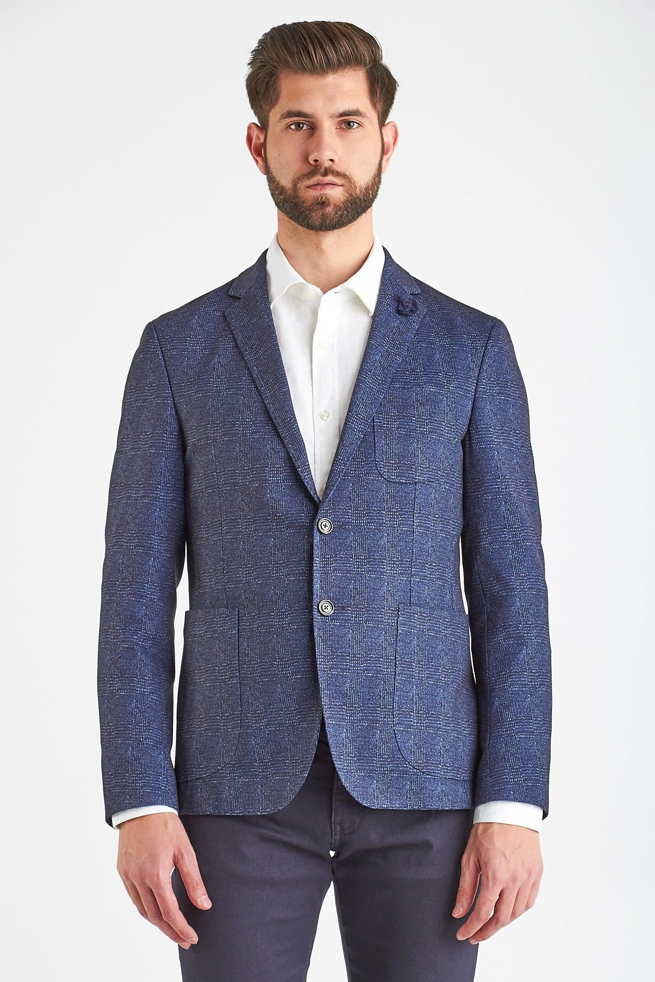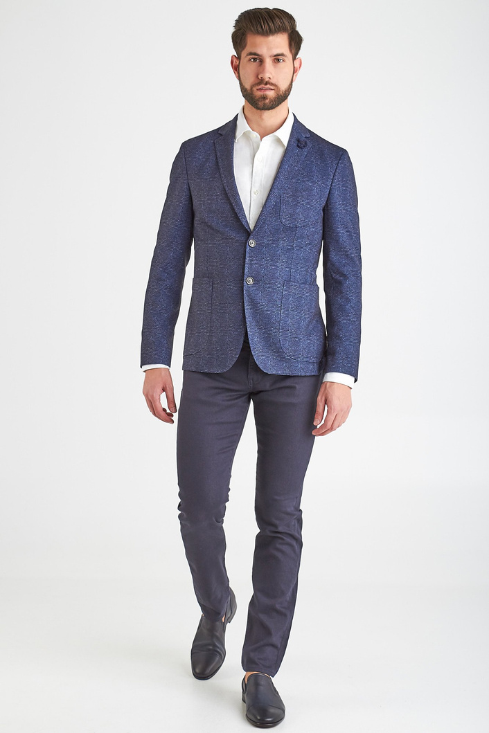 Marynarka w kolorze ciemnego granatu. Jednorzędowa. Zapinana na dwa guziki, sygnowane logo marki. Fason slim fit. Klapy otwarte. Z przodu naszyte dwie kieszenie oraz butonierka. Rękaw prosty, wykończony rzędem guzików. Dwuszlicowa. Wykonana z najwyższej jakości materialów.
