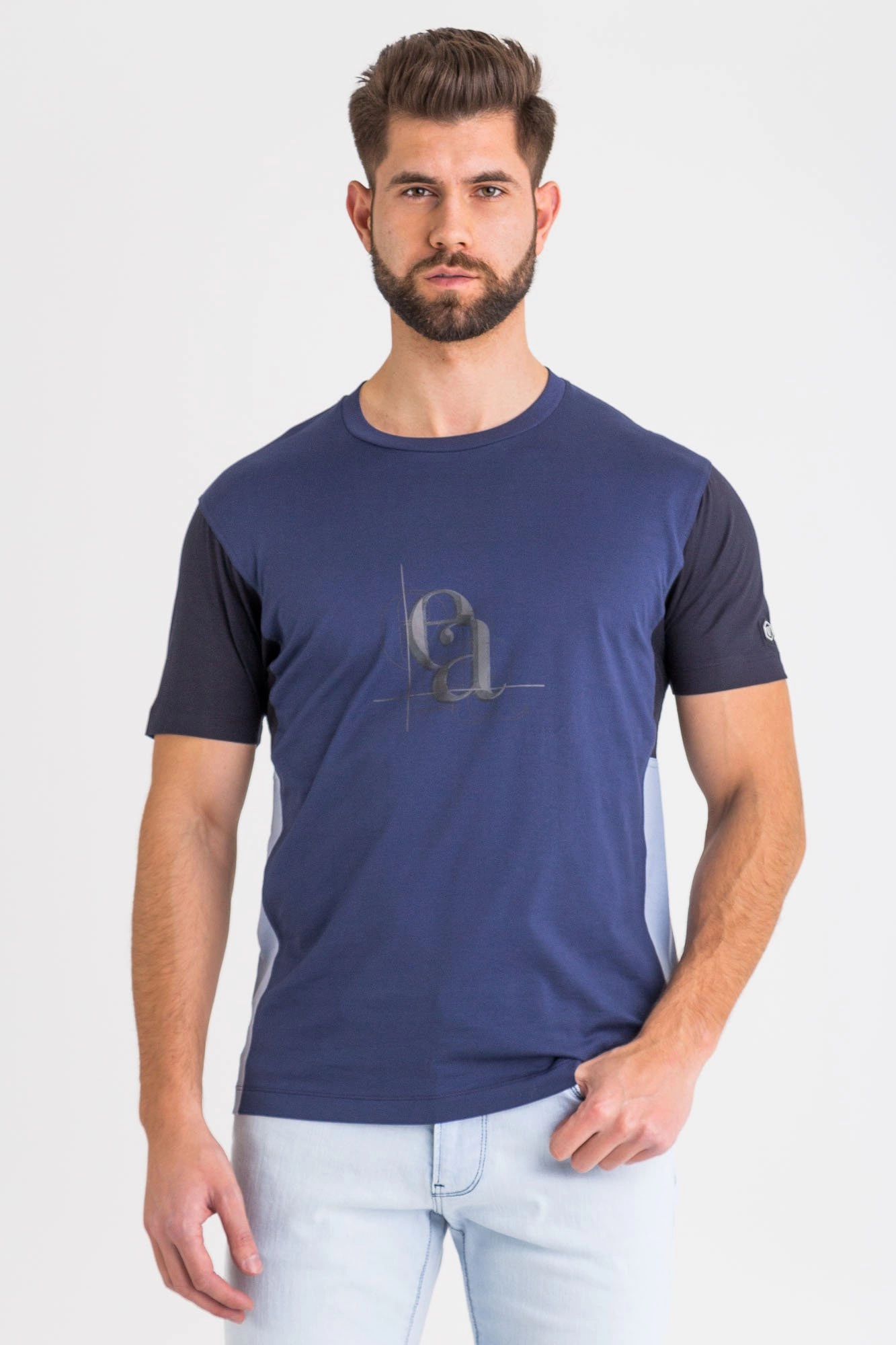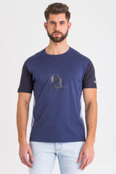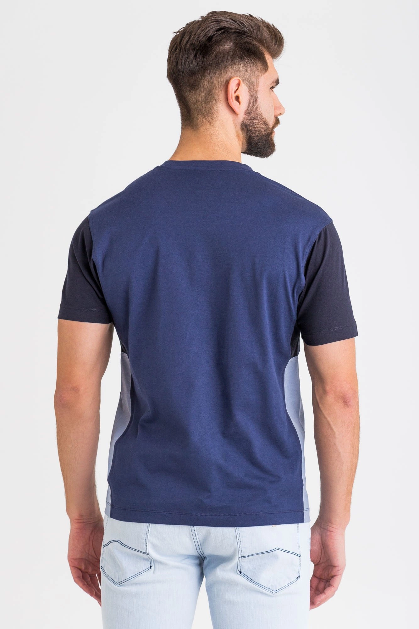 T-shirt w kolorze granatowym. Dekolt typu o-neck, wykończony ściągaczem. Z przodu duży nadruk w postaci logo marki. Rękawy w kolorze czarnym. Na lewym rękawie niewielka aplikacja w postaci logo marki. Po bokach wstawki w kolorze błękitnym. T-shirt wykonany z wysokiej jakości bawełny . Miękki, wygodny i lekko elastyczny.