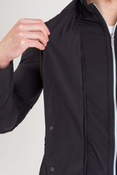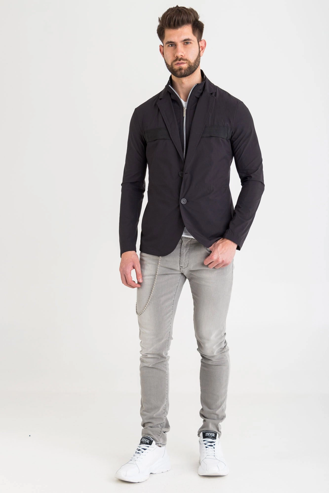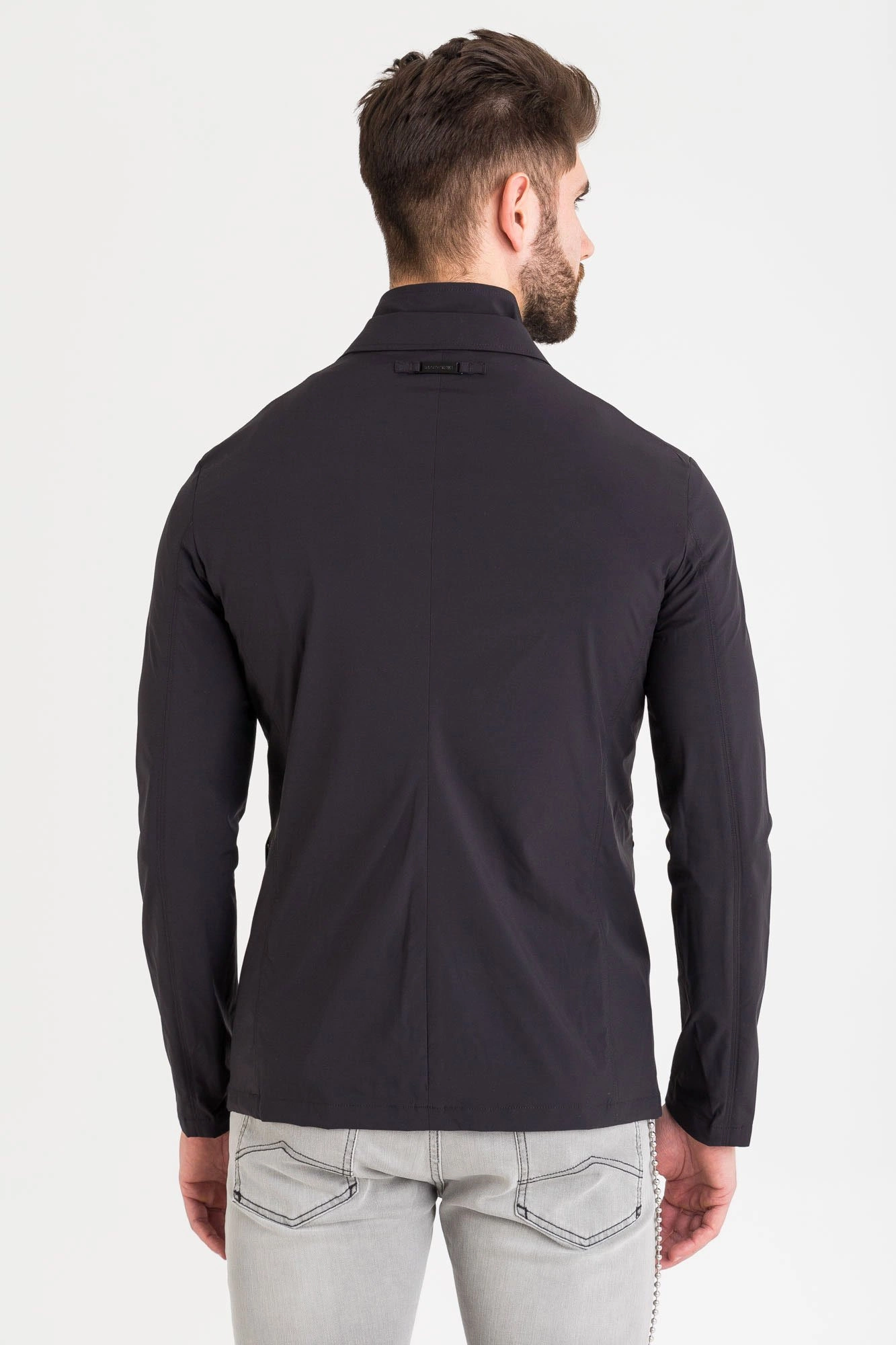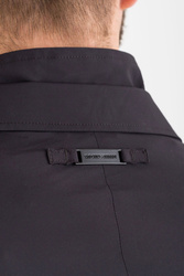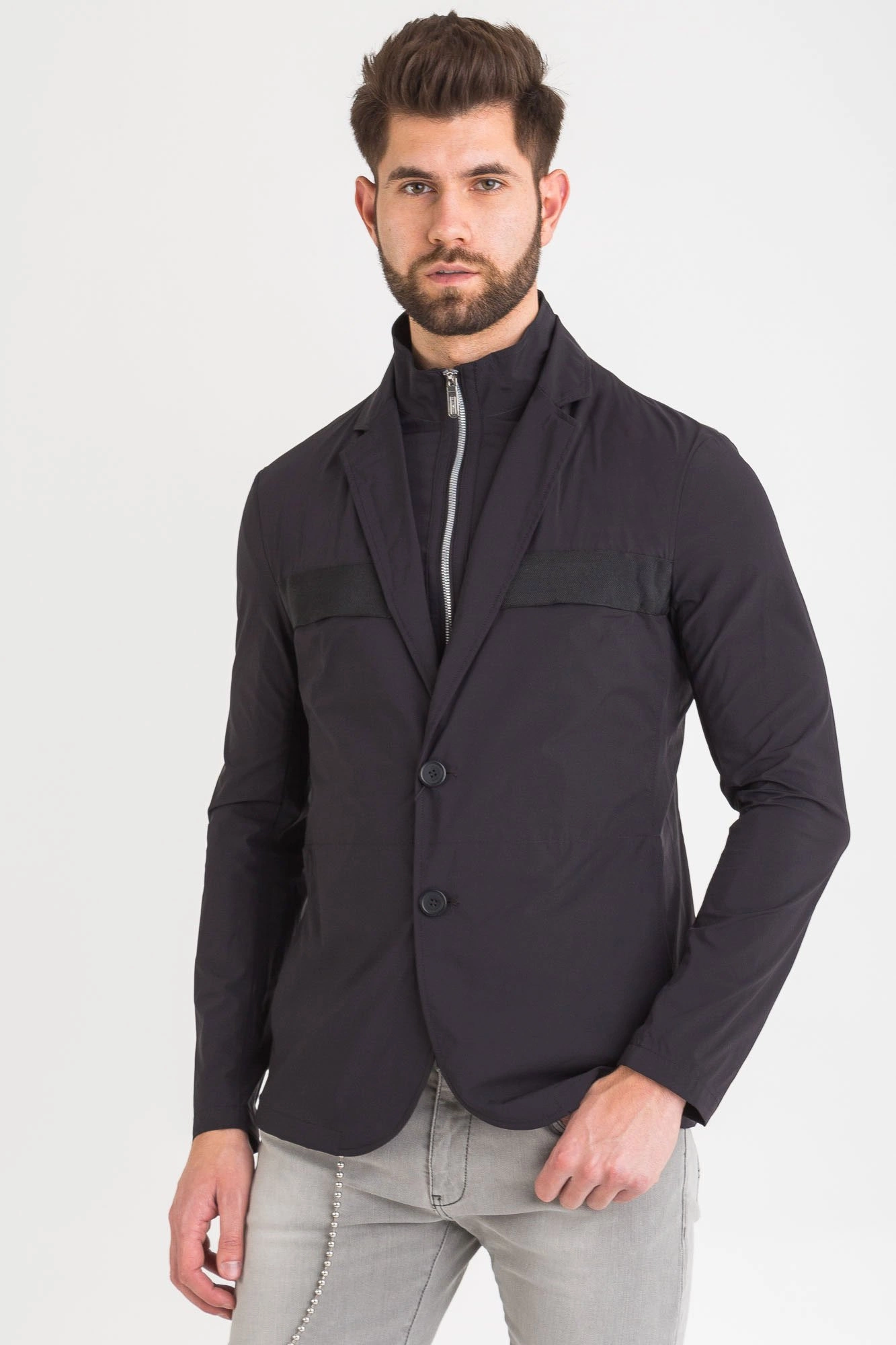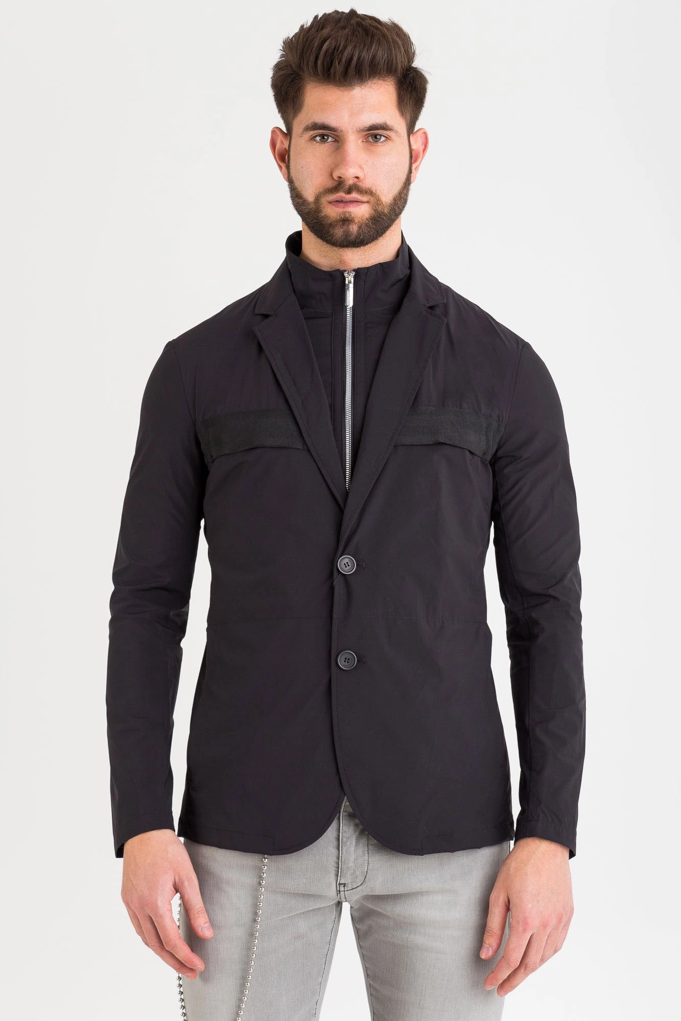 Marynarka w kolorze czarnym. Zapinana na guziki w tym samym kolorze. Klapy otwarte. Po bokach dwie, zapinane na zamek kieszenie oraz dwie kieszenie ukryte pod czarną taśmą. Z tyłu, na wysokości karku, niewielka aplikacja z wytłoczoną nazwą marki. W środku odpinana wstawka zapinana na srebrny zamek z ozdobna zawieszką sygnowany logo marki. Wykonana z wysokiej jakości materiałów. Miękka i wygodna.