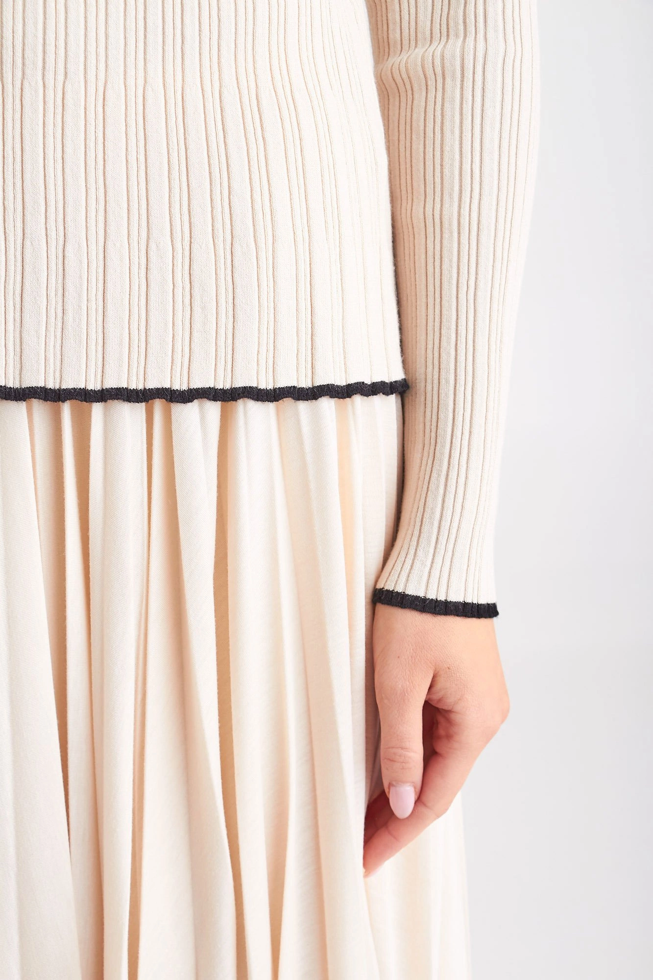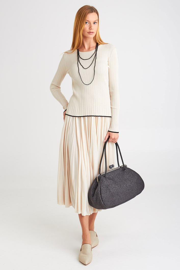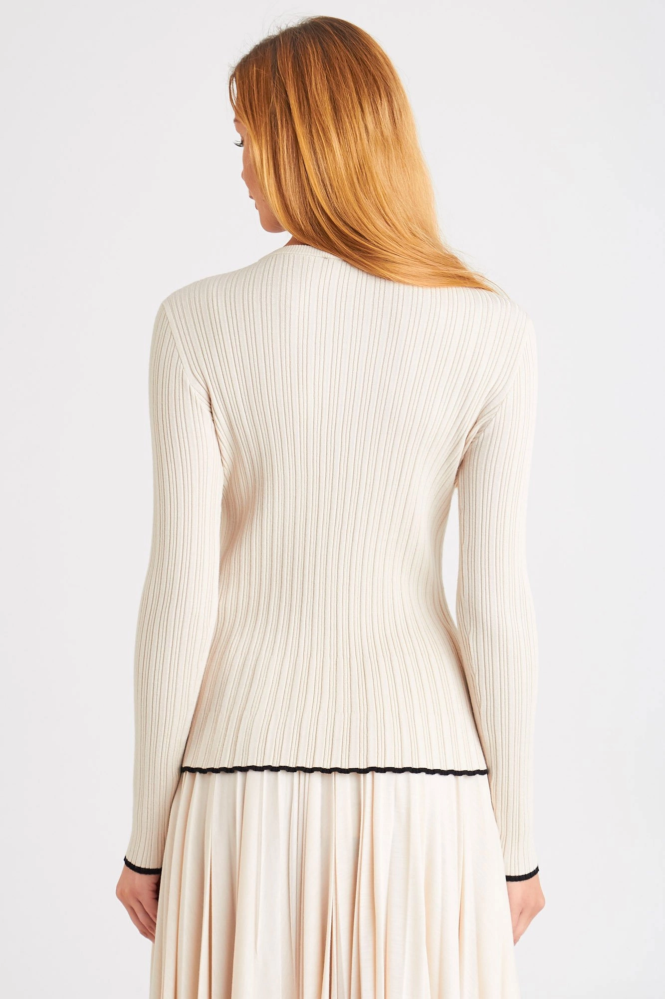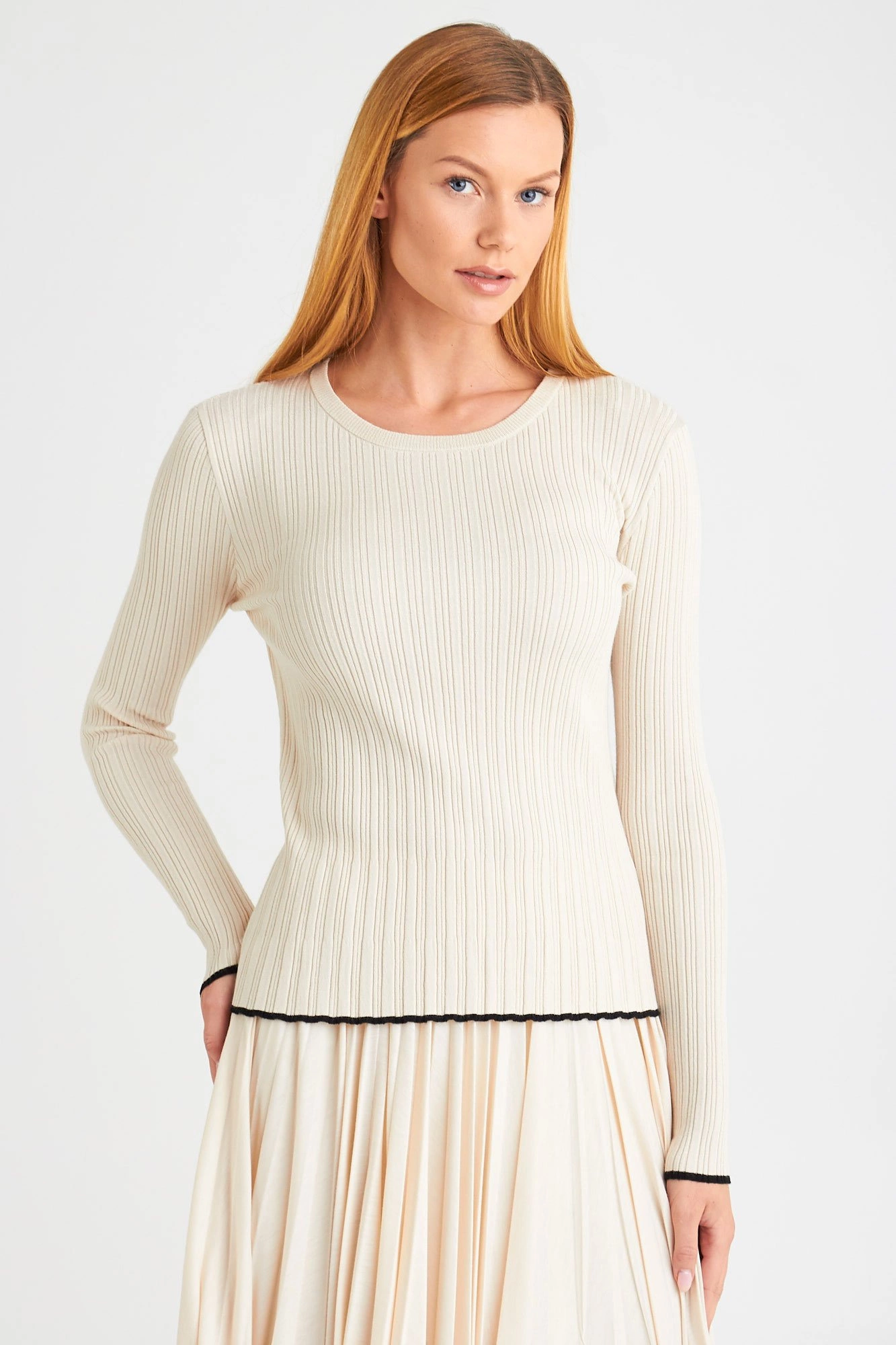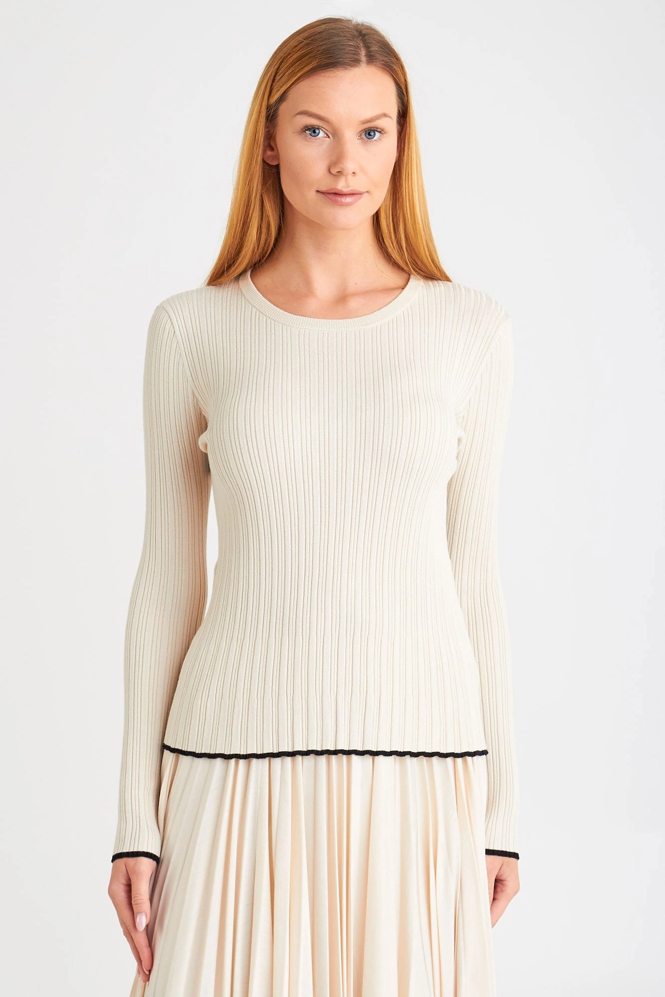 Sweter w kolorze kości słoniowej o dopasowanym kroju. Na całości prążkowany. Dekolt typu o-neck wykończony ściągaczem. U dołu i na rękawach ozdobna, czarna lamówka. Wykonany z wysokiej jakości materiałów. Miękki, komfortowy i lekko elastyczny.