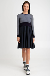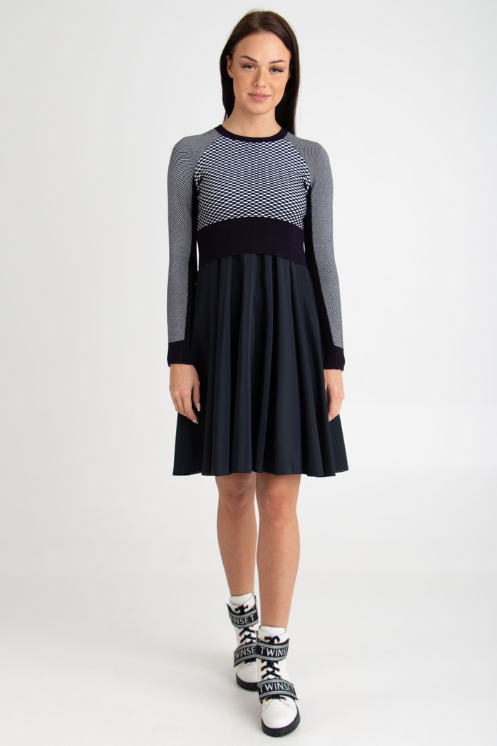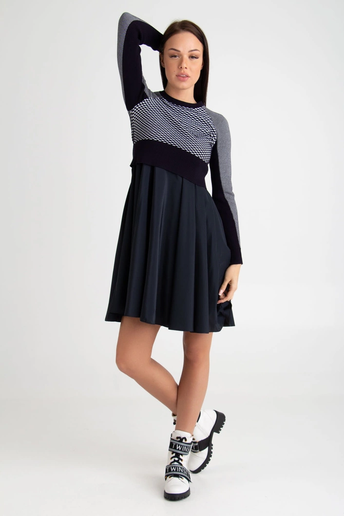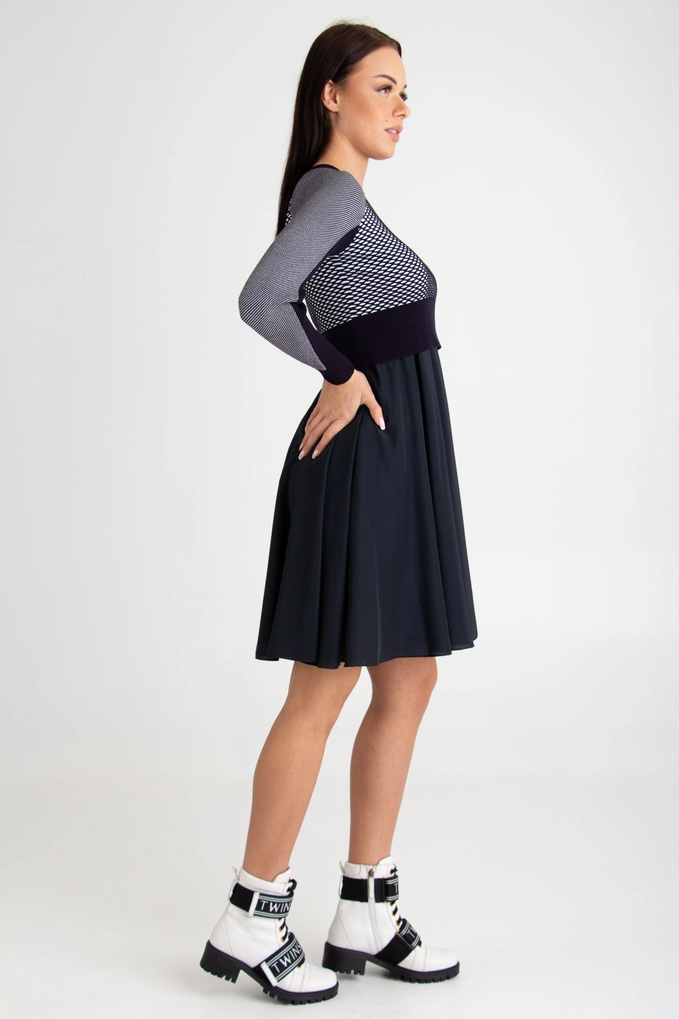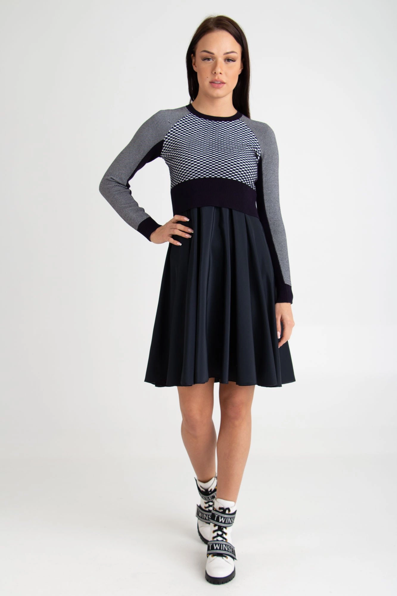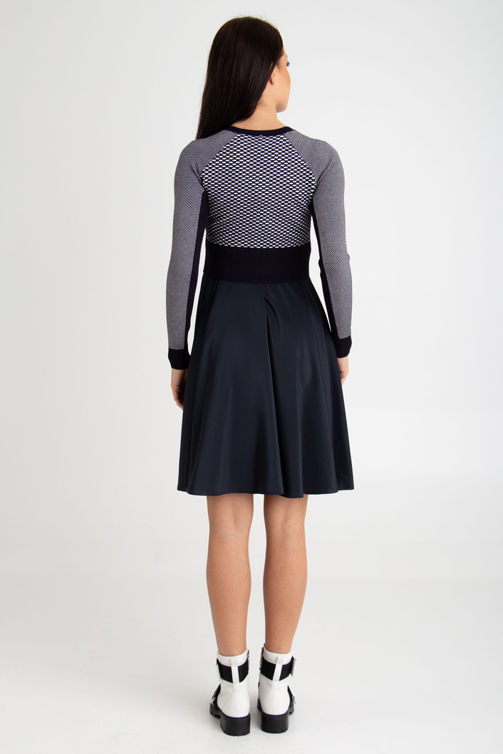 Granatowo- biała sukienka o rozkloszowanym fasonie. Dekolt typu o-neck, wykończony ściągaczem. Góra we wzór, wykonana z biało-granatowej dzianiny. Dół wykonany z innego typu, gładkiego materiału. Z tyłu, na wysokości karku niebieski kryształek, charakterystyczny dla marki. Długość midi. Sukienka wykonana z najwyższej jakości materiałów. Miękka, wygodna i elastyczna.