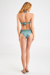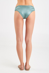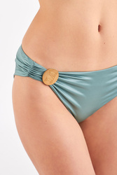 Turkusowy dół od bikini. Mocniej wykrojony na biodrach. Niski stan. Z przodu ozdobne marszczenia i doszyta złota aplikacja z nazwą marki. Stylowy, kobiecy i wygodny. Wykonany z wysokiej jakości, szybkoschnącej tkaniny.